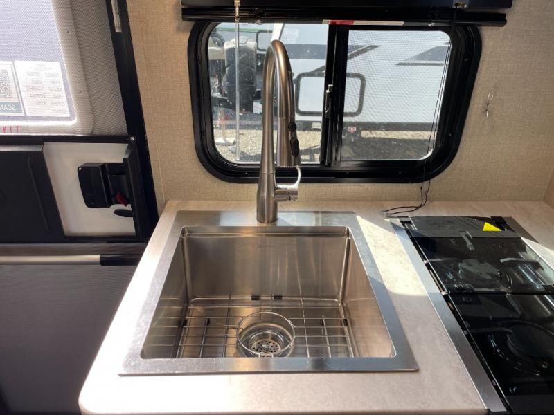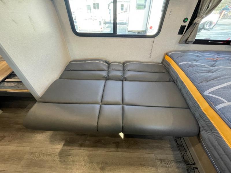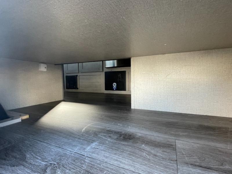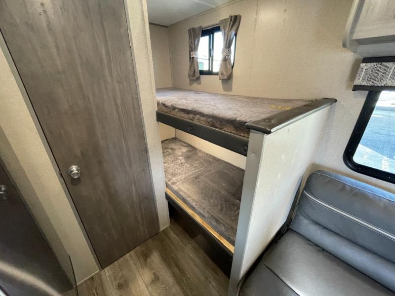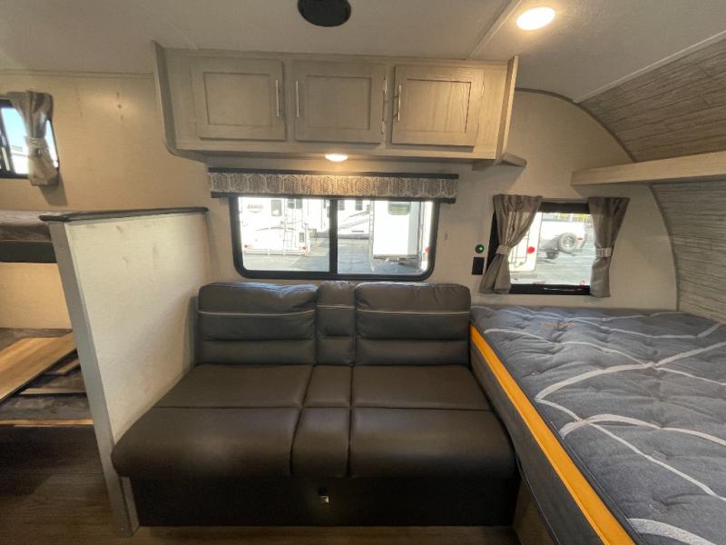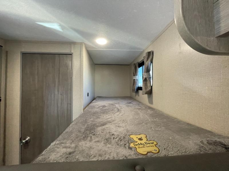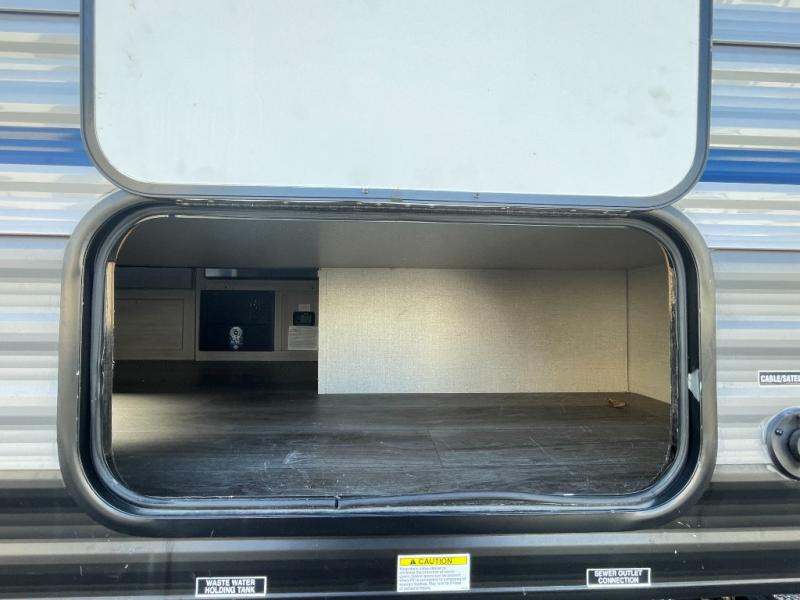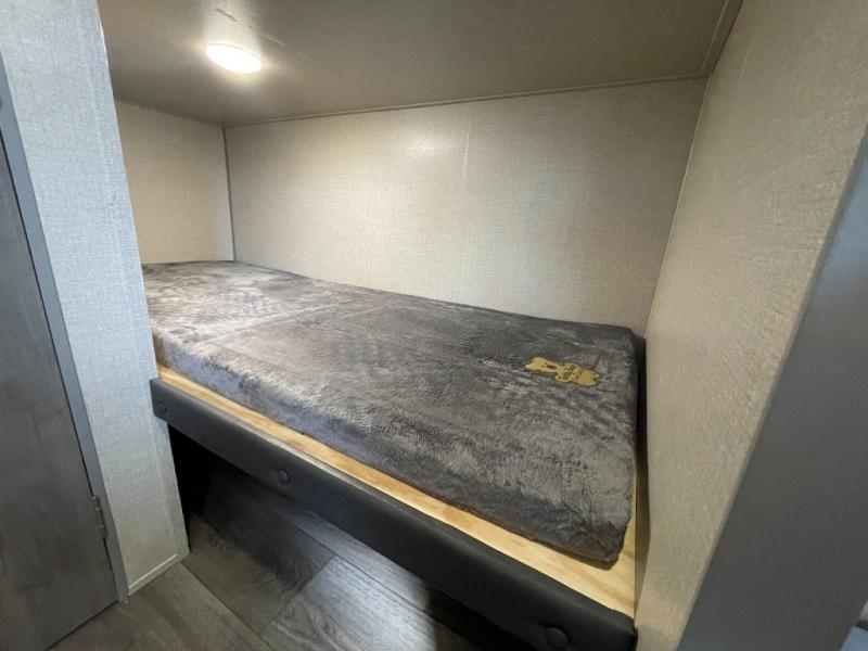 This travel trailers is perfect for a young family. You can easily sleep four or more with the rear set of bunk beds and queen bed up front. There is also a 60" jiffy sofa for inside down-time, as well as complete kitchen and bath amenities so you can cook and stay clean while traveling. The rear corner bath features a toilet and 36" x 30" shower, and it's conveniently located next to the bunk beds which is great for little ones at night. Cooking inside will be easy with a two-burner cooktop and single sink, plus there is also a microwave oven for snacks and things that you can easily warm up. If you plan to spend most of your time outdoors, you will find plenty of storage space in the front pass-through compartment and beneath the bunks in back for outdoor toys and gear. There is also plenty of storage inside as well.
