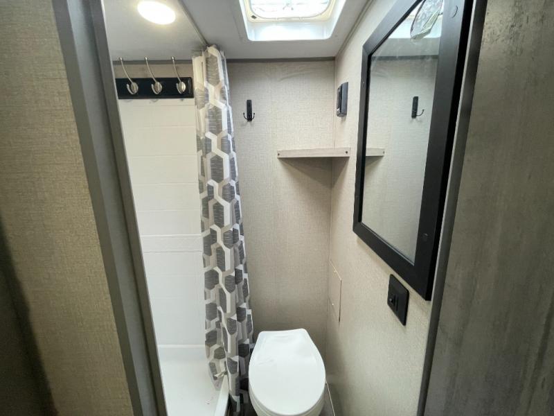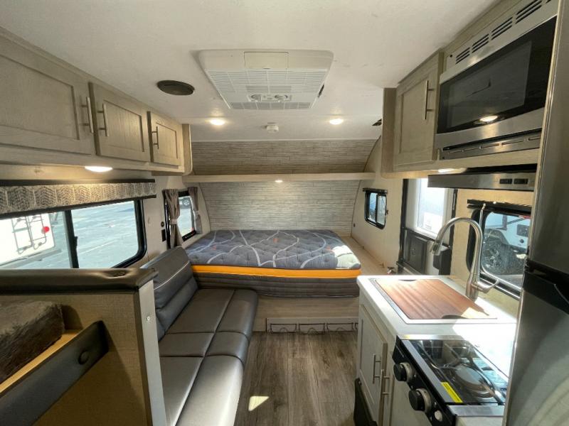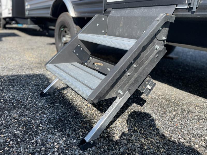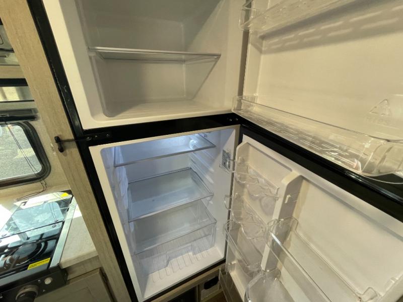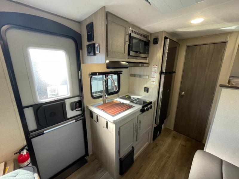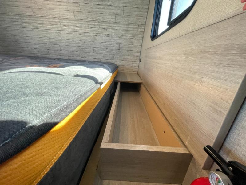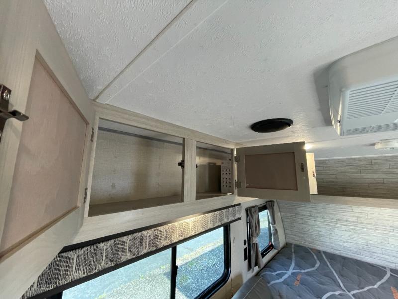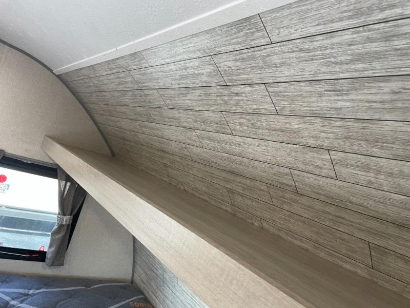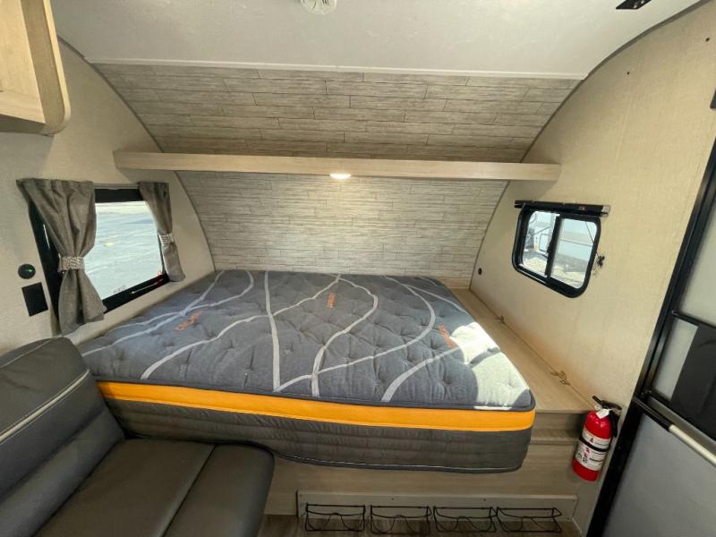 This travel trailers is perfect for a young family. You can easily sleep four or more with the rear set of bunk beds and queen bed up front. There is also a 60" jiffy sofa for inside down-time, as well as complete kitchen and bath amenities so you can cook and stay clean while traveling. The rear corner bath features a toilet and 36" x 30" shower, and it's conveniently located next to the bunk beds which is great for little ones at night. Cooking inside will be easy with a two-burner cooktop and single sink, plus there is also a microwave oven for snacks and things that you can easily warm up. If you plan to spend most of your time outdoors, you will find plenty of storage space in the front pass-through compartment and beneath the bunks in back for outdoor toys and gear. There is also plenty of storage inside as well.