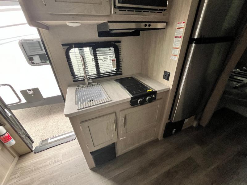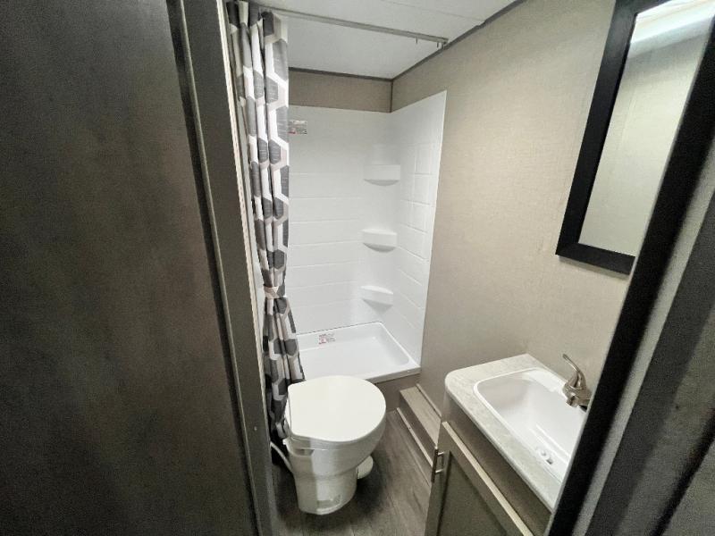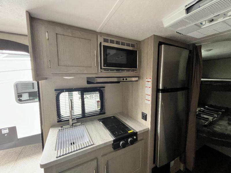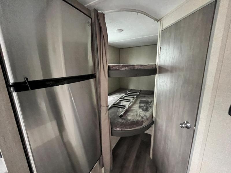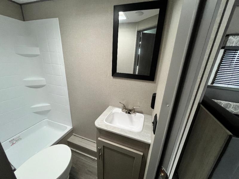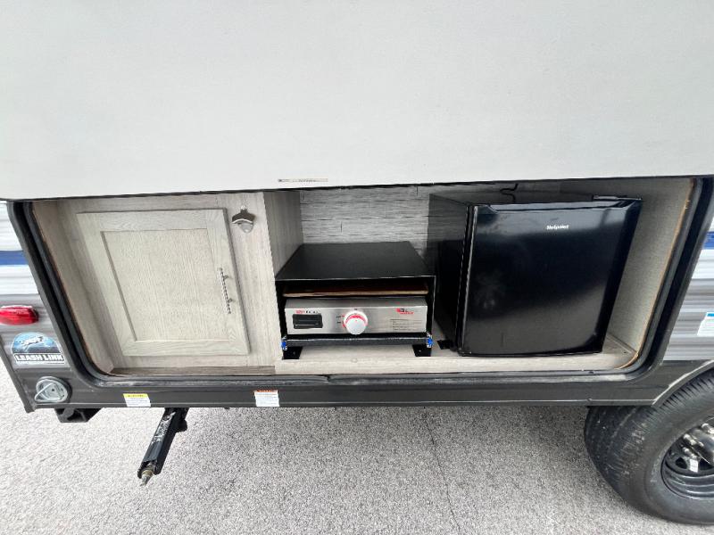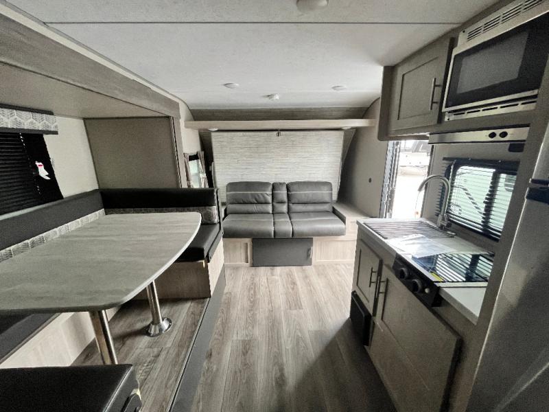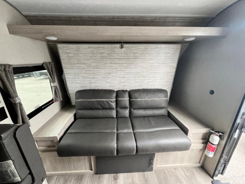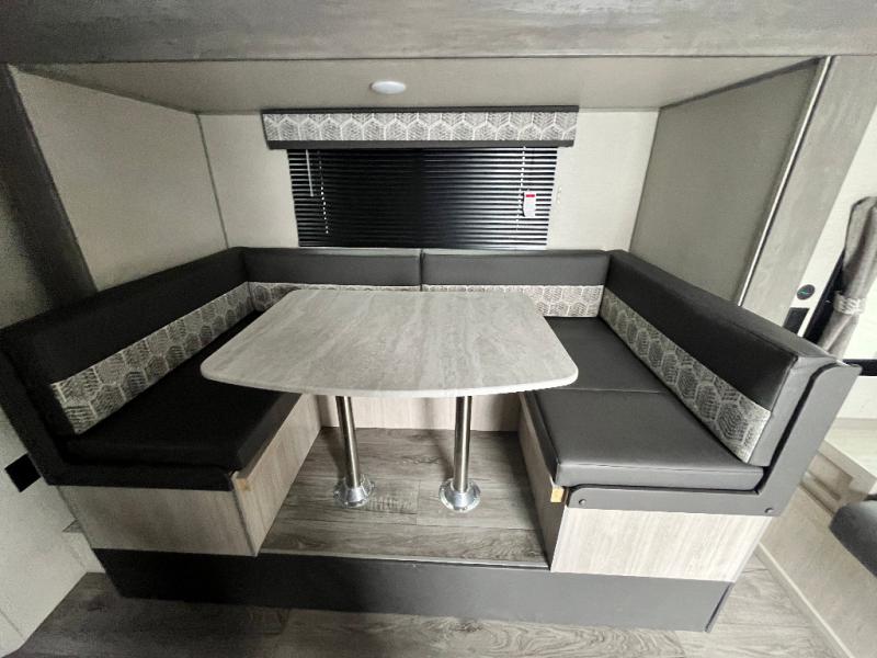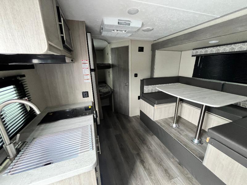 This trailer is easy to tow, store, and maneuver at campgrounds into parking spots! After a day of exploring, everyone can enjoy napping or falling asleep on the double-size bunks next to the full bathroom, or on the Murphy bed up front. This front multi-use space offers both a living area and bedroom depending on the time of day. The U-shaped dinette gives everyone a place to dine inside, or you can head outside to grab your camping chairs from the pass-through storage and dine under the 15' power awning with your choice of LED color. There is much more to enjoy inside and outside, and you might like to add the optional camper kitchen as well.