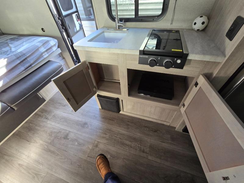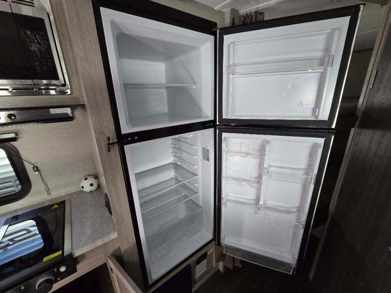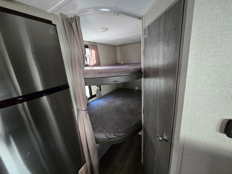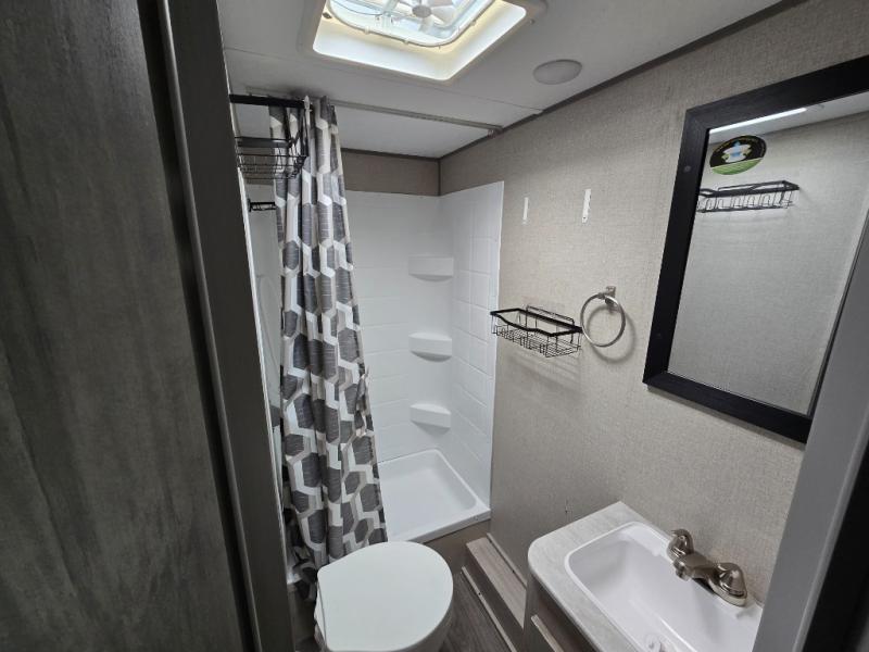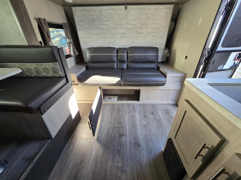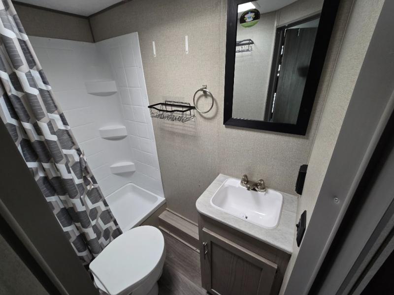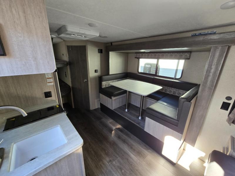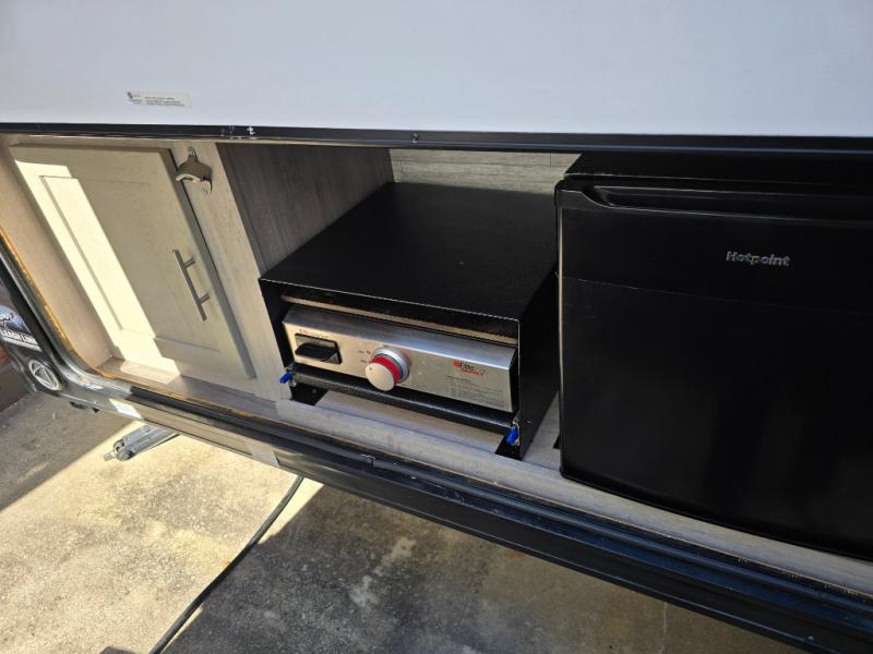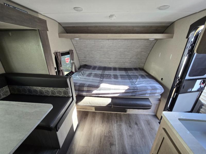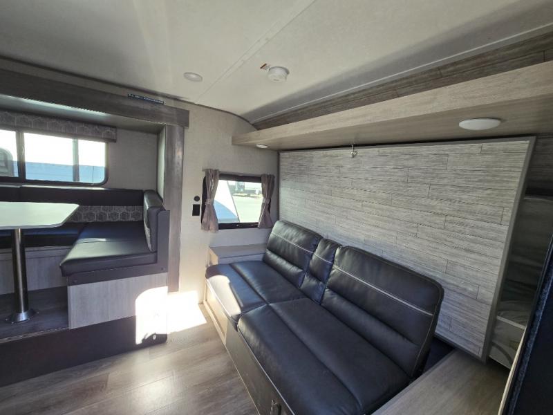 This trailer is easy to tow, store, and maneuver at campgrounds into parking spots! After a day of exploring, everyone can enjoy napping or falling asleep on the double-size bunks next to the full bathroom, or on the Murphy bed up front. This front multi-use space offers both a living area and bedroom depending on the time of day. The U-shaped dinette gives everyone a place to dine inside, or you can head outside to grab your camping chairs from the pass-through storage and dine under the 15' power awning with your choice of LED color. There is much more to enjoy inside and outside, and you might like to add the optional camper kitchen as well.
