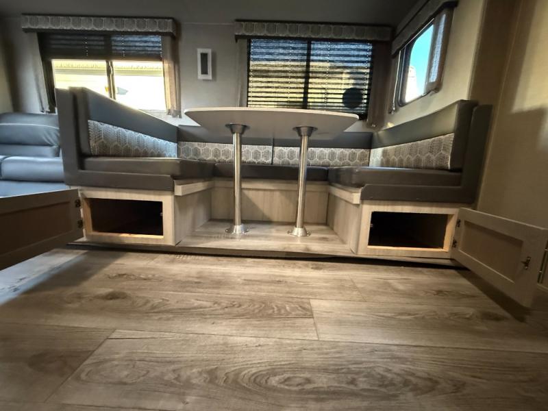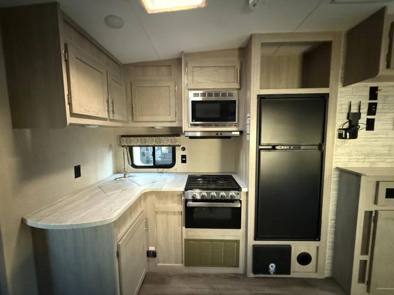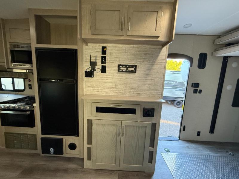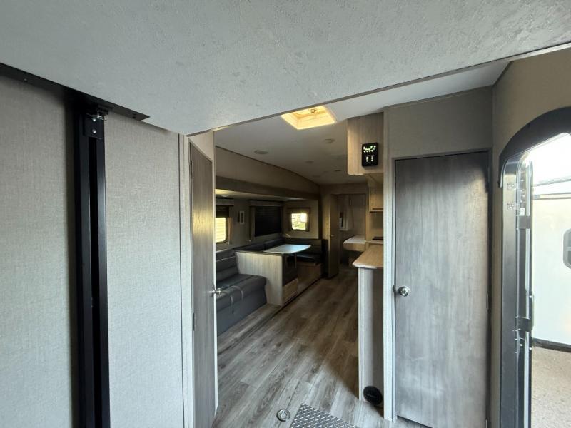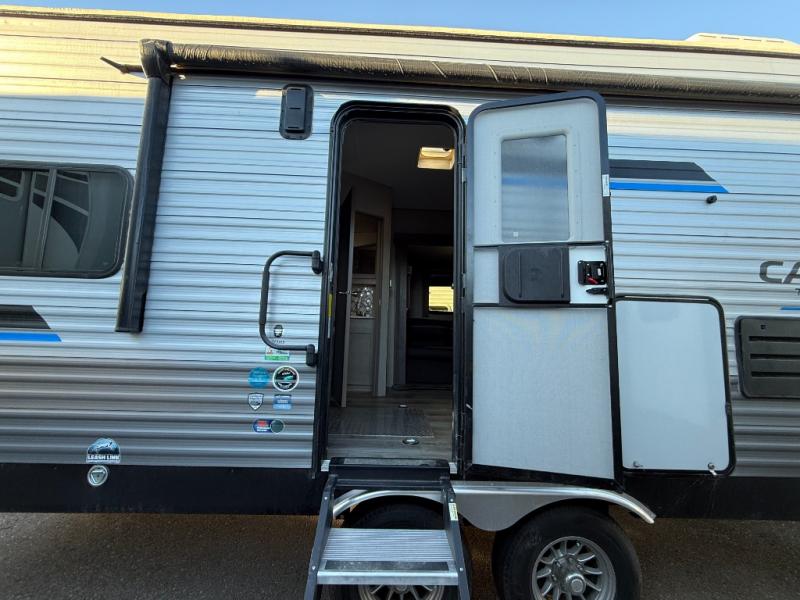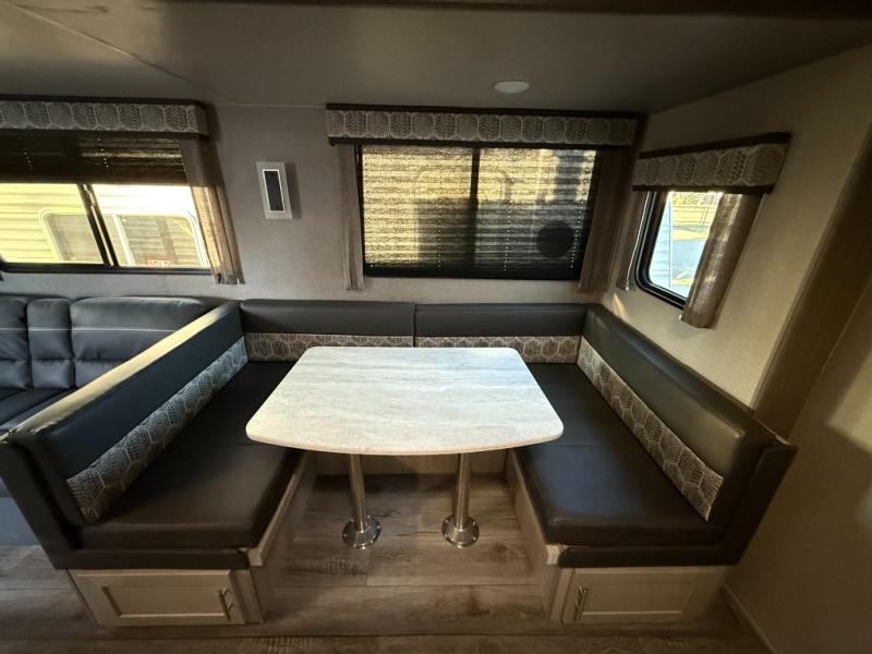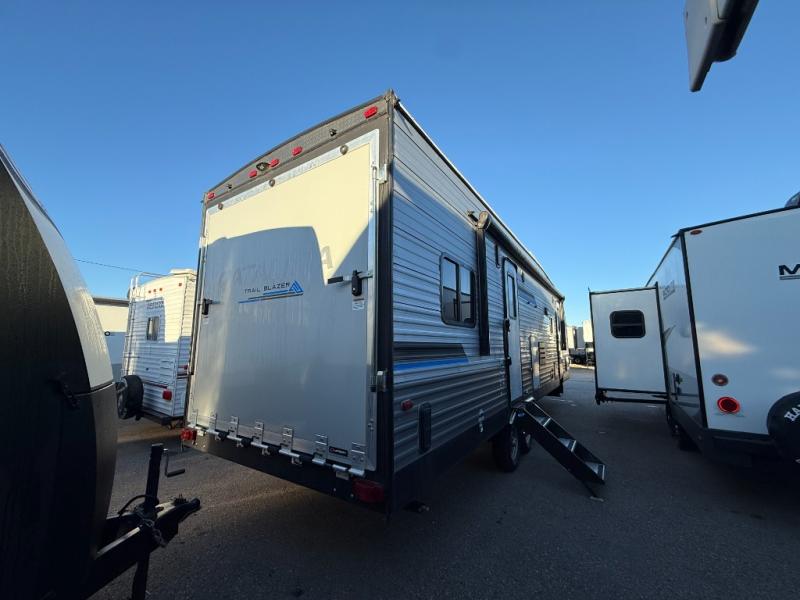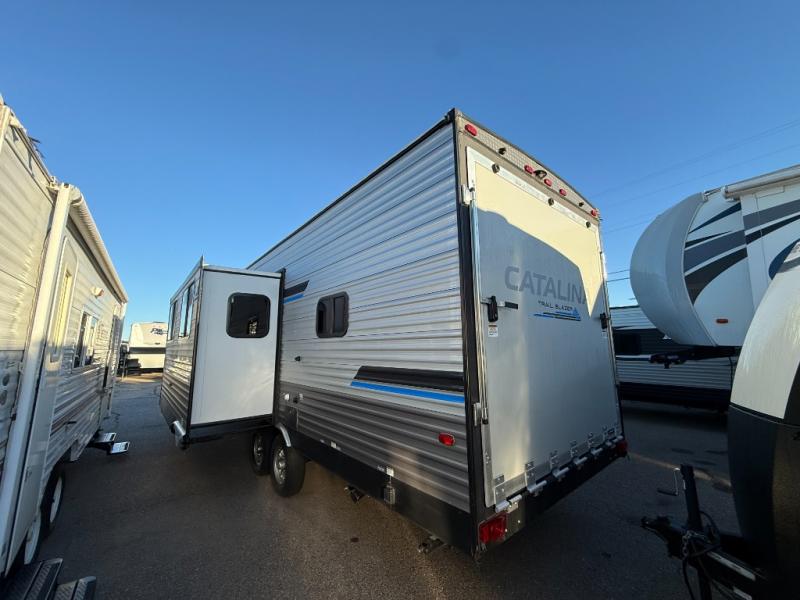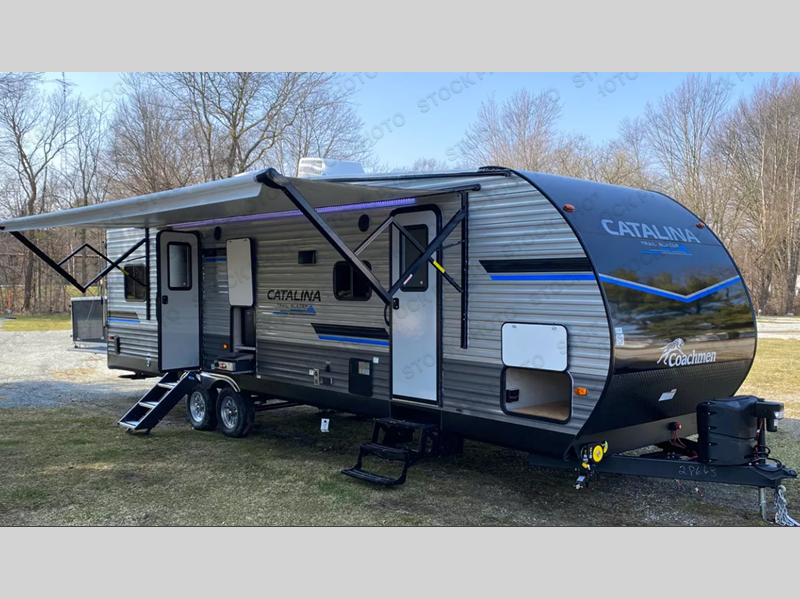 The best looking, most affordable toy hauler is found in the Catalina Trailer Blazer by Coachmen. Each one is constructed with a seamless alpha roof membrane, an enclosed and fully sealed underbelly, and a cambered structural steel I-beam frame for added support. There is a rear loading cargo door with a 3,000 lb. capacity, a black out screen wall with a zip walk-thru and windows, plus 500 lb. tie-downs to secure your toys. You'll love the interior with its Congoleum woodplank linoleum flooring, pleated night shades, and LED interior lighting. Head outside to find an electric awning with multicolored LED lights and a remote, a 15' Toy Loc cable, a "Leash Link" quick hookup D-ring for pets, and upgraded aluminum wheels. The Catalina Trail Blazer also comes with RV-LINK 4G LTE connectivity with a WiFi booster and extender, a JBL Aura Cube media center, plus premium JBL interior speakers to ensure you'll never go bored!
