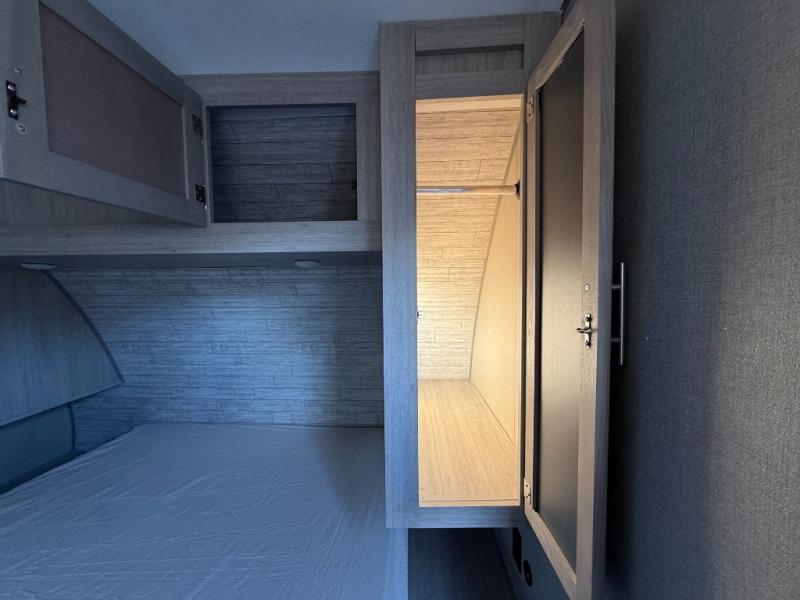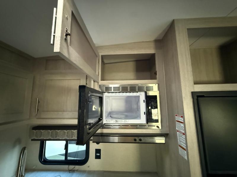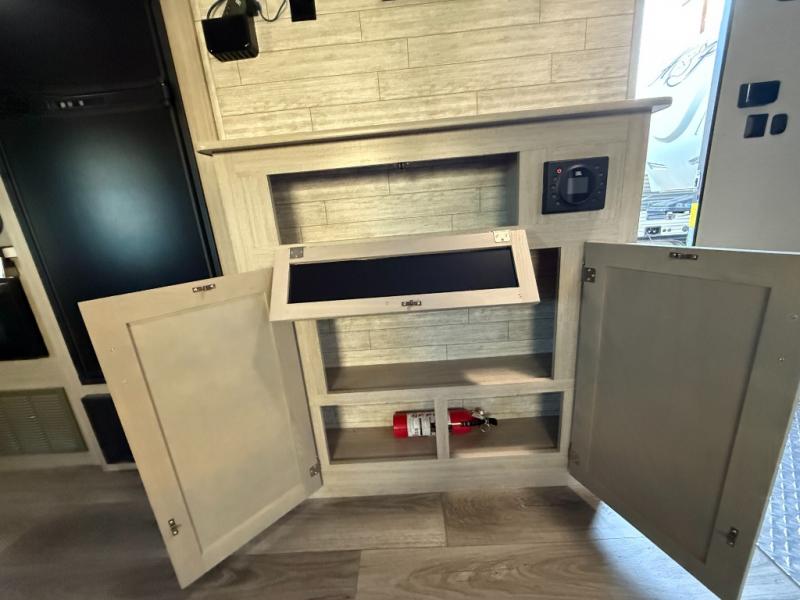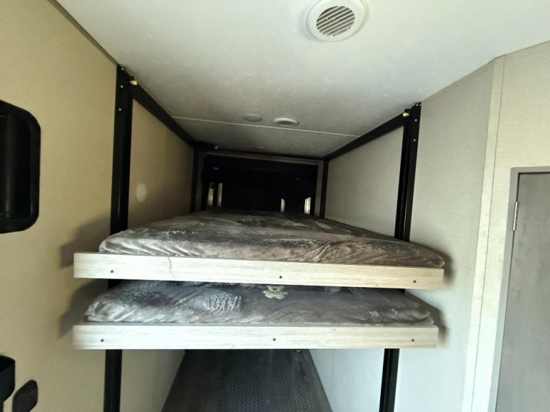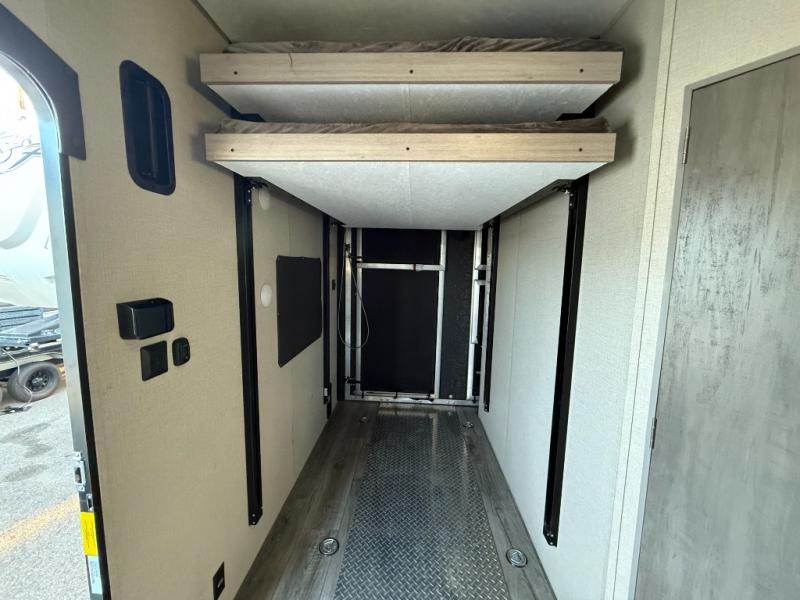This toy hauler has lots of room for toys and guests! You will love the retreat of the front private queen bedroom with dual wardrobes and its own entry door. Additional guests can sleep in the double-size bunks with an electric trac bed lift in the cargo area, also with its own entry door. A rear corner bath makes efficient use of space and includes a 24" x 32" shower and a medicine cabinet. The main living area features an entertainment center that can be upgraded with an optional fireplace for maximum coziness. Relax on the sofa or the U-shaped dinette. You'll also appreciate the kitchen with its L-shaped counter, corner dual sinks, microwave, GE stainless 10.7 cu. ft. 12V refrigerator, and three-burner range. Or step outside and use the camper kitchen with a griddle and mini refrigerator!