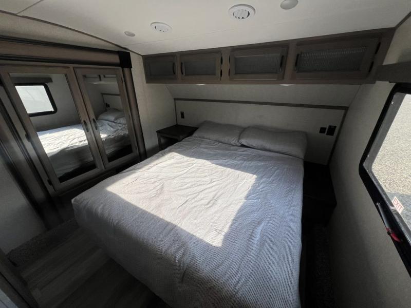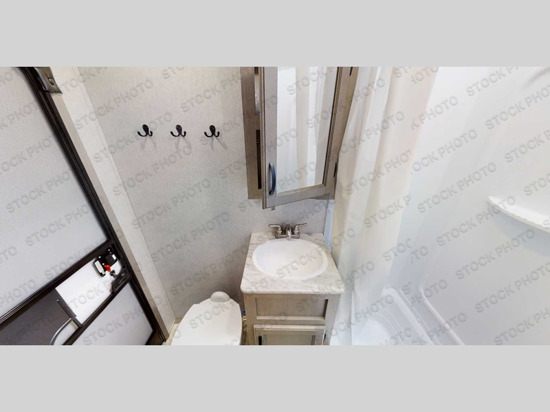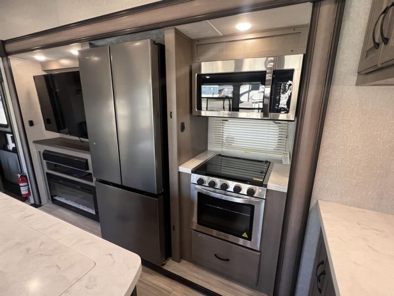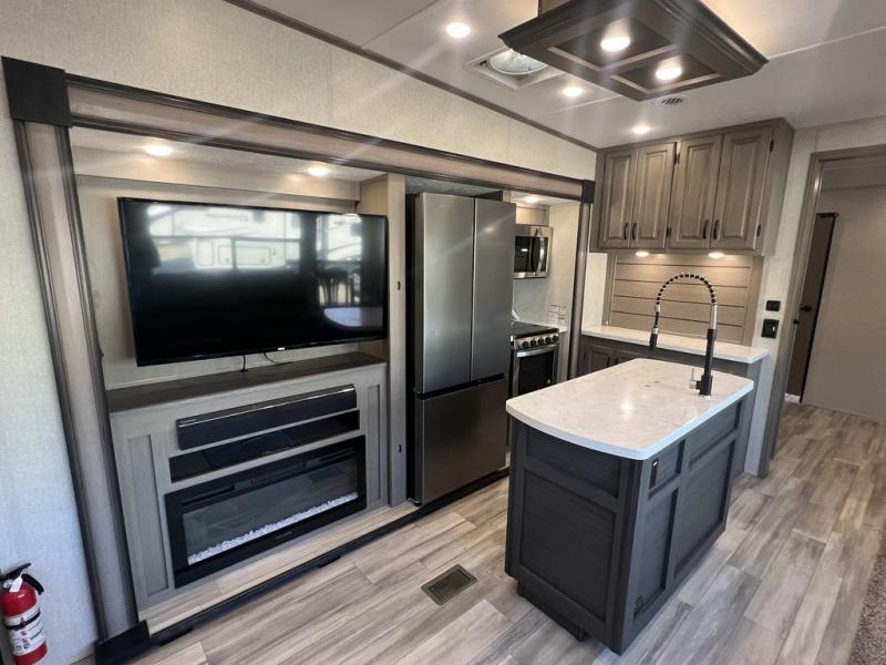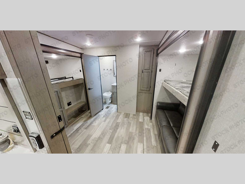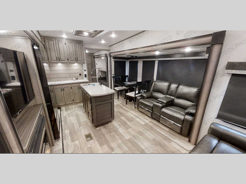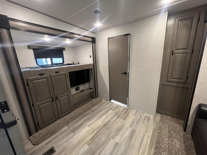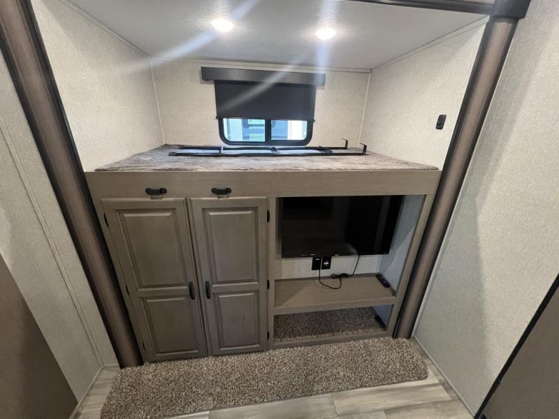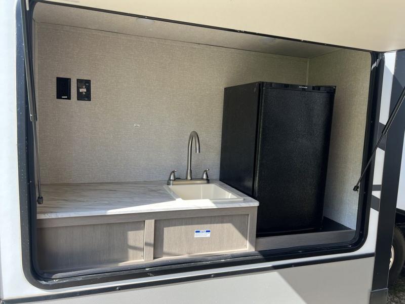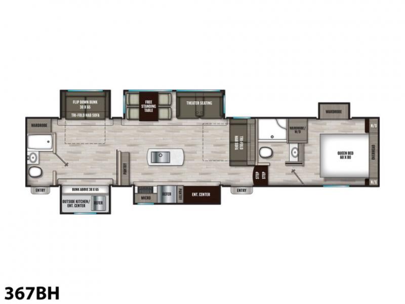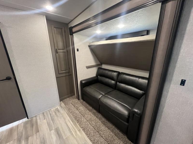 Camping with a large group of friends or family is easier than ever in this roomy fifth wheel for seven to eight. There are two full baths, with your guests having their own bath with its own exterior entry door in in the bunkhouse; how convenient! The chef of your group will find all they need in the interior kitchen, or they can cook outdoor on the outside kitchen. Inside, there is comfortable seating spaces on the sofa, the theatre seating, and the free-standing table, plus you can add the optional 50" LED TV to the entertainment center for even more fun. Having your own bedroom to retreat to each night will be much appreciated. There is a queen bed, a wardrobe slide out, dual nightstands, and even washer and dryer prep!