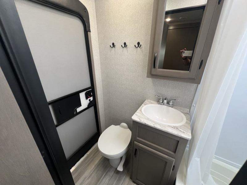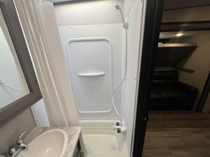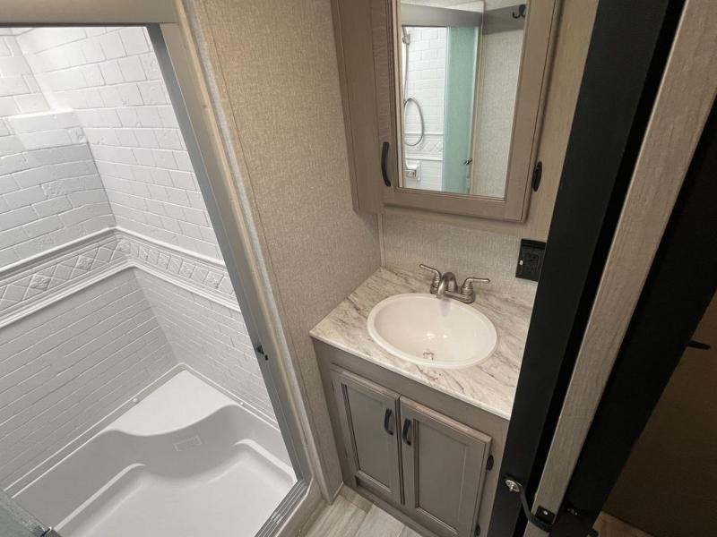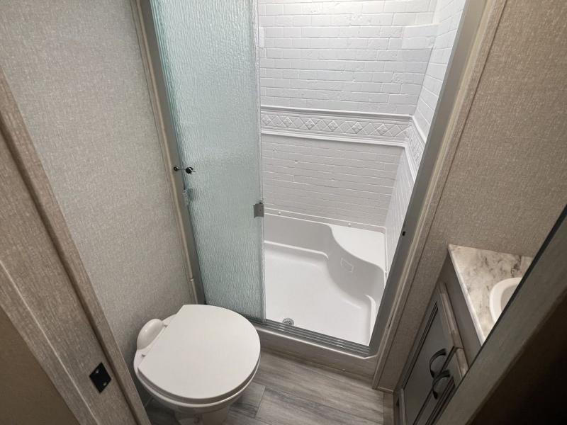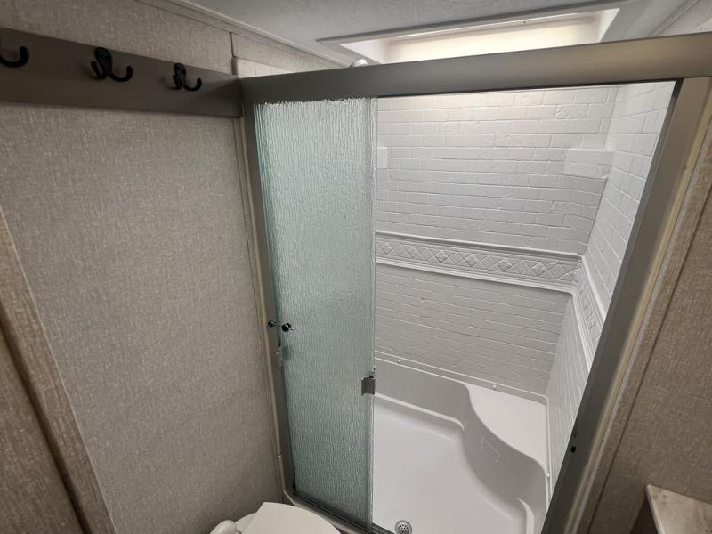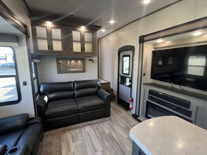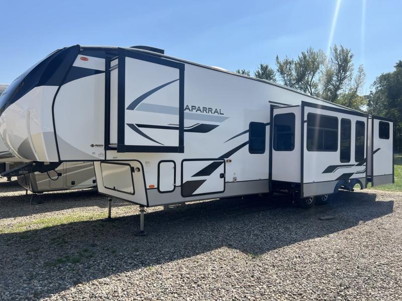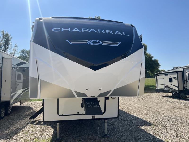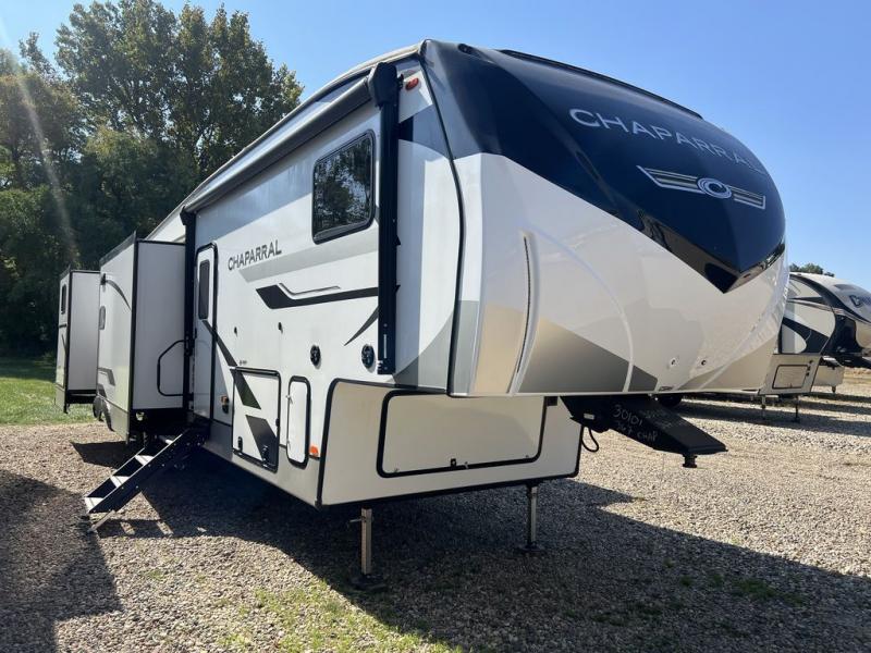 Each Chaparral mid-profile fifth wheel by Coachmen is designed with residential features, loads of storage space, and roomy bedroom suites to make you feel right at home. The durable construction means you can enjoy your RV for years to come. There's dual-sided Azdel composite sidewall panels, Weather Shield+ technology, and Tri-Tex powder coated frame technology that will allow you to camp year around. Each model includes a Winegard Air 360 HDTV/radio dome antenna and an AM/FM/CD/DVD player with Bluetooth to keep your entertained, plus roller night shades and a modern electric fireplace to make your space cozy. There is also a large transom window in the kitchen, a modern high-rise faucet, LED motion sensor lights in the bathroom, plus a full-size shower with glass doors and a seat. Now that's what I call luxury! Choose a Chaparral fifth wheel today!