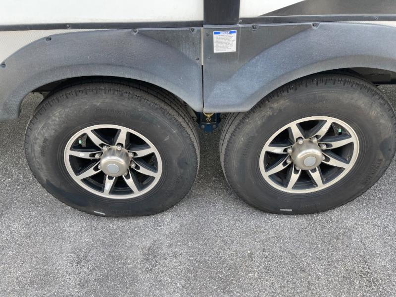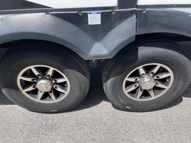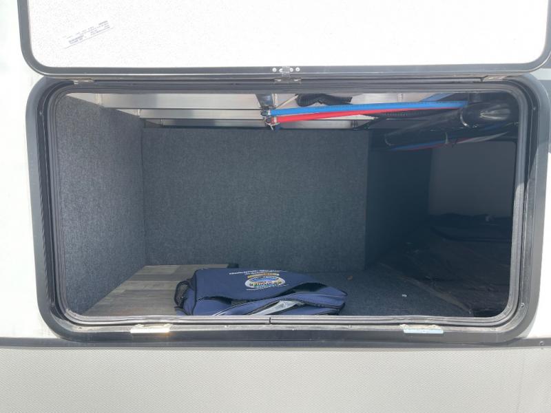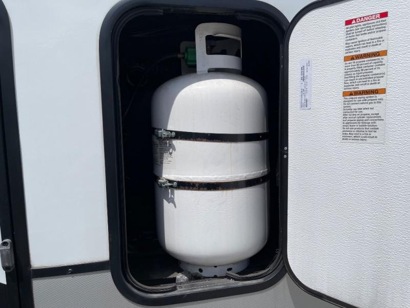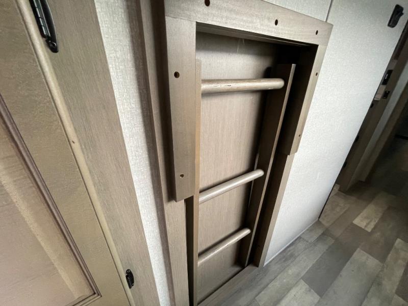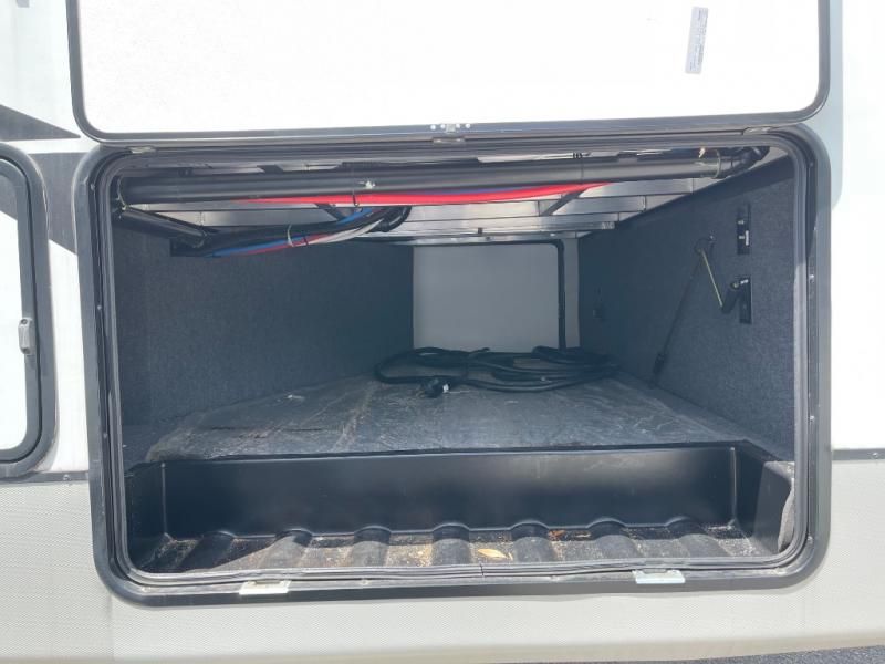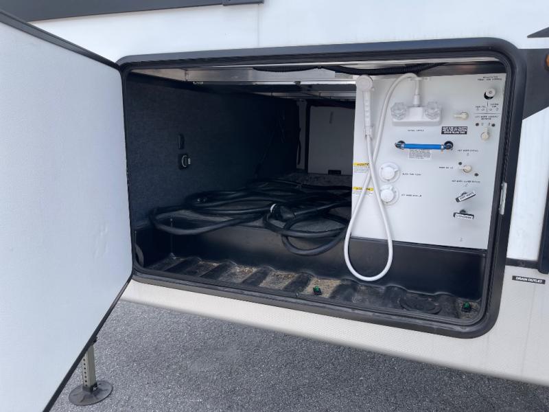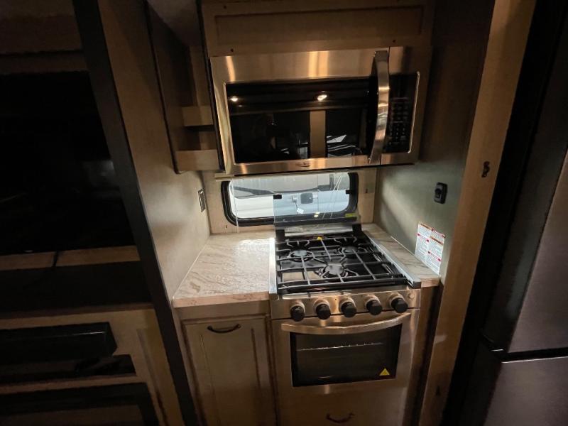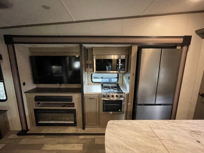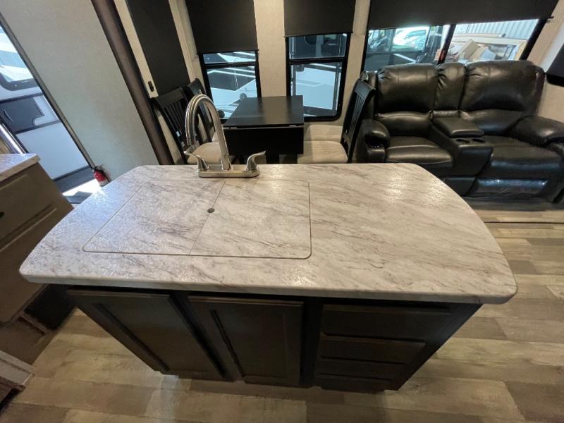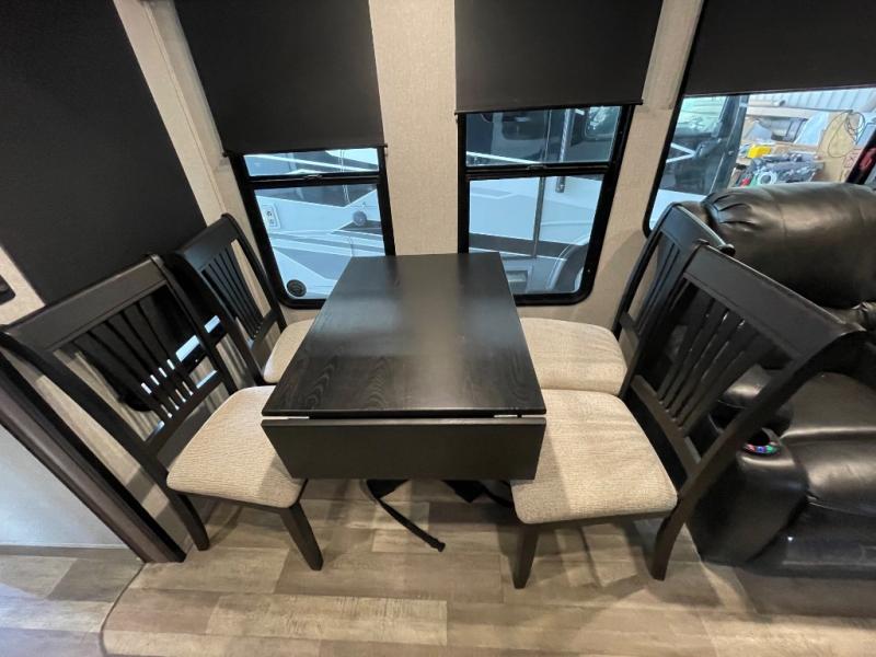 Spend your days at the lake and your evenings relaxing in this fifth wheel with four slide outs for tons of space. Your guests can claim the middle den to themselves that includes a tri-fold hide-a-bed sofa with a removable table, a wardrobe for their things, plus a loft above for the little ones. The chef of your crew will appreciate the kitchen island for extra counter space, and there are stainless steel appliances for added luxury. After dinner is cleaned up, relax on the theatre seating or on the rear tri-fold hide-a-bed sofa, or you may just want to be outside with the power to enjoy the evening air. This model also includes a front private bedroom with a queen bed slide out, a dresser, plus a large wardrobe with washer and dryer prep. You may just decide to go full-time in this fifth wheel!