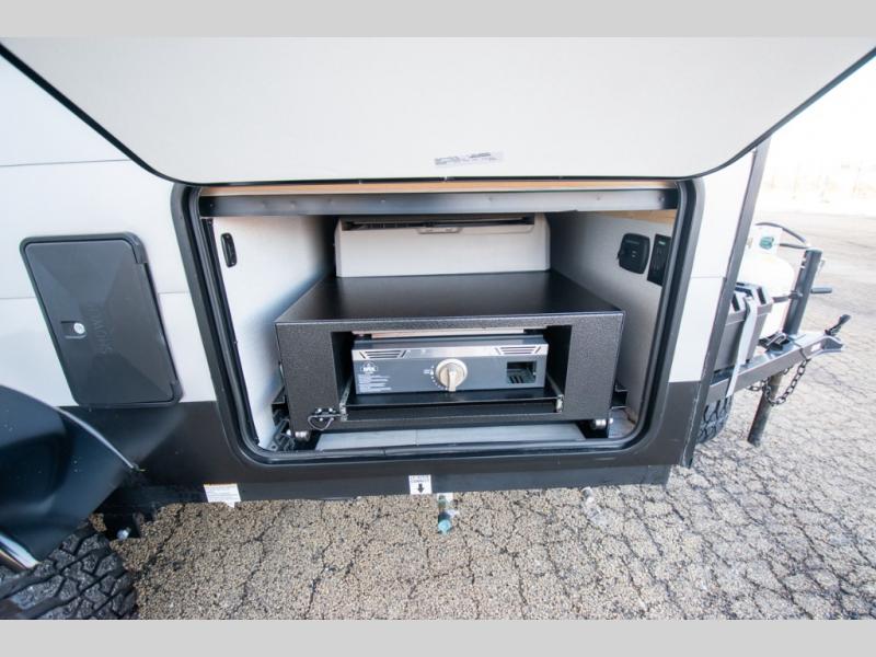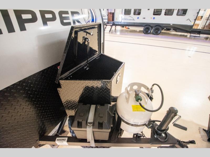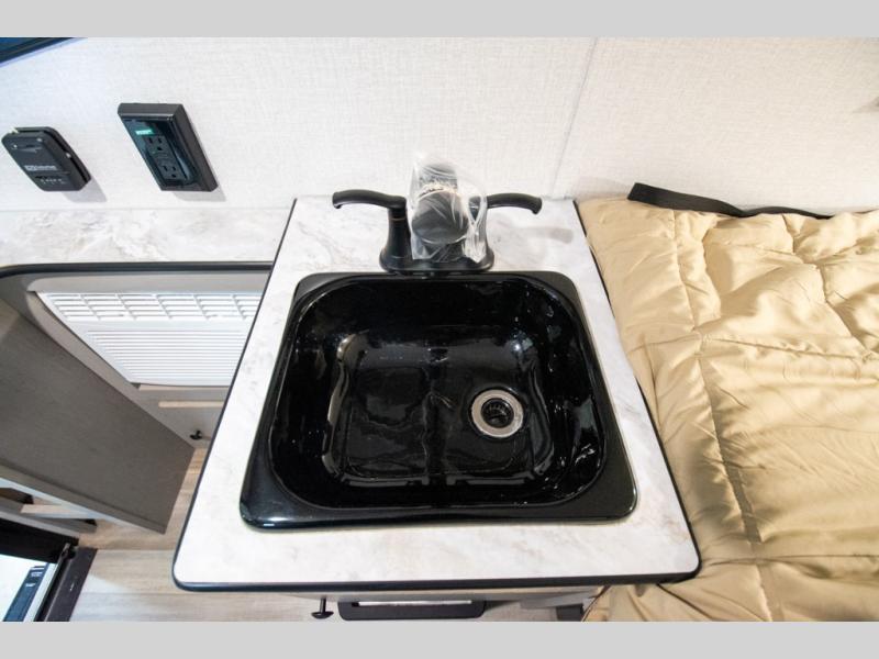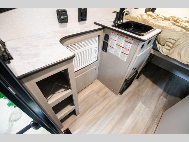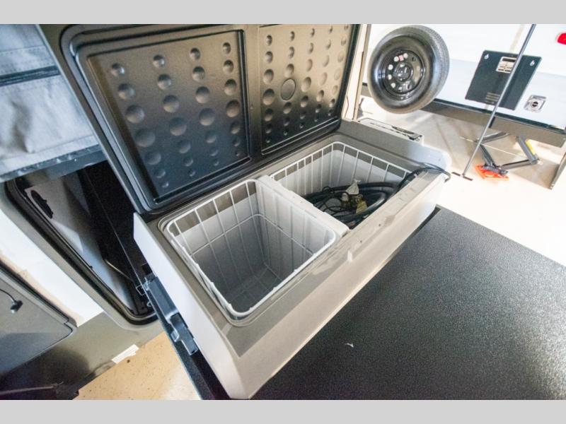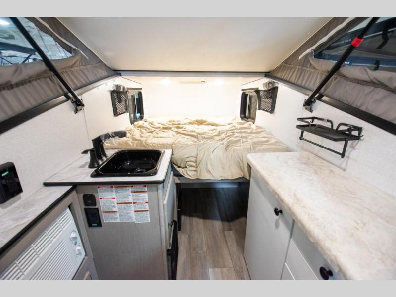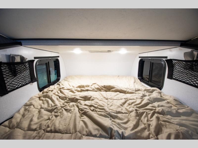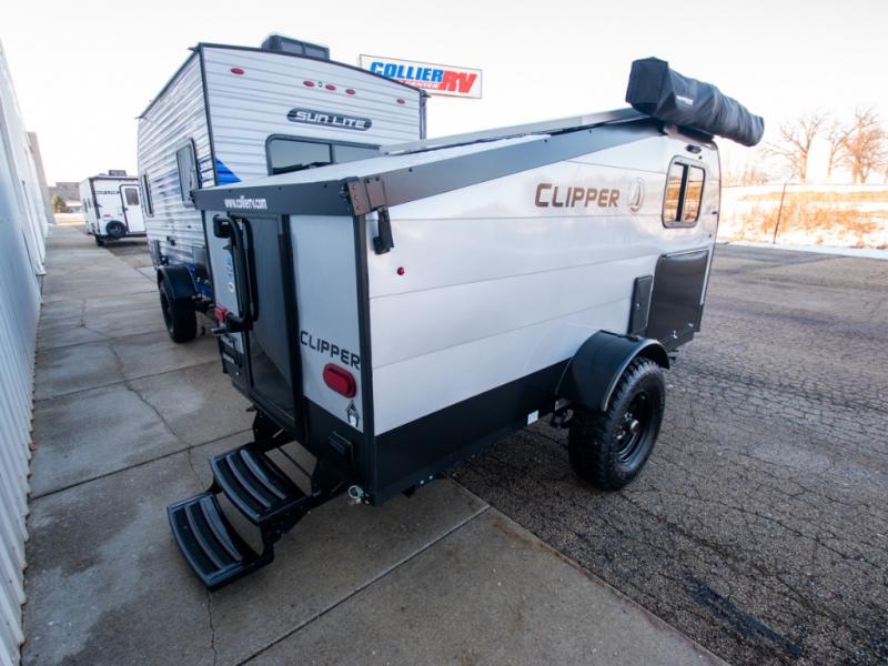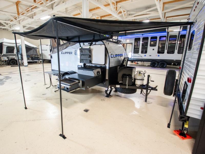 You and a friend, spouse, or partner will enjoy exploring nature with this cozy Clipper Camping Trailer in tow. The rear entry door provides access to a 54" x 74" bed for two, plus a counter top and bench seat and sink for washing up. The pull-out camp kitchen with griddle makes cooking simple, and the 12 volt cooler will keep your perishables fresh while traveling. There is even a 20K furnace if the nighttime gets too cool. With the off-road package standard you will appreciate the flipped axle and 15" off-road tires for when you want to head off the beaten path for awhile, and the off-grid solar package will help you with power.