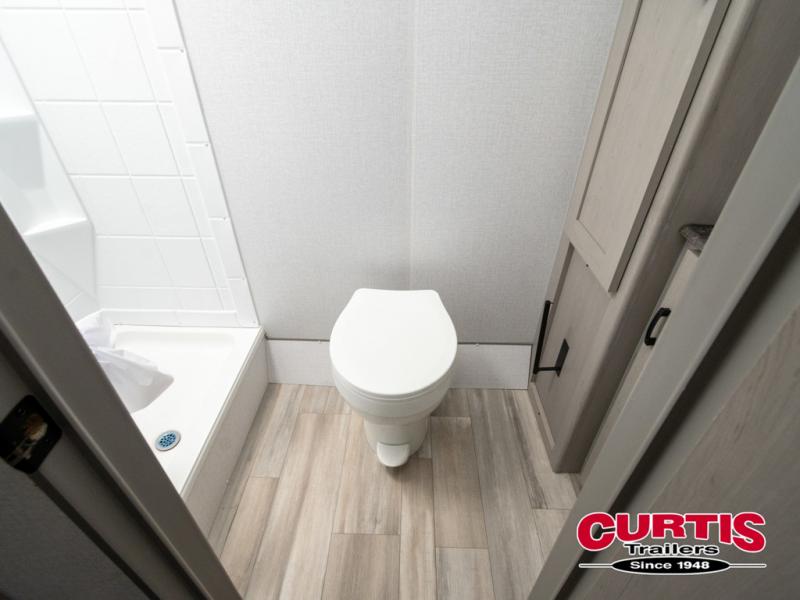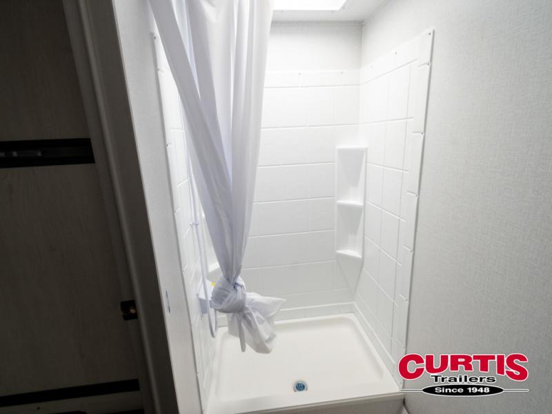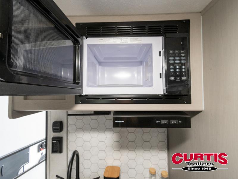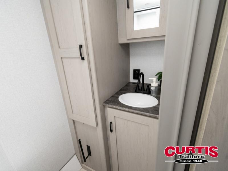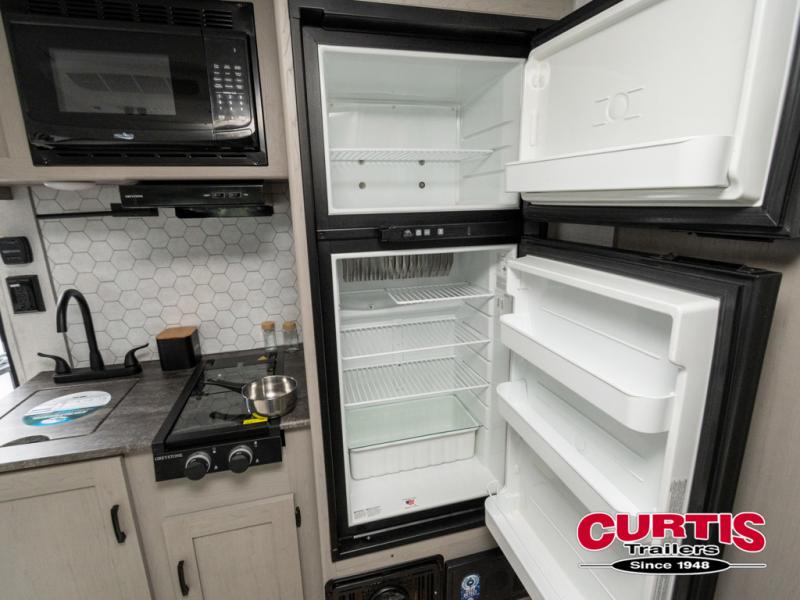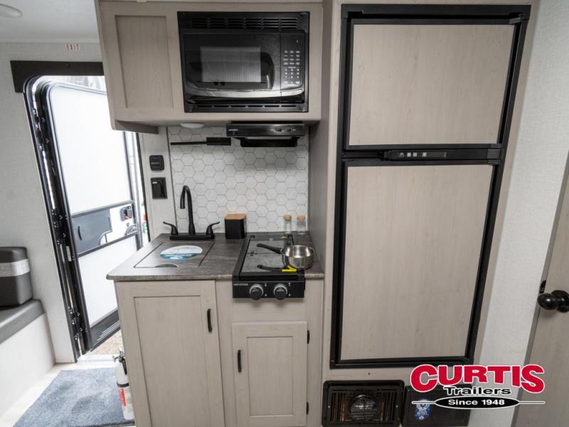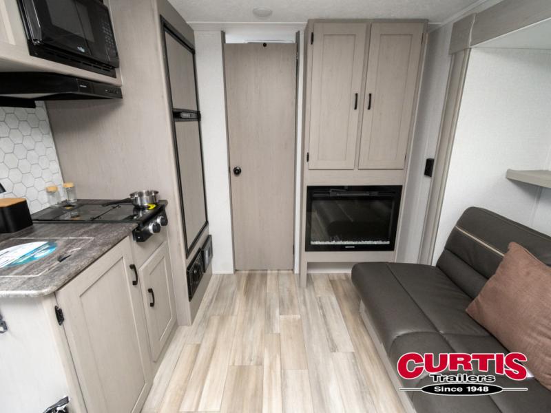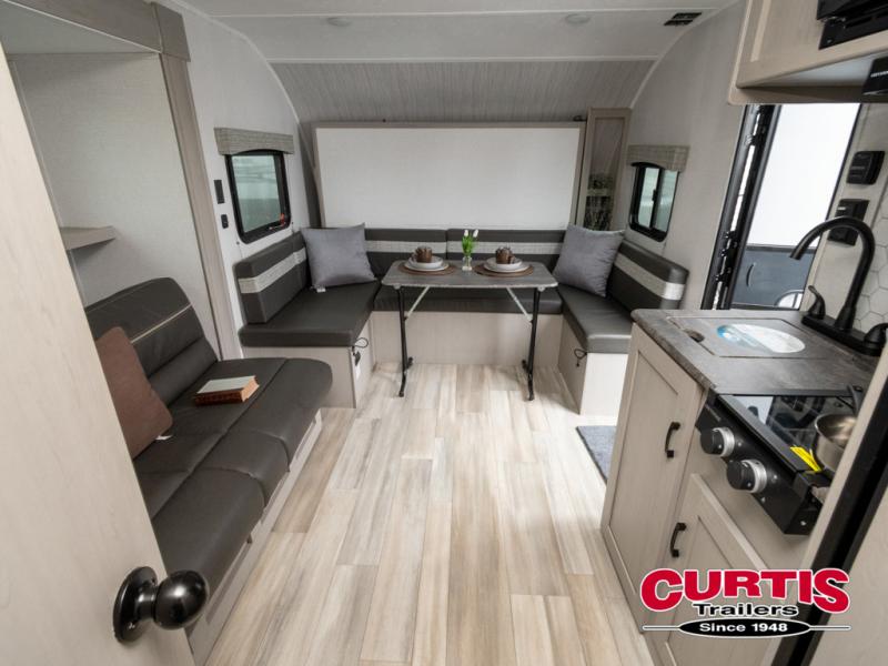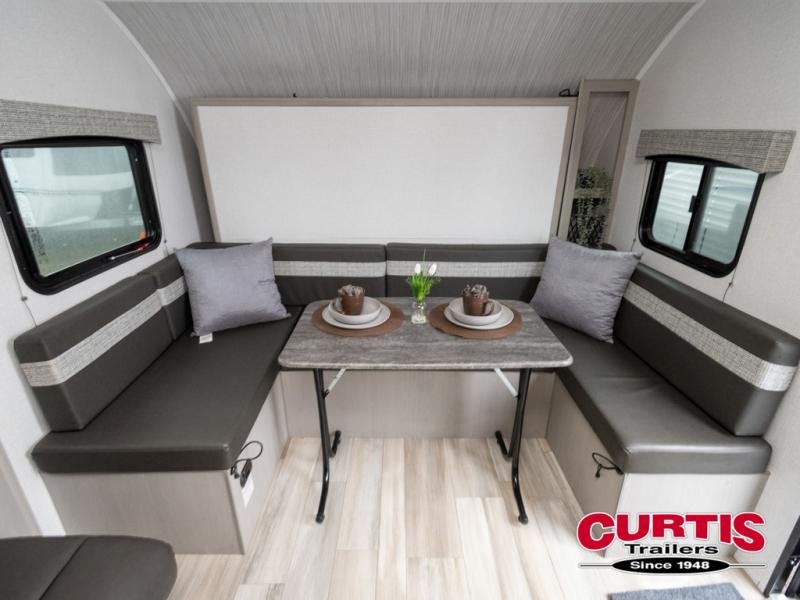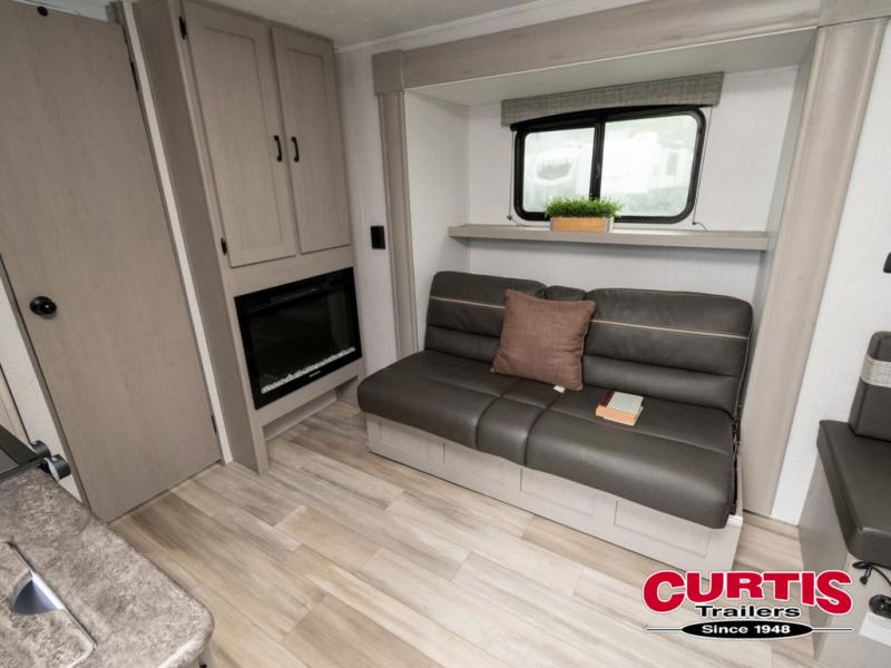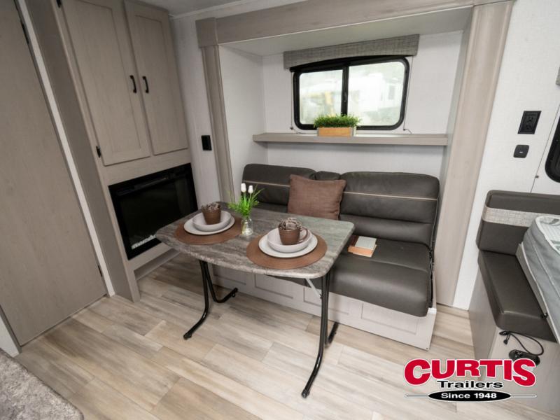 If you are looking for a cozy travel trailer for two with a bit more space without having a long tow length, then this Viking travel trailer is for you! A front Murphy bed that when stored in the closed position reveals a spacious u-shaped dinette that is perfect for entertaining your campground neighbors or friends. An optional fireplace creates a warm and inviting space, and the large rear bath features a spacious shower with skylight, toilet and vanity with sink, as well as space to accommodate your towels and toiletries. The jack knife sofa sofa slide has a place for you to store your suitcases behind it. A two burner cooktop and sink opposite, plus microwave oven overhead, allows you to easily make meals while you camp and there is ample storage in the pantry cabinet above the optional fireplace for your things as well.