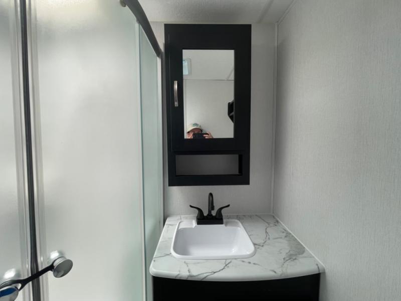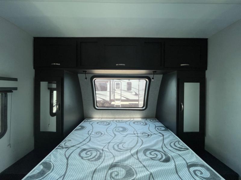 Check out this rear kitchen travel trailer that can sleep three to four each night. The front semi-private bedroom includes a privacy curtain and a queen bed with vaulted under-bed storage for your belongings. The sofa within the large slide out and the booth dinette will provide comfortable seating space, and there is an LED TV for those rainy camp days. This model also includes a three burner cooktop, a microwave oven, and an 8 cu. ft. double door refrigerator for your perishables. And don't forget about the 18' power awning with LED lights!