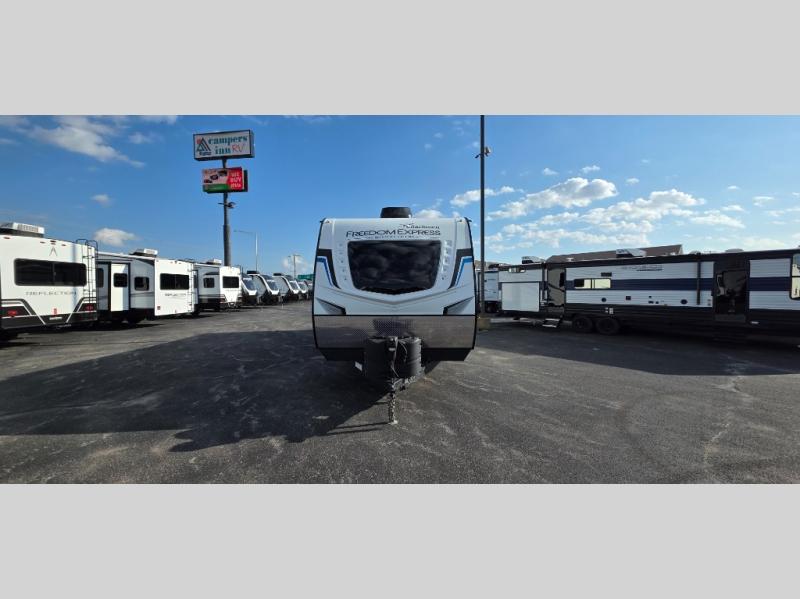 With any Freedom Express Ultra Lite travel trailer by Coachmen you will appreciate quality construction materials, such as vacuum bonded walls with Azdel composite, a 3/4 gel coated fiberglass cap with an automotive glass windshield, and a heated enclosed underbelly. Each model also features Tufflex PVC roofing, front diamond plate, and E-Z Lube axles for smooth towing. You'll find Carefree flooring indoors, as well as night shades, a dual basin American stonecast sink, and hidden hinge cabinetry. The power tongue jack included with the Ultra Lite Express Pack will make set-up a breeze, and each model includes back-up camera prep and they are Freedom solar ready if you plan to go off-grid. Enjoy lightweight camping with a Freedom Express Ultra Lite travel trailer today!