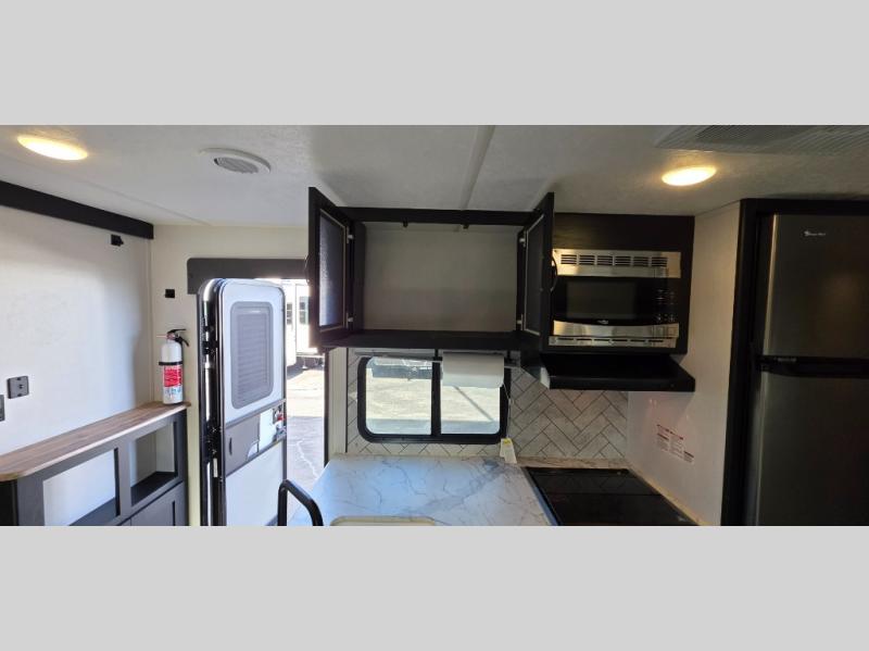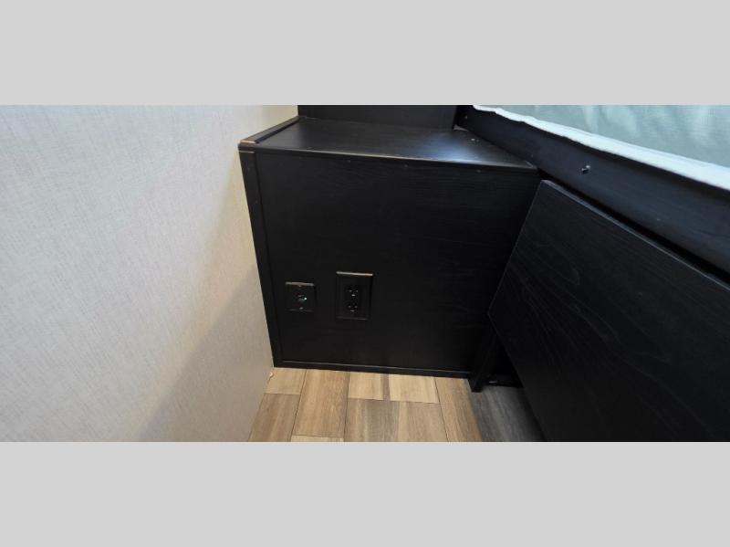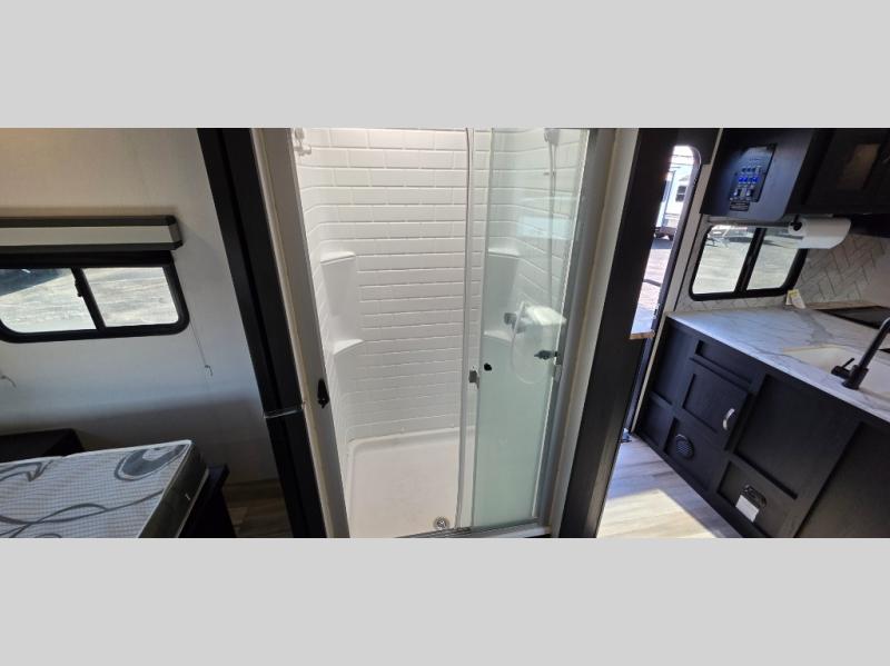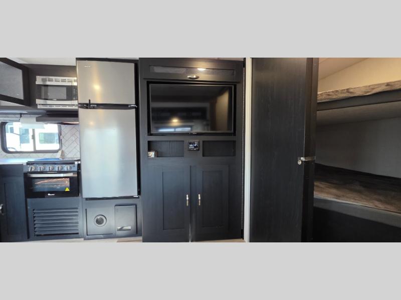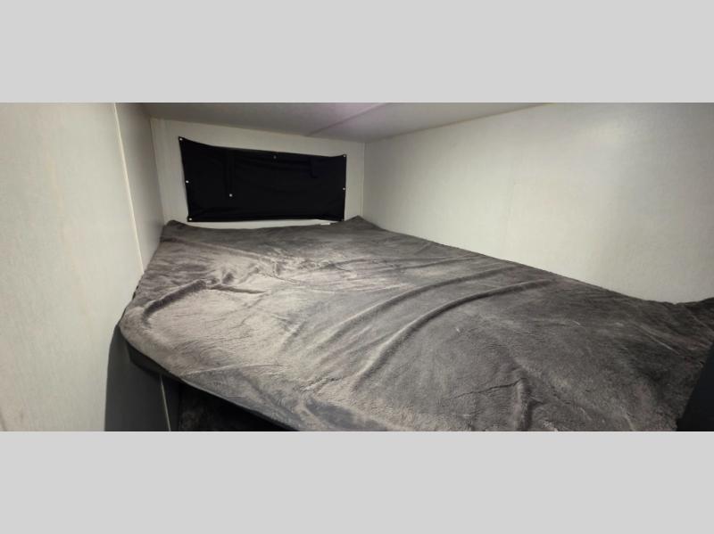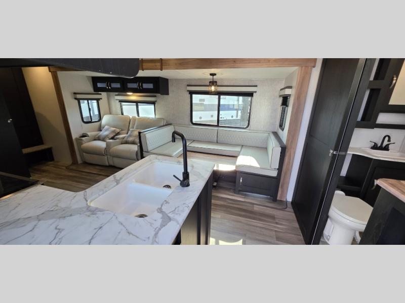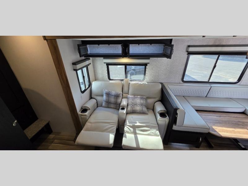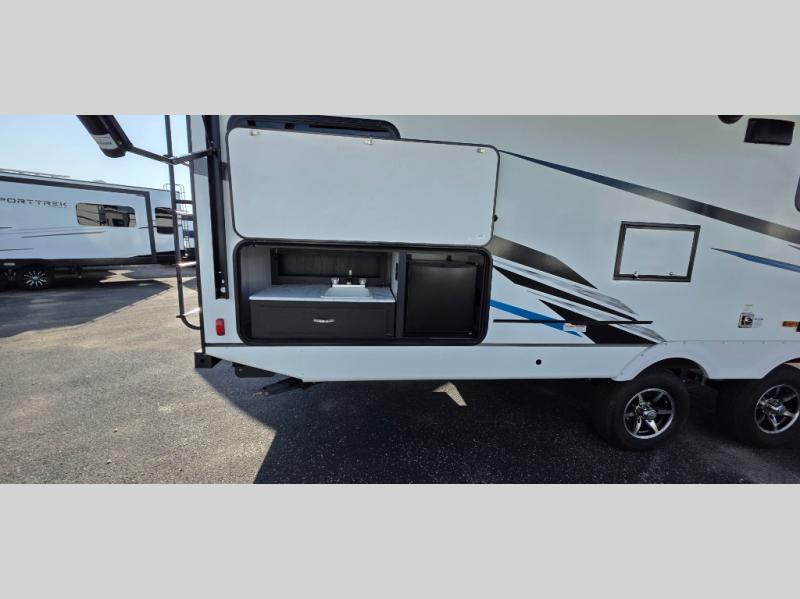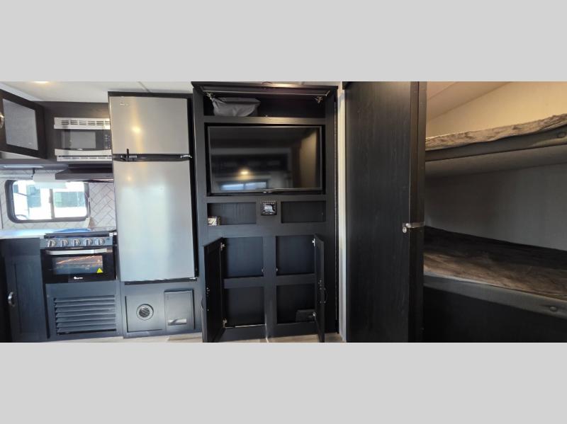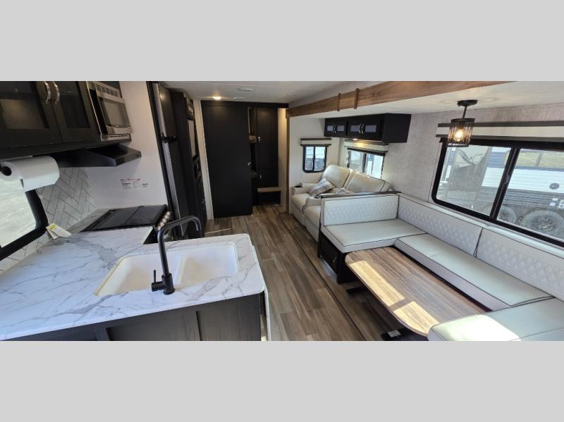 You can't go wrong with this spacious travel trailer in tow! When you arrive at the campground, prepare a quick lunch on the pull-out camp kitchen and set up the 20' power awning with LED lights. You can grab the fishing poles from the pass-through storage and head down to the lake. The walk-through bath will allow you to freshen up before dinner, and you may even want to start a game of cards at the U-shaped dinette. This model includes a simple private bunkhouse with double-size bunks, a wardrobe, and a step leading up to the top bunk, and the front master bedroom will be perfect for you and your spouse. Here, you'll find a queen bed with vaulted under-bed storage and dual wardrobes for your tablet and phone.