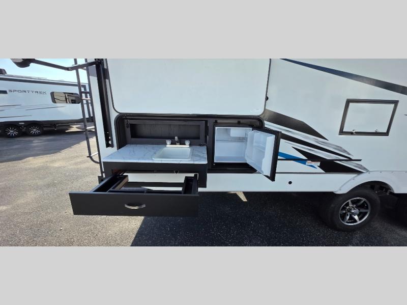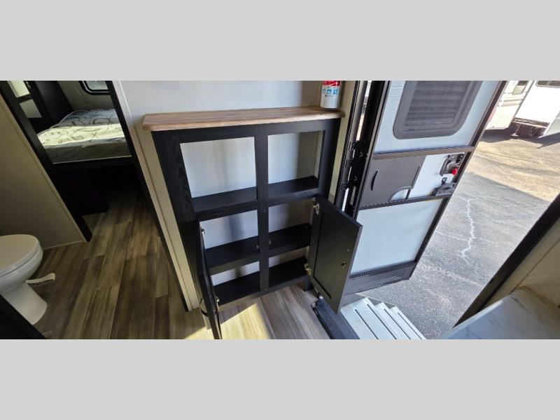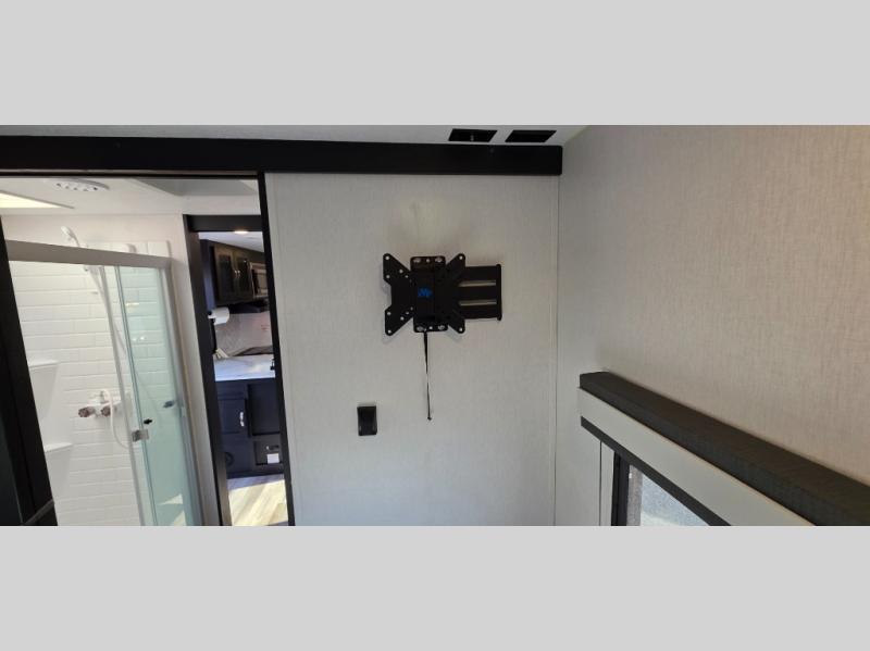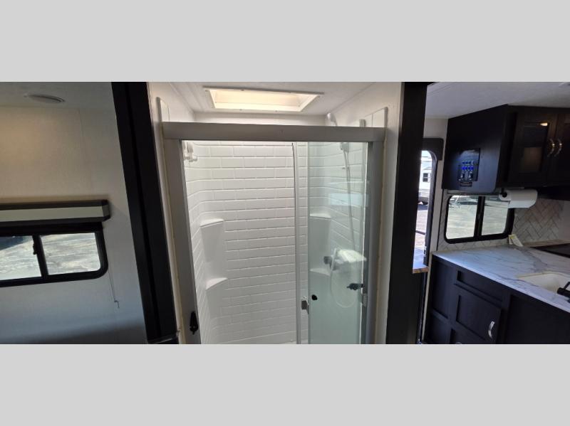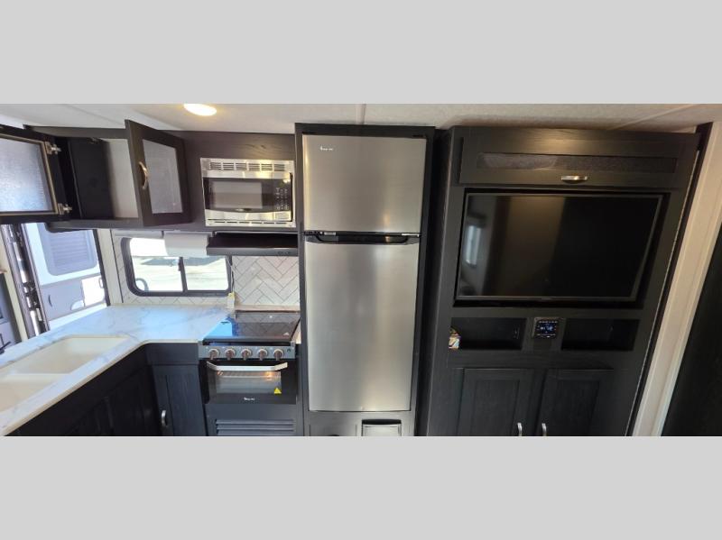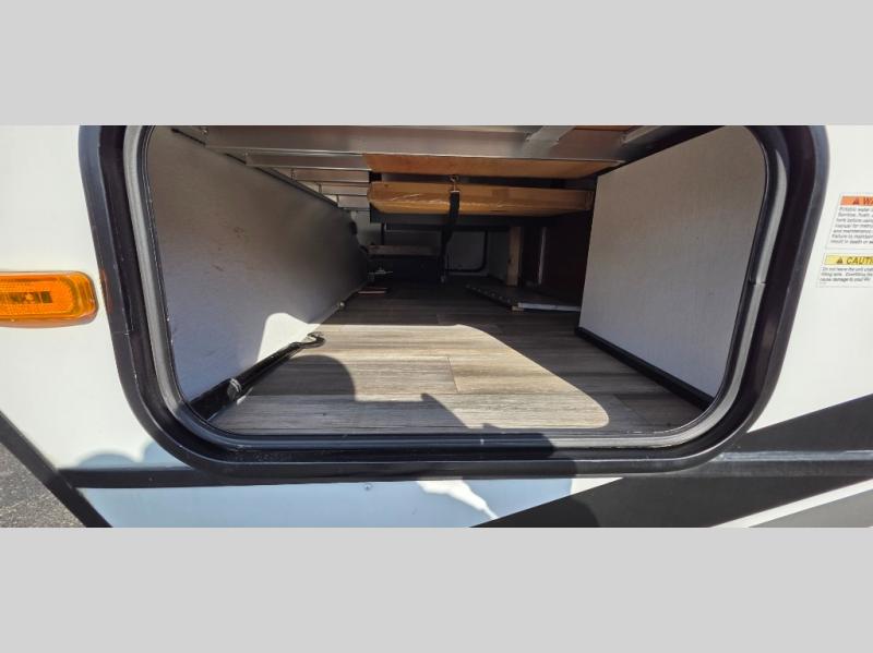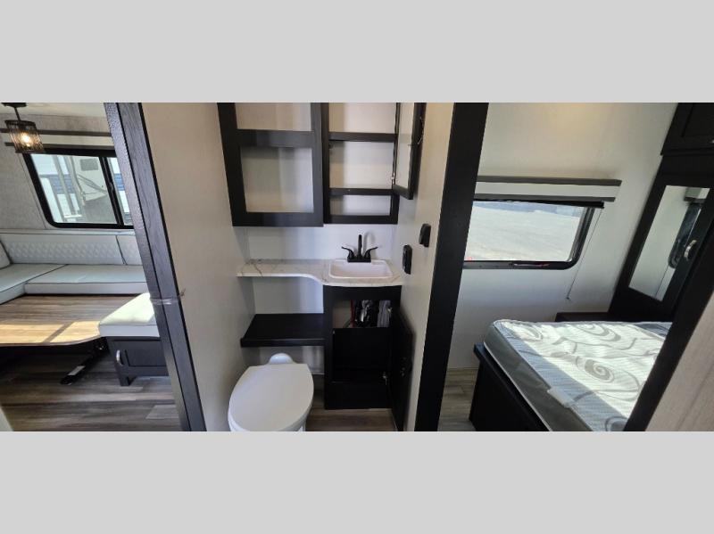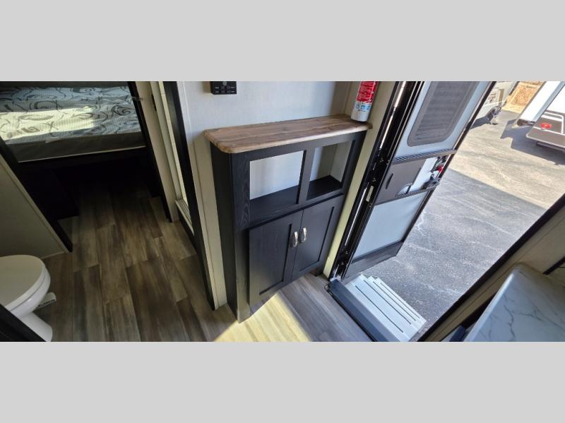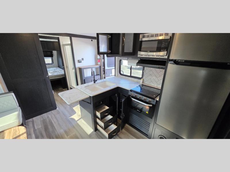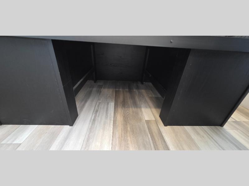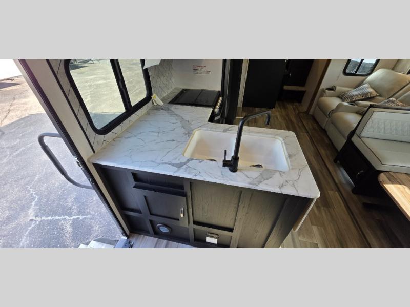 You can't go wrong with this spacious travel trailer in tow! When you arrive at the campground, prepare a quick lunch on the pull-out camp kitchen and set up the 20' power awning with LED lights. You can grab the fishing poles from the pass-through storage and head down to the lake. The walk-through bath will allow you to freshen up before dinner, and you may even want to start a game of cards at the U-shaped dinette. This model includes a simple private bunkhouse with double-size bunks, a wardrobe, and a step leading up to the top bunk, and the front master bedroom will be perfect for you and your spouse. Here, you'll find a queen bed with vaulted under-bed storage and dual wardrobes for your tablet and phone.