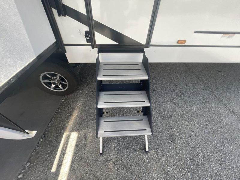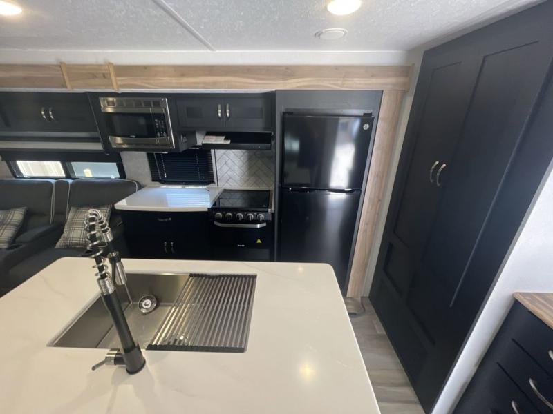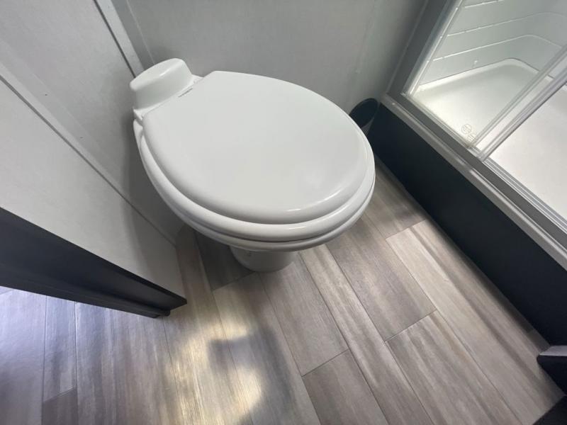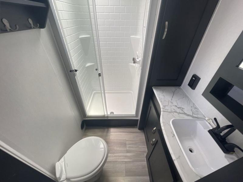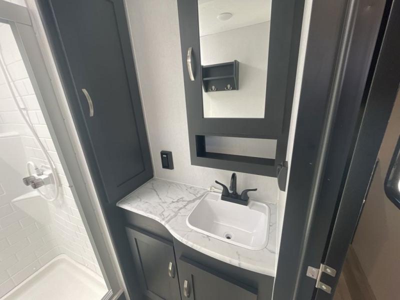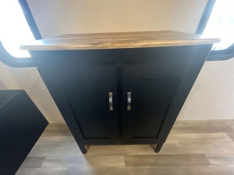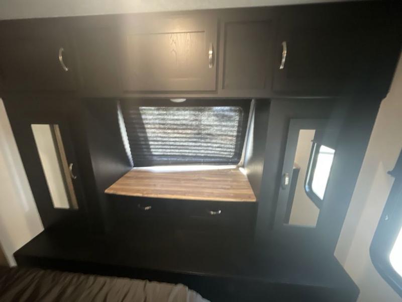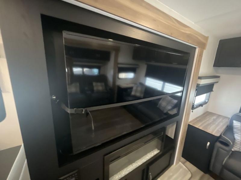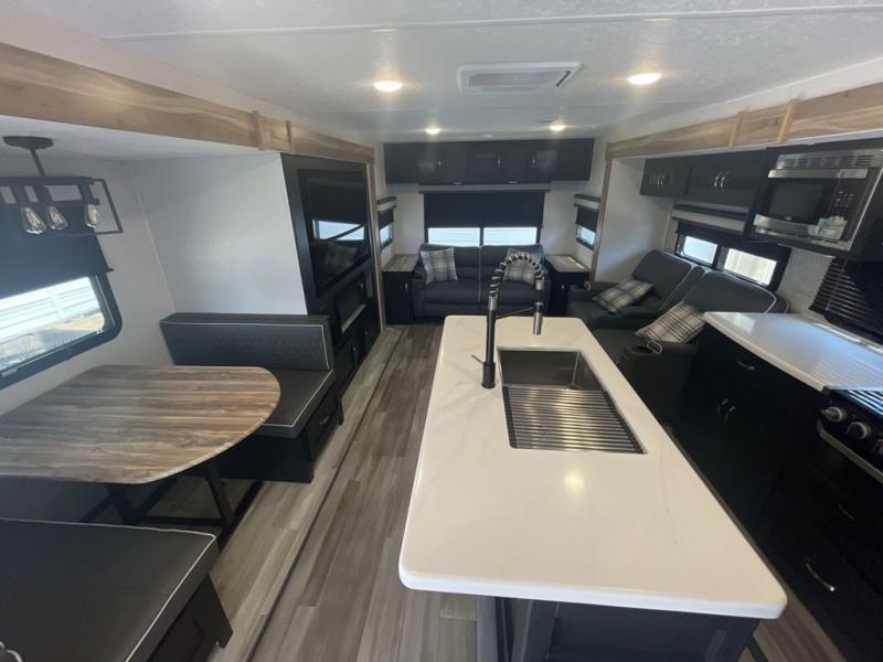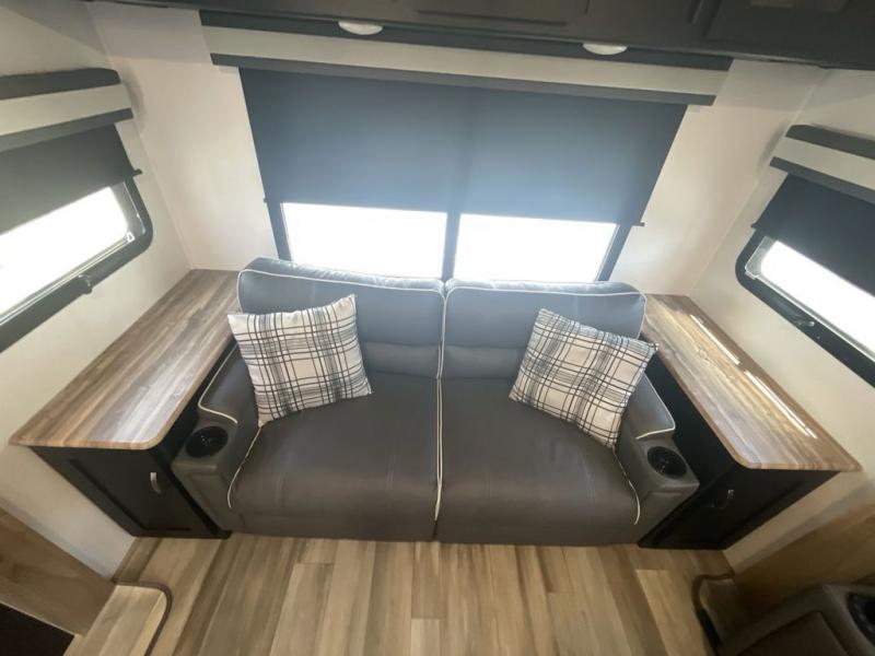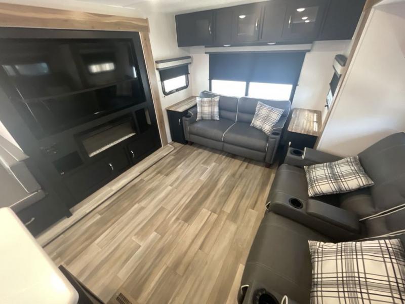 This spacious trailer offers dual opposing slides in the main living and kitchen area and a queen bed slide in the bedroom giving you lots of floor space in both areas! The kitchen offers full amenities including a large pantry, extra counter space, a center island, and a booth dinette. And the cook will be able to enjoy the LED TV and fireplace while making meals. Everyone can relax on the theater seats and the hide-a-bed sofa with end tables when visiting, and the furniture can double as sleeping space if needed. You will have your own bedroom to unwind with plenty of storage in the dressers and wardrobes. And the full bathroom offers a shower, linen storage and laundry bag, plus extra counter space for your toiletries.