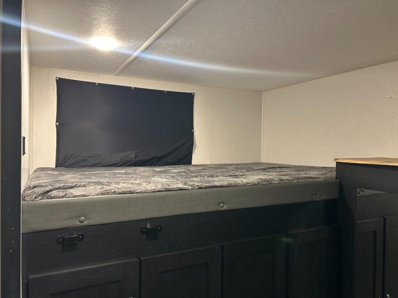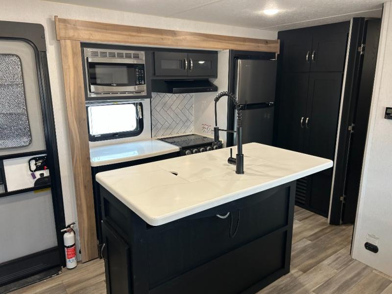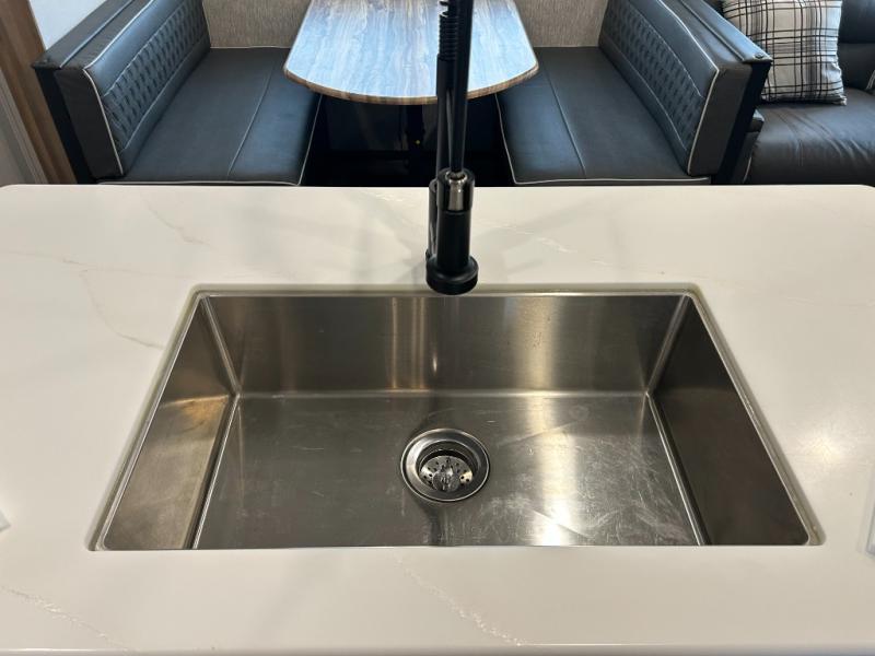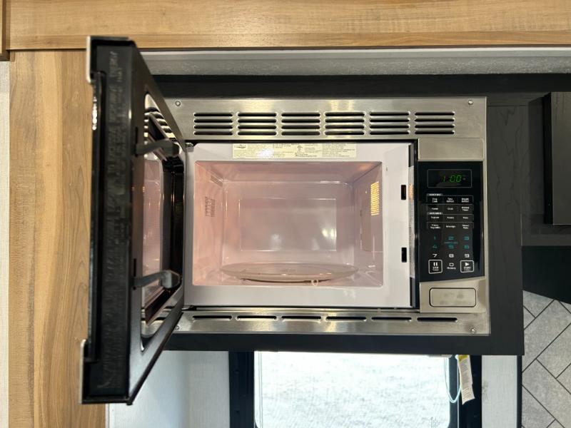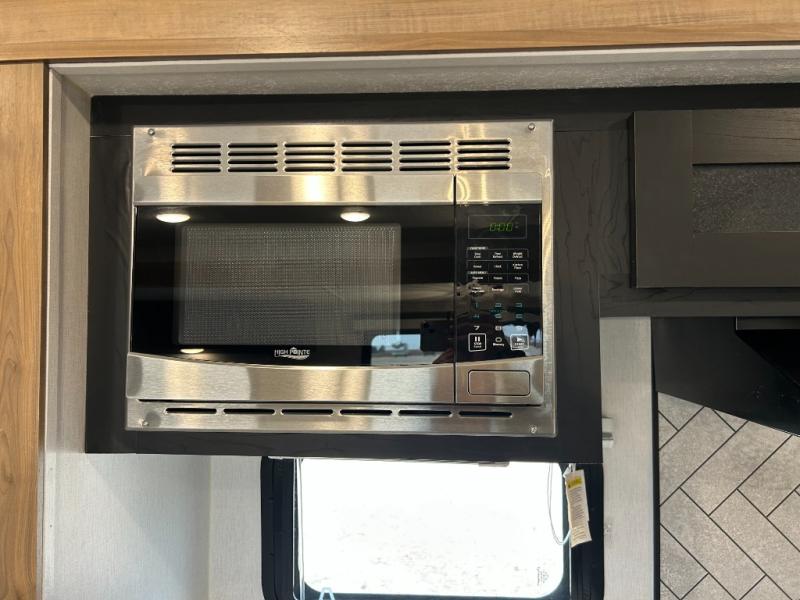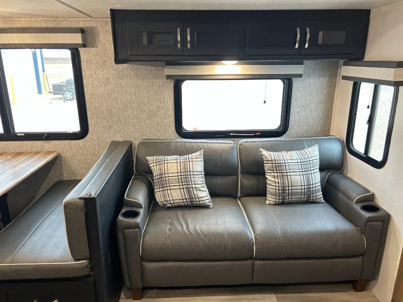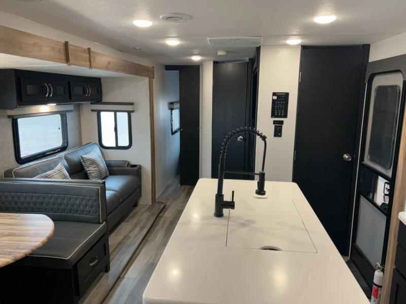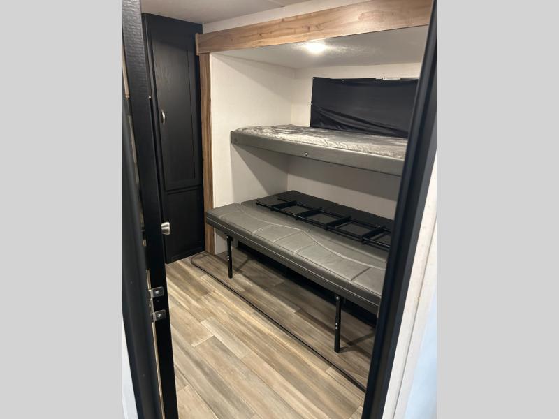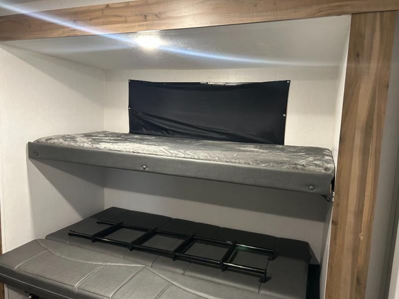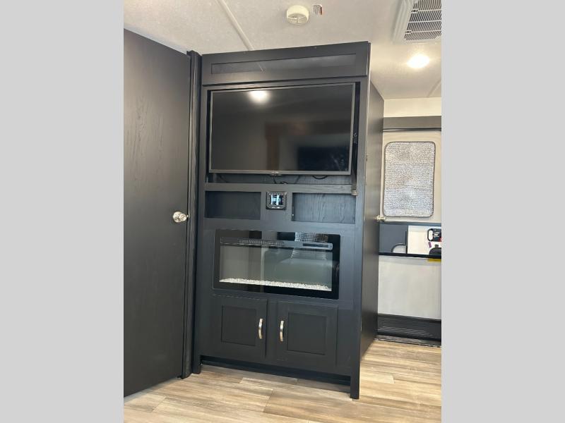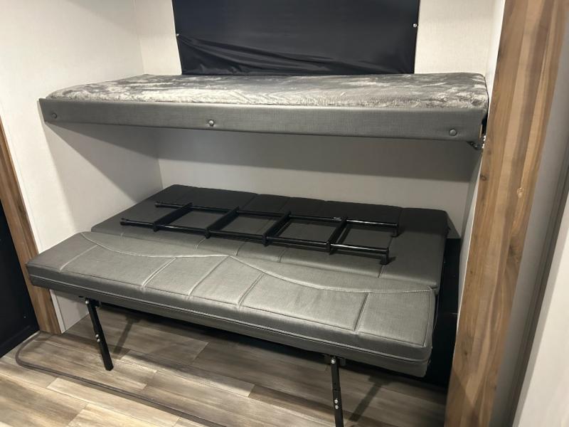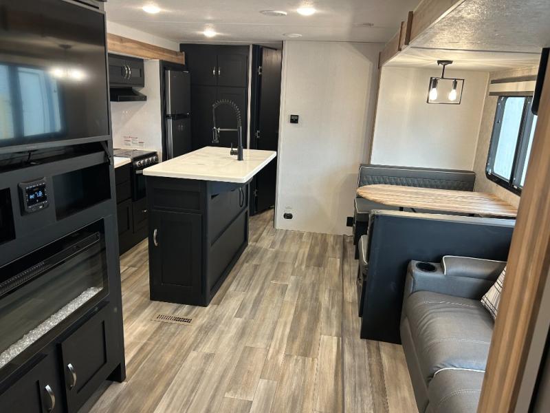 Load up and head out for camping with your favorite people in this triple slide trailer that is spacious, comfortable and inviting! The cook will love all their floor space while making meals thanks to the slide out with the kitchen appliances, the center island for serving meals and cleaning dishes, the pantry to stow all the goodies, and the choice to make meals using the full camp kitchen outside. The opposing slide in this area offers a booth dinette and a hide-a-bed sofa or choose a theater seat option instead. The LED TV and fireplace offer inside entertainment when you aren't outside relaxing under the 20' power awning. When it's time for bed, you can sleep on the queen bed in the front bedroom with vaulted underbed storage while the others sleep in the bunkhouse with a flip-up bunk, a roll-over sofa and/or the upper bunk.