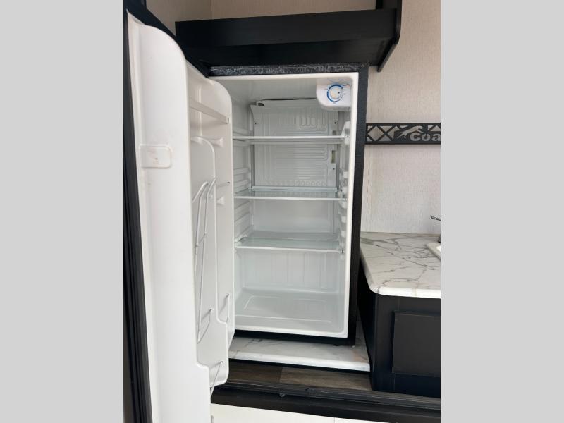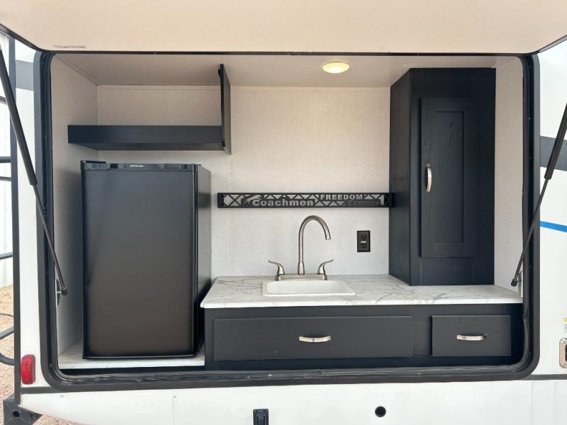 With any Coachmen Freedom Express Liberty Edition travel trailer, there is aluminum cage construction, vacuum bonded interior and exterior walls with Azdel composite, a heated and enclosed underbelly for four seasons of travel, and Tufflex PVC roofing. Some other features include hidden hinge cabinetry, Carefree flooring, a porcelain toilet, and the AIR 360+ amplified omnidirectional VHF/UHF, FM and WiFi antenna with optional 4G LTE Gateway add-on. And the required Express Pack includes an exterior griddle with side table, 50 AMP service, frameless windows and a ladder to reach the roof.