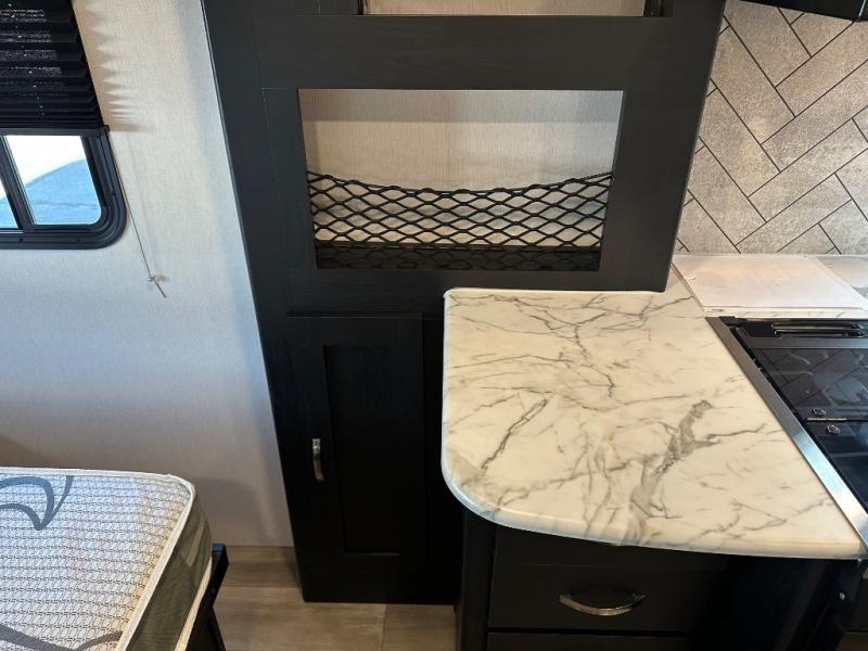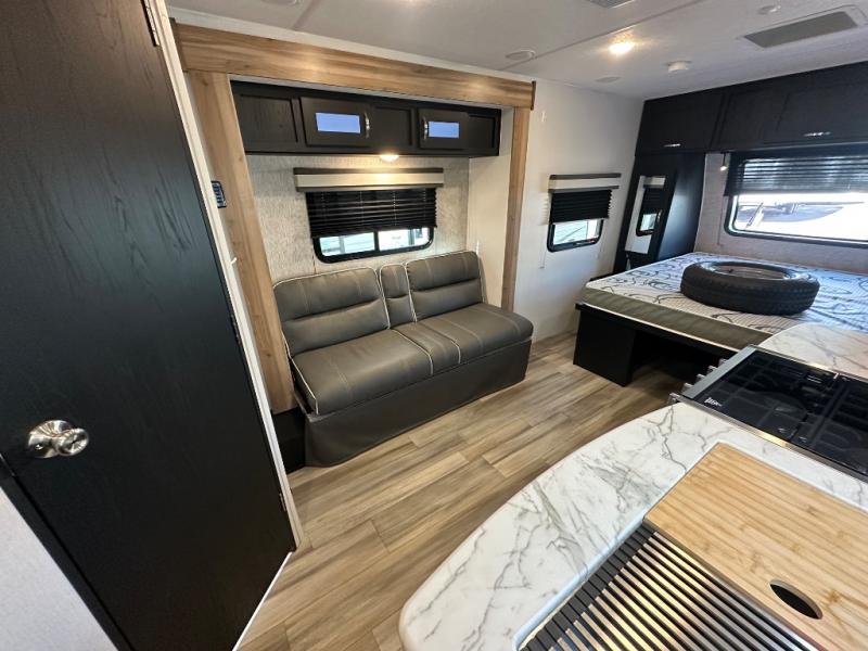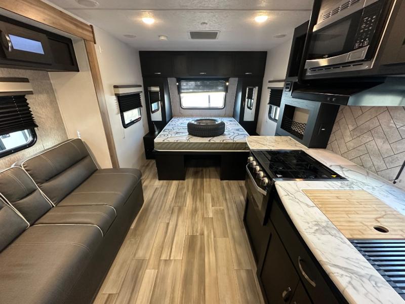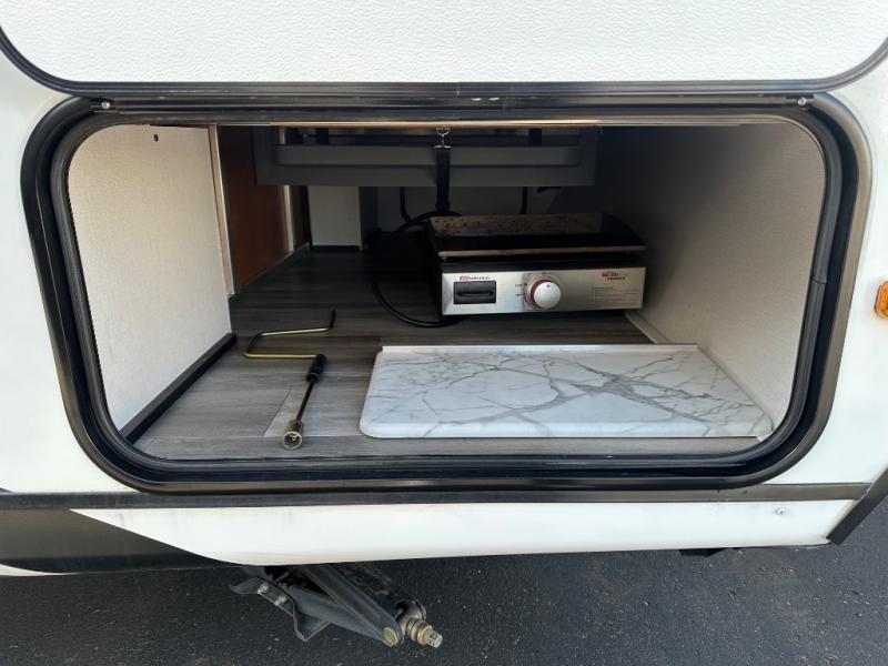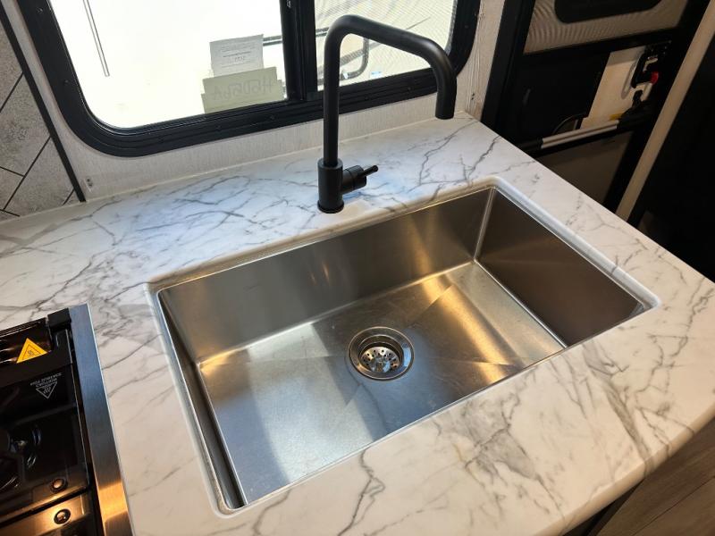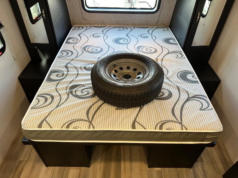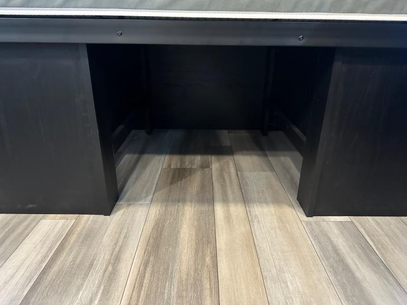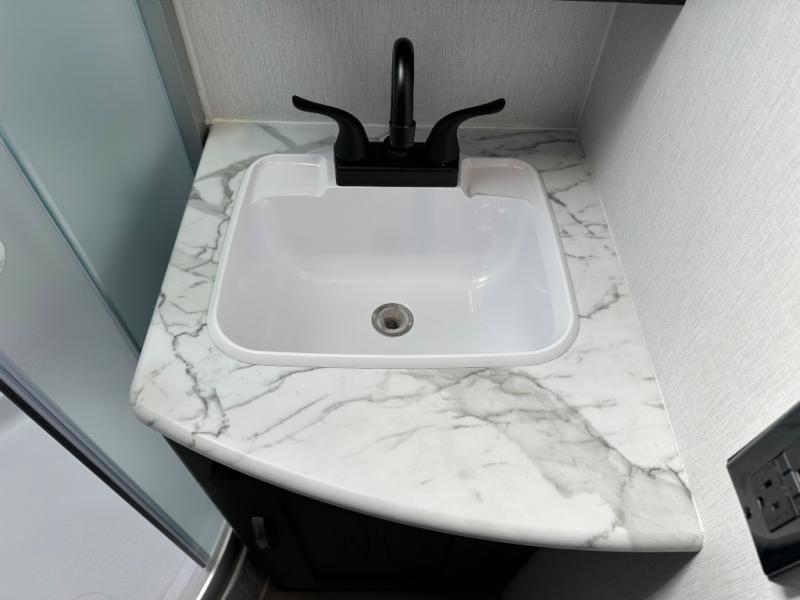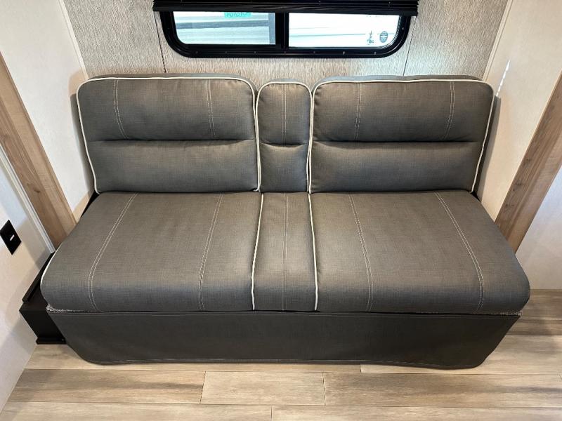 This is the perfect couple's trailer to take to the lake every other weekend. You will enjoy your own queen bed up front that includes vaulted under-bed storage for your luggage. The sofa slide out with a free-standing table provides a place to relax and dine together, and if you have an overnight guest, they can sleep here. The chef can prepare meals on the three burner cooktop or in the microwave oven, and there is a dual basin American stonecast sink for easy clean up. This model also includes a full bath with a linen closet for clean towels, and a 32" radius shower with a skylight for more standing space.