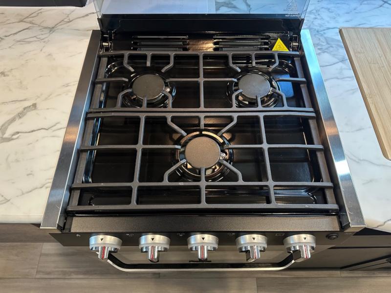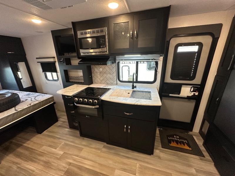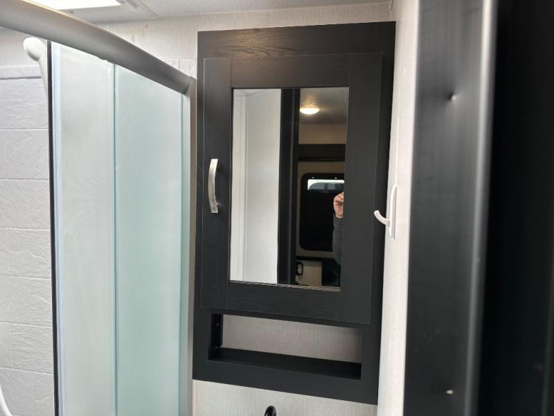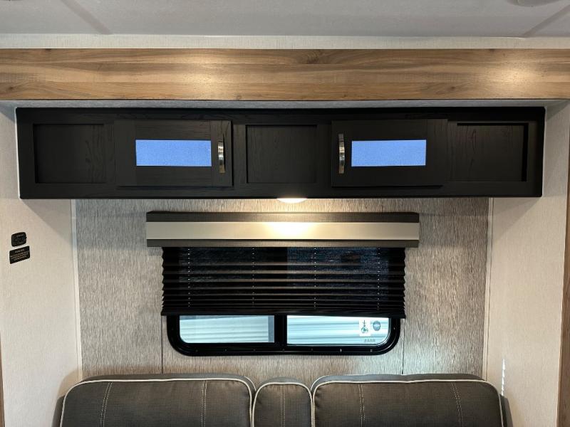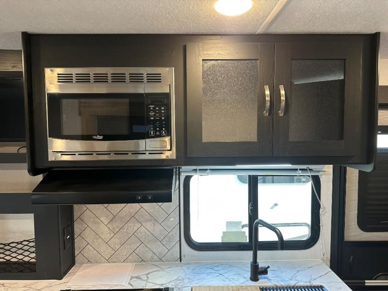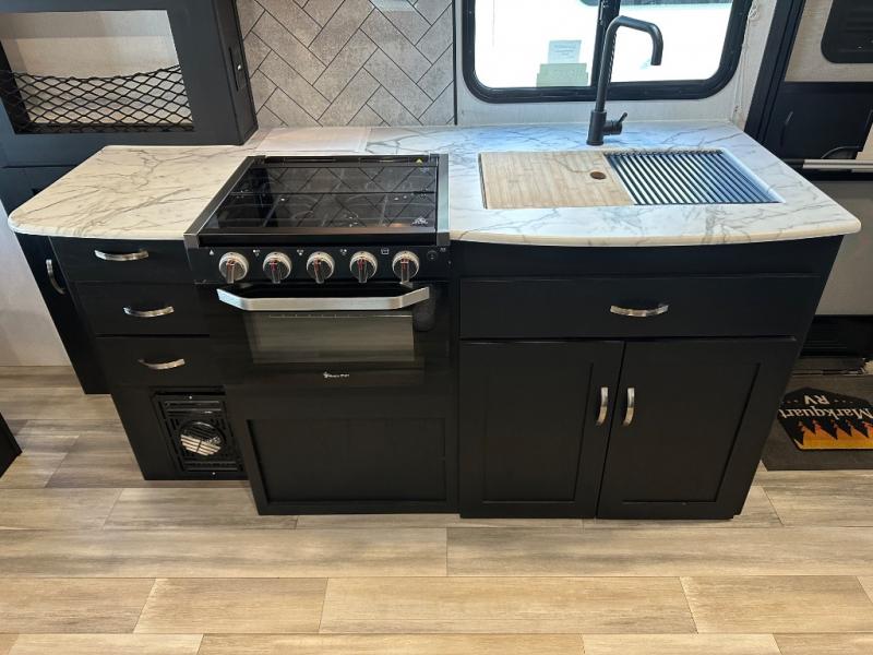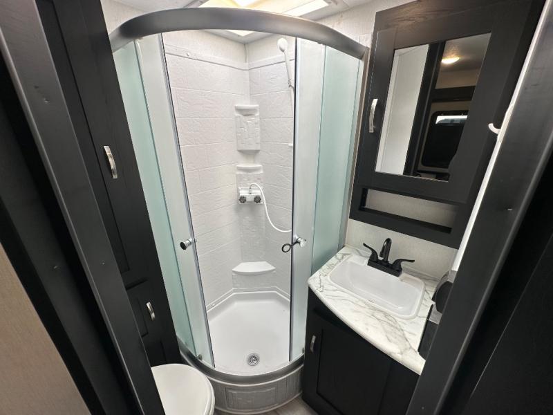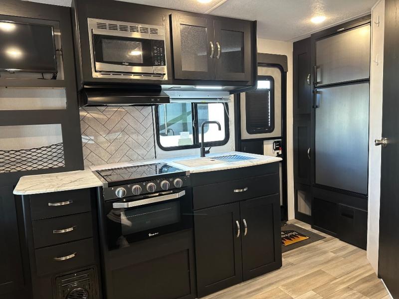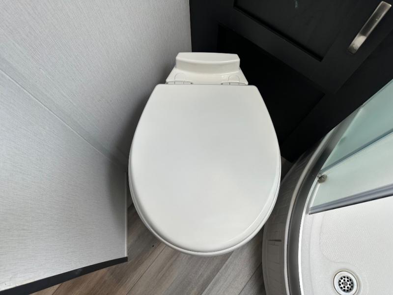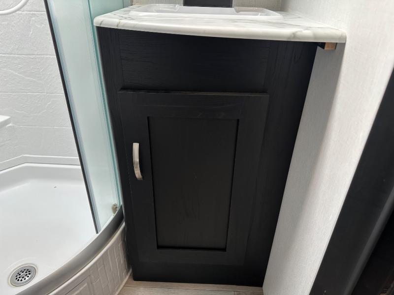 This is the perfect couple's trailer to take to the lake every other weekend. You will enjoy your own queen bed up front that includes vaulted under-bed storage for your luggage. The sofa slide out with a free-standing table provides a place to relax and dine together, and if you have an overnight guest, they can sleep here. The chef can prepare meals on the three burner cooktop or in the microwave oven, and there is a dual basin American stonecast sink for easy clean up. This model also includes a full bath with a linen closet for clean towels, and a 32" radius shower with a skylight for more standing space.