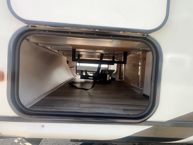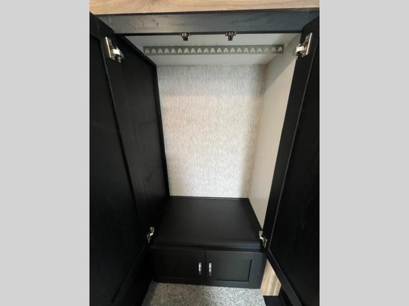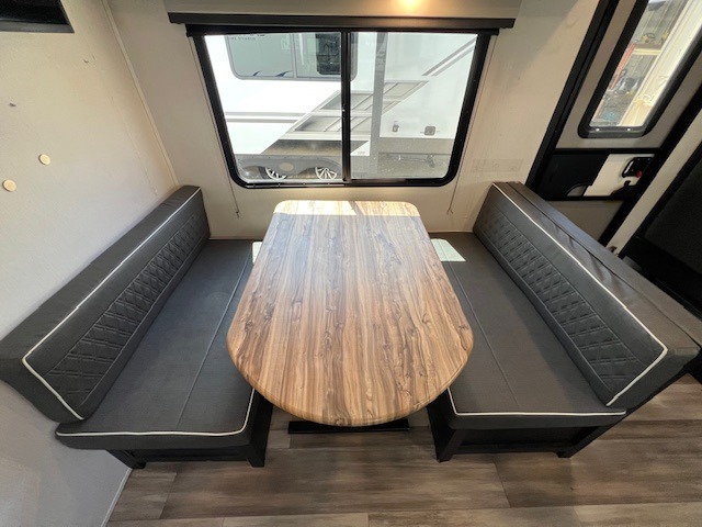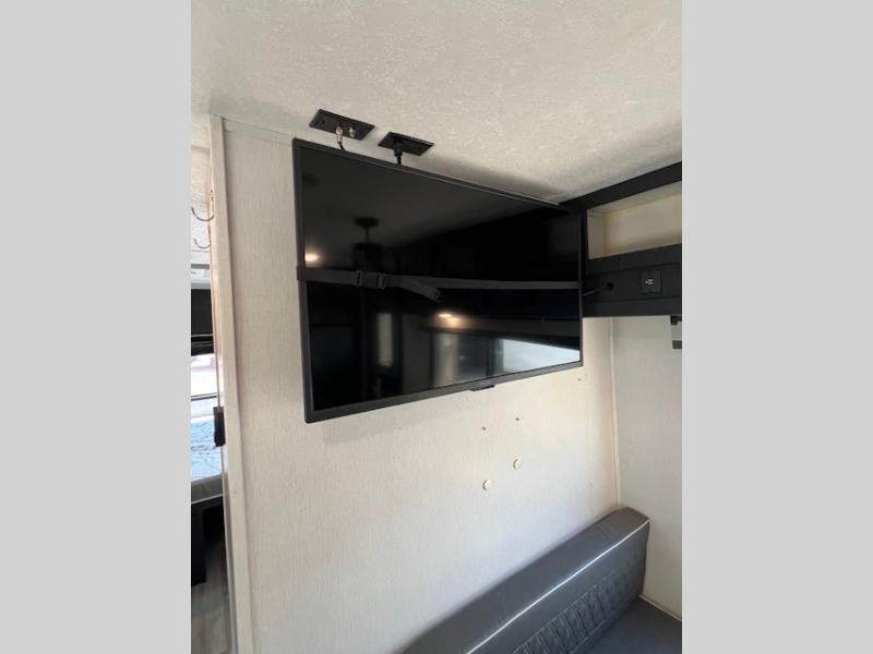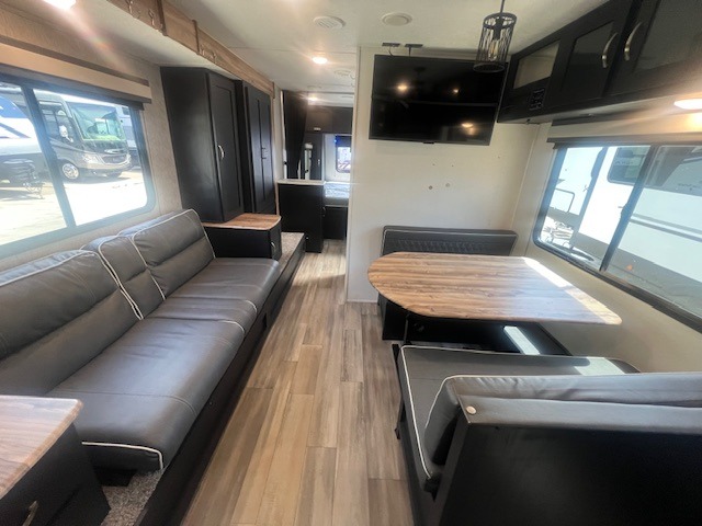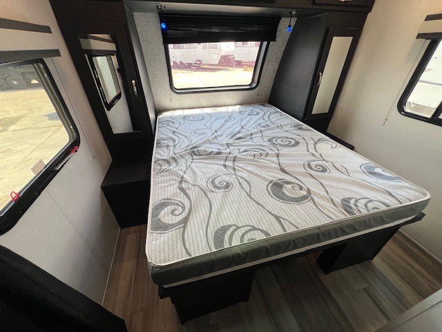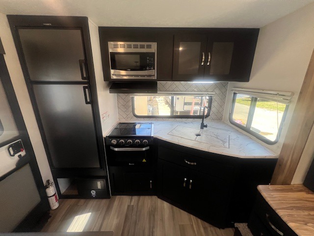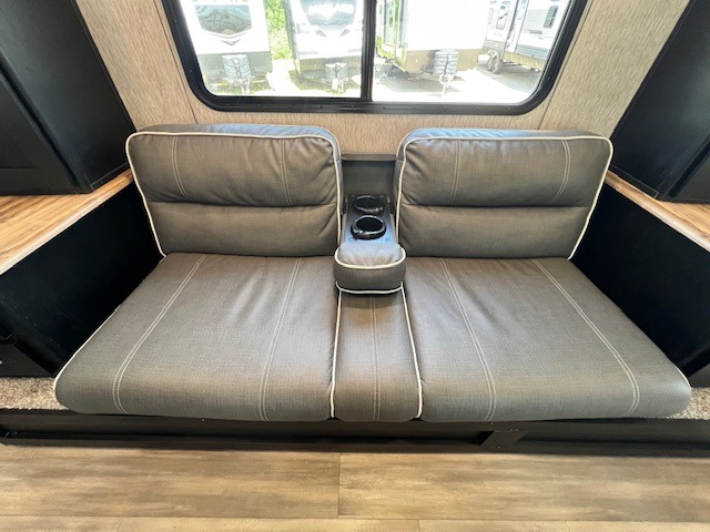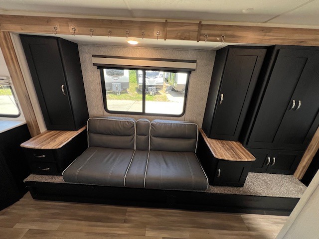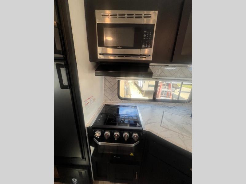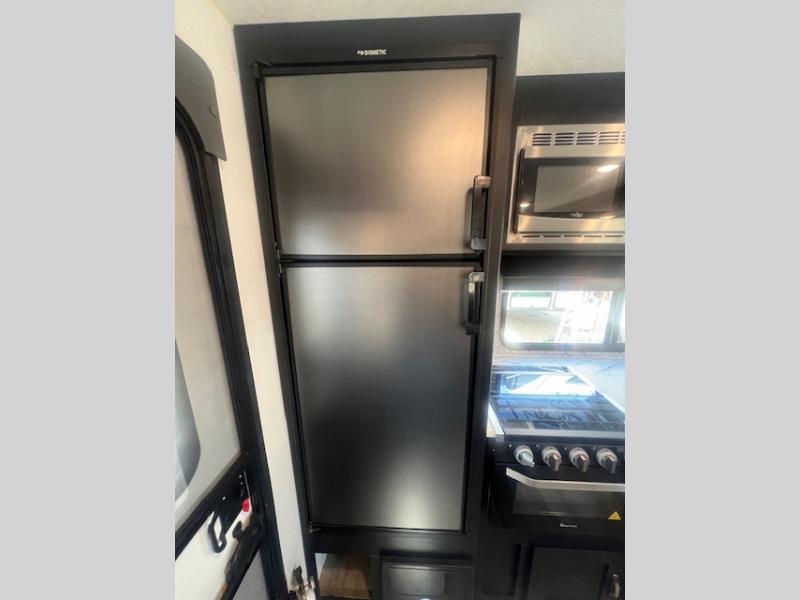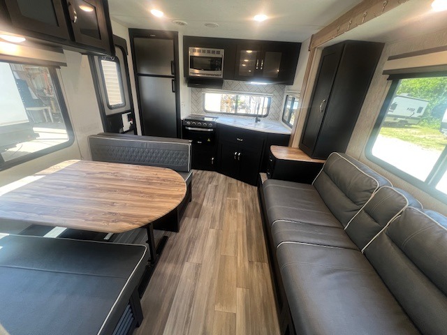 Check out this rear kitchen travel trailer that can sleep three to four each night. The front semi-private bedroom includes a privacy curtain and a queen bed with vaulted under-bed storage for your belongings. The sofa within the large slide out and the booth dinette will provide comfortable seating space, and there is an LED TV for those rainy camp days. This model also includes a three burner cooktop, a microwave oven, and an 8 cu. ft. double door refrigerator for your perishables. And don't forget about the 18' power awning with LED lights!