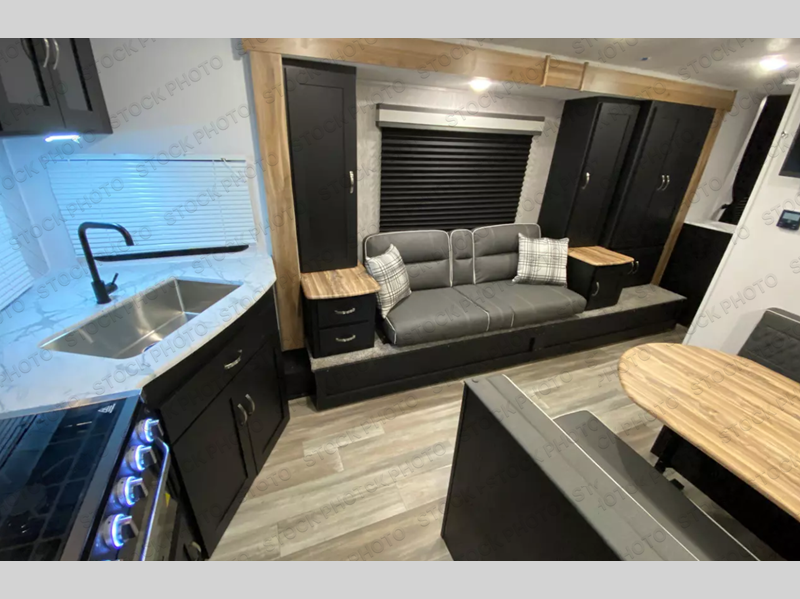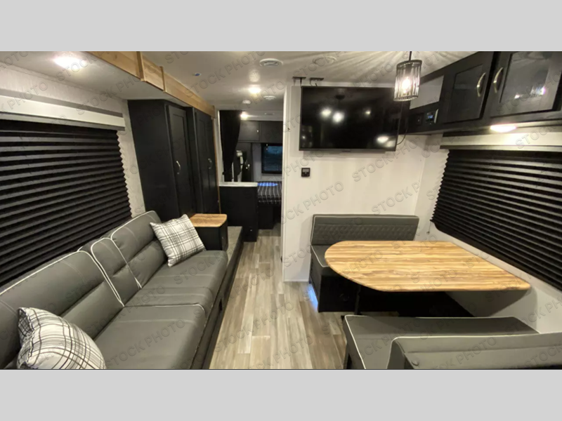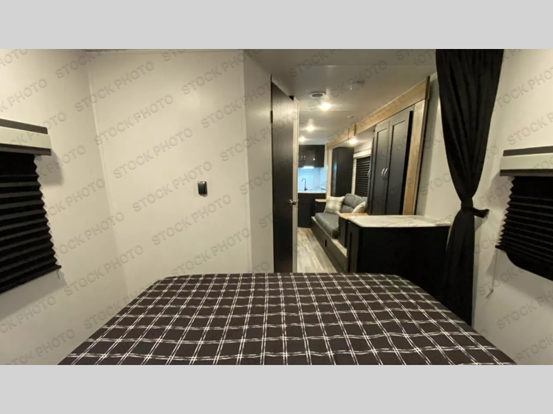 Check out this rear kitchen travel trailer that can sleep three to four each night. The front semi-private bedroom includes a privacy curtain and a queen bed with vaulted under-bed storage for your belongings. The sofa within the large slide out and the booth dinette will provide comfortable seating space, and there is an LED TV for those rainy camp days. This model also includes a three burner cooktop, a microwave oven, and an 8 cu. ft. double door refrigerator for your perishables. And don't forget about the 18' power awning with LED lights!