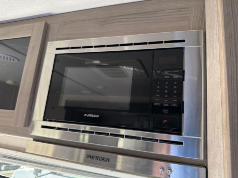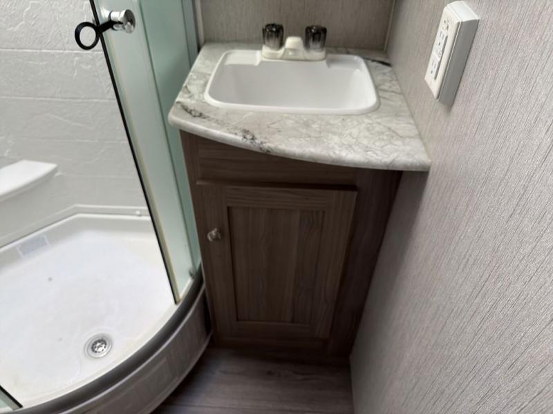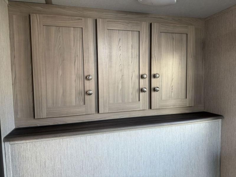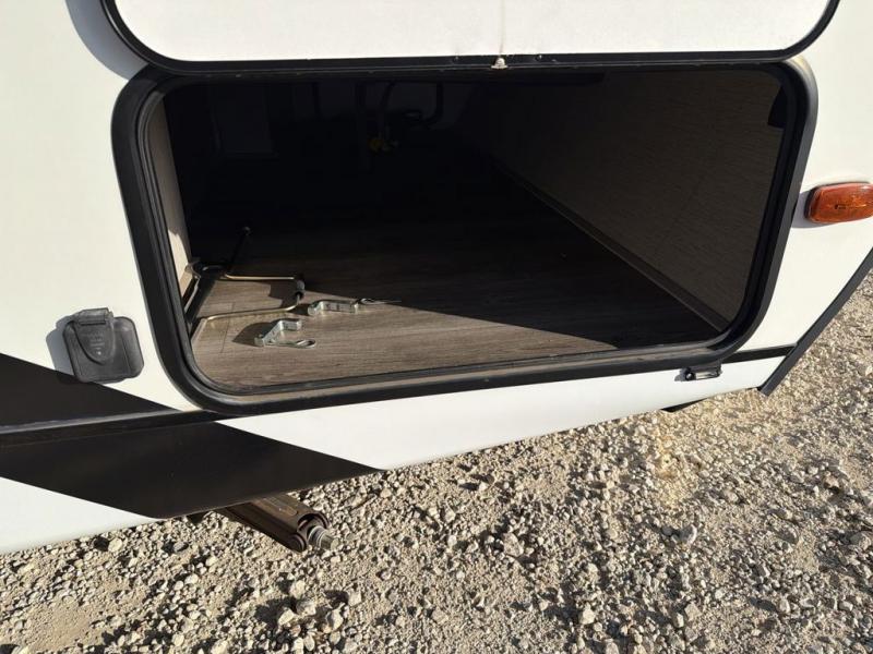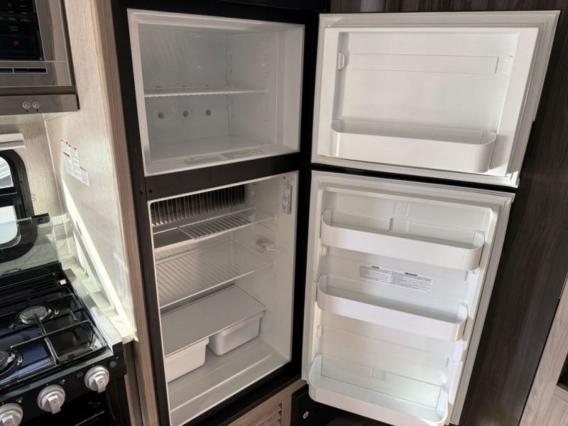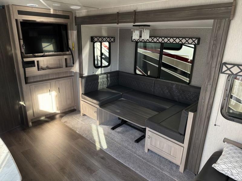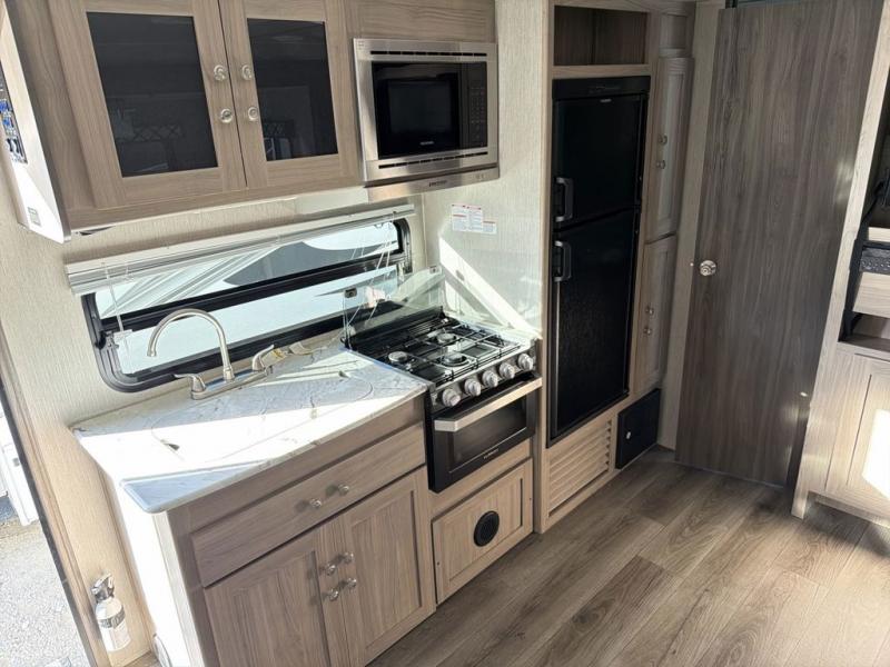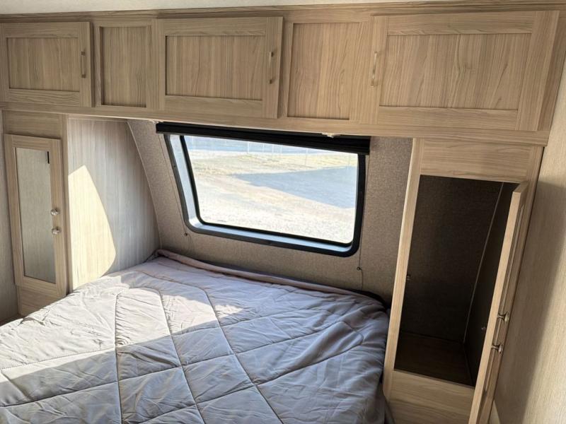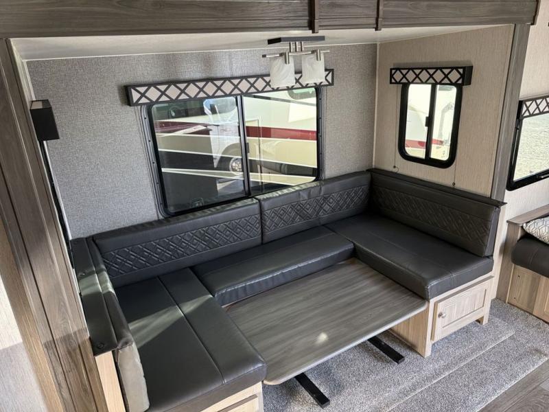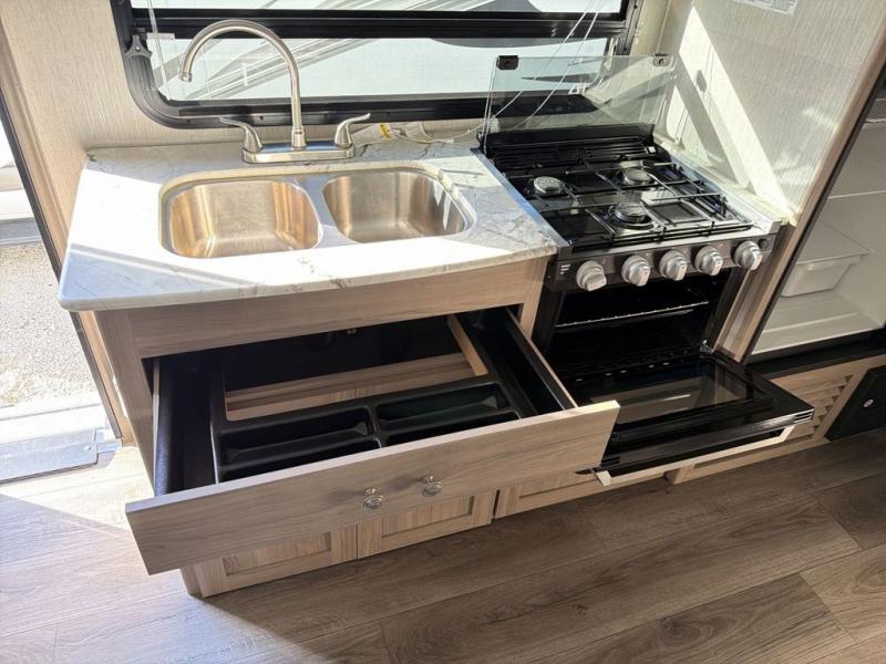 This travel trailer will feel just like home with its private bedroom and spacious full rear bath. You will appreciate the vaulted under-bed storage for extra blankets, shoes, and luggage, plus there are dual wardrobes on either side of the bed for your book and glasses. Get comfortable in the main living area on the sofa or at the booth dinette, or you can choose the optional theater seat or optional hide-a-bed sofa in place of the standard sofa. The chef of your group can prepare meals indoors or outdoors on the full camp kitchen, and check out the large 20' power awning with LED lights that will provide protection from the elements.