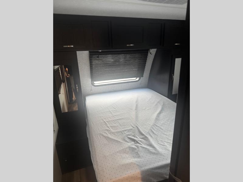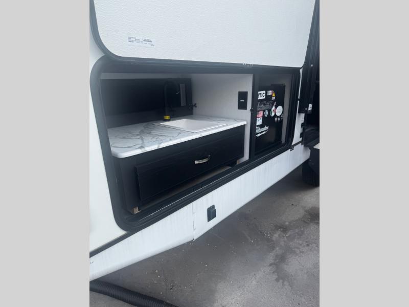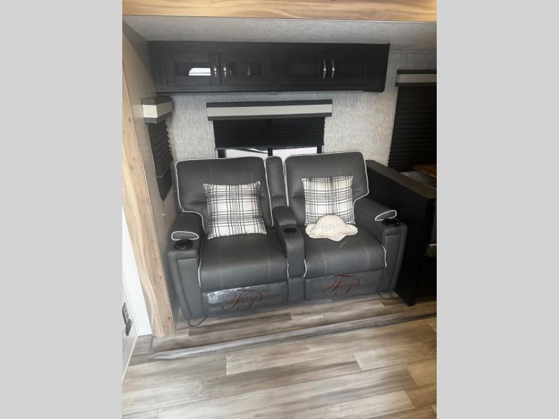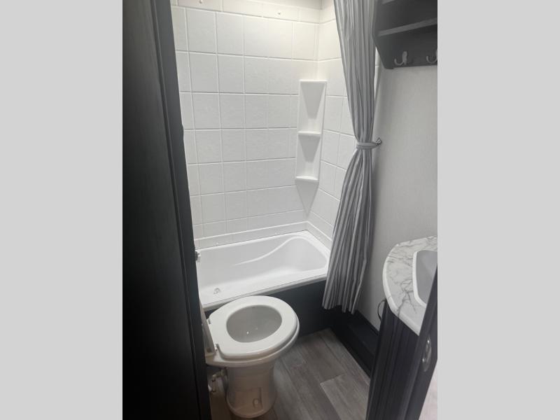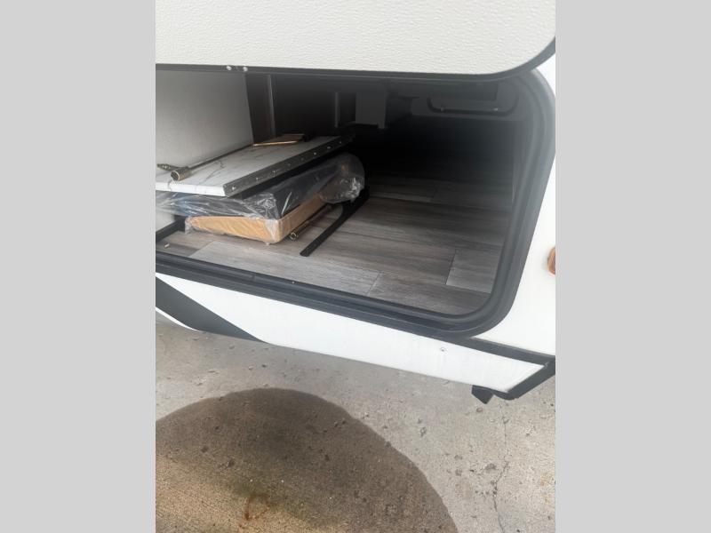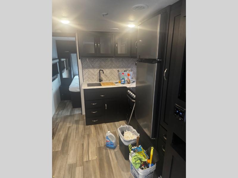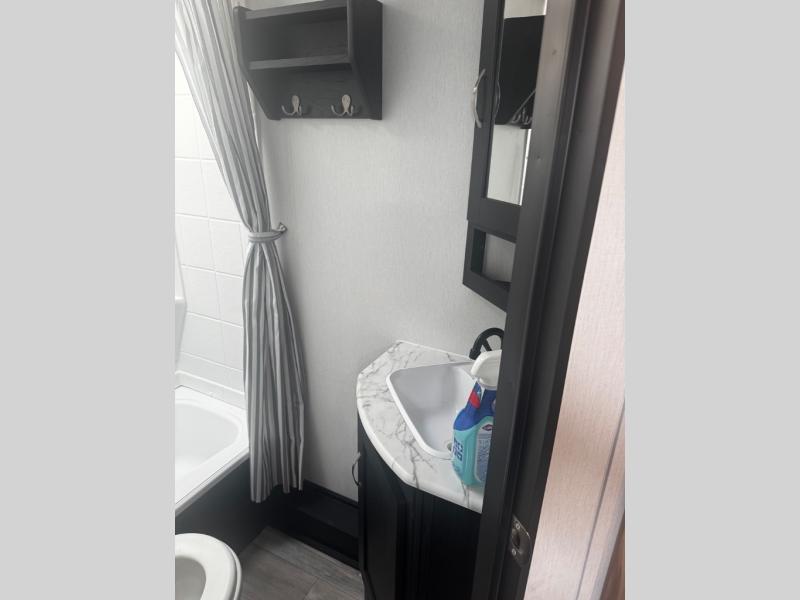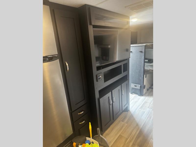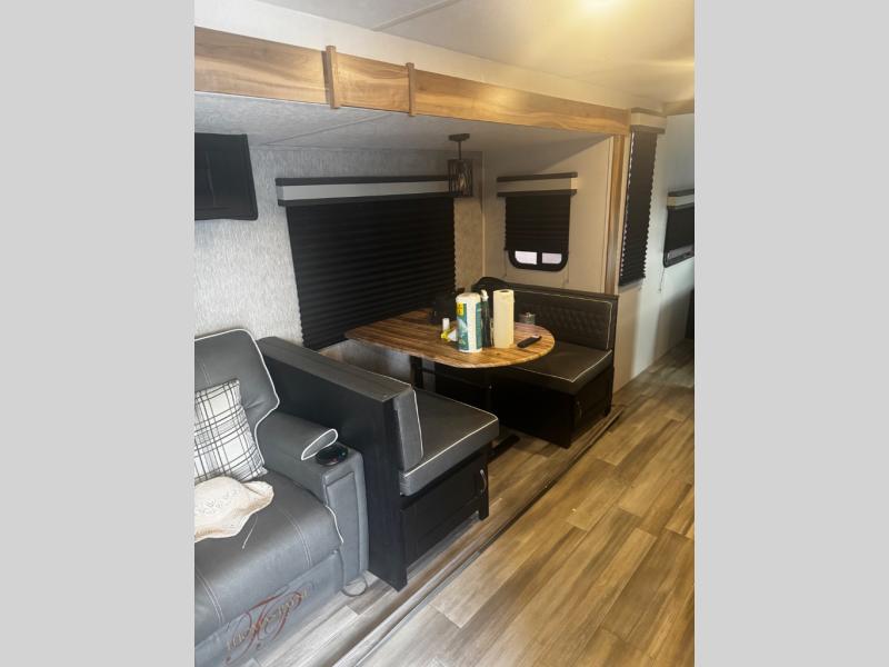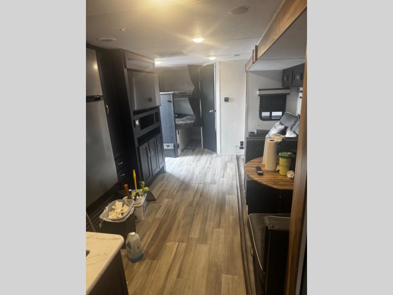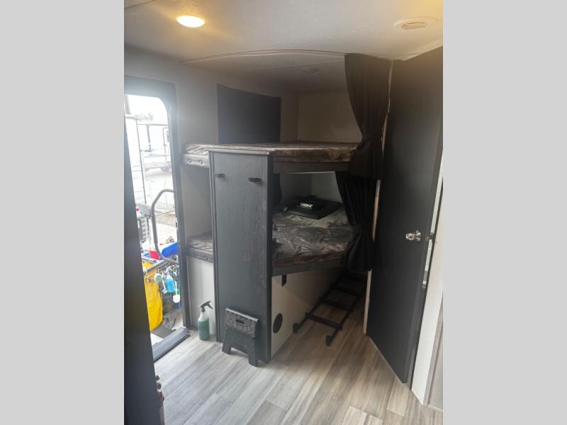 This dual entry travel trailer can comfortably sleep eight, so grab your family or friends and head out on an adventure. The littles ones are sure to love the double-size bunks, and the full bath is close by for nighttime restroom breaks. You will have the front private bedroom with a queen bed all to yourselves, and you'll have your own exterior entry door for convenience. The chef of your group will love cooking on the pull-out camp kitchen, or they can cook indoors on the three burner cooktop if the weather isn't cooperating.