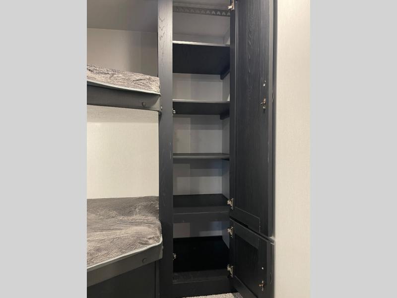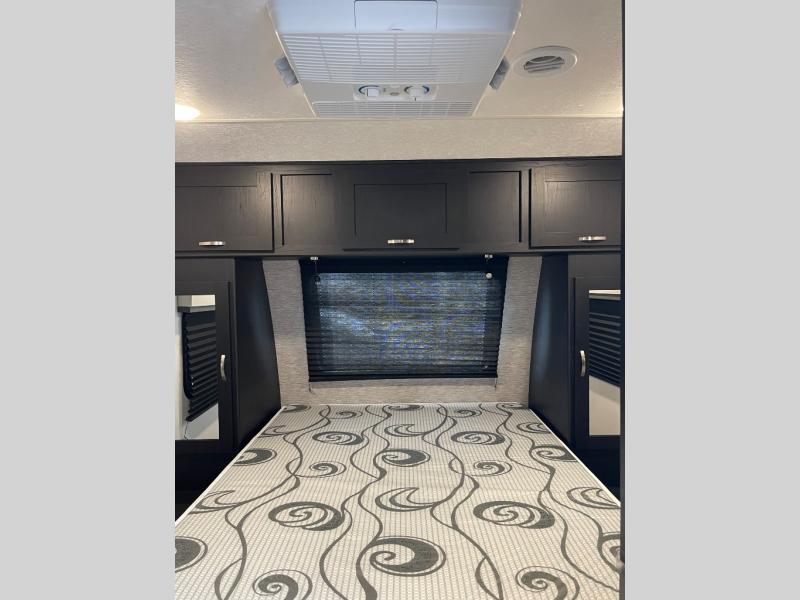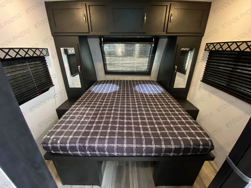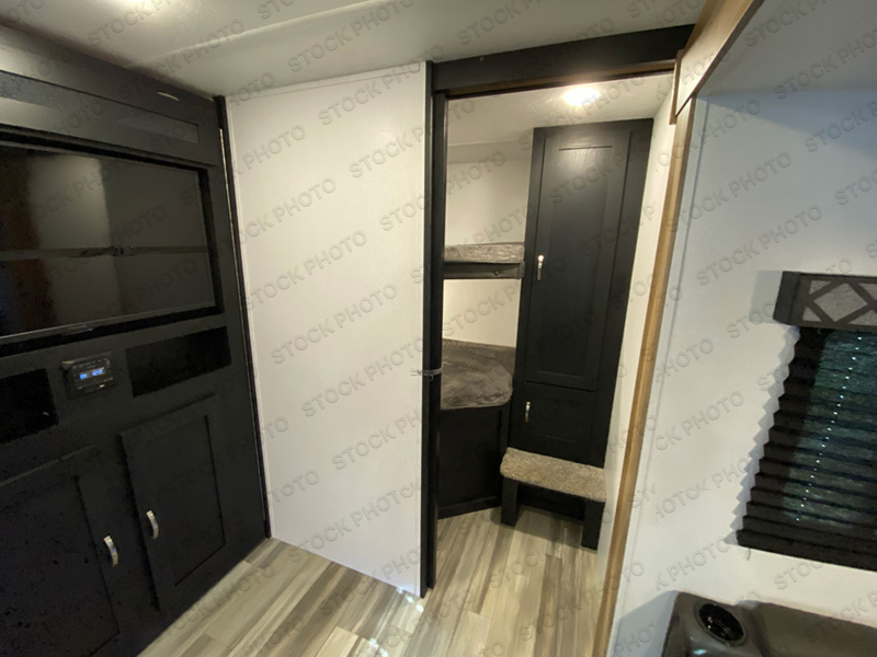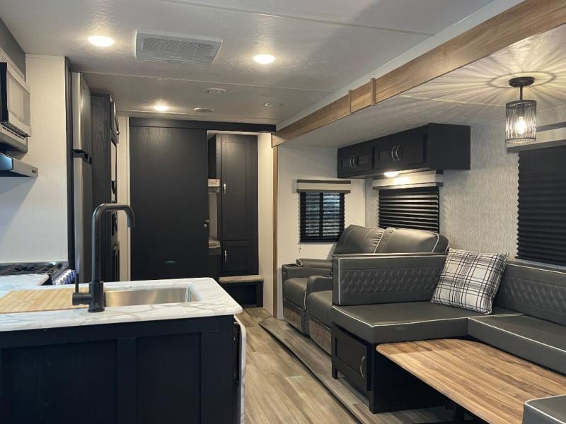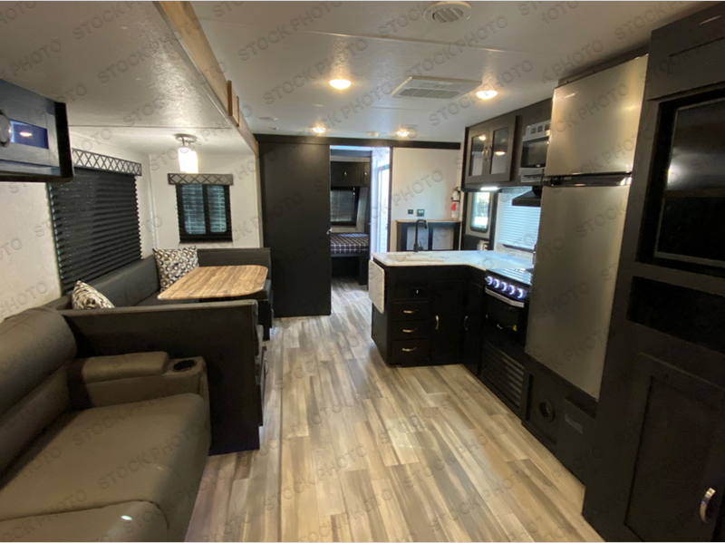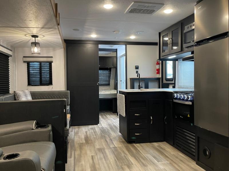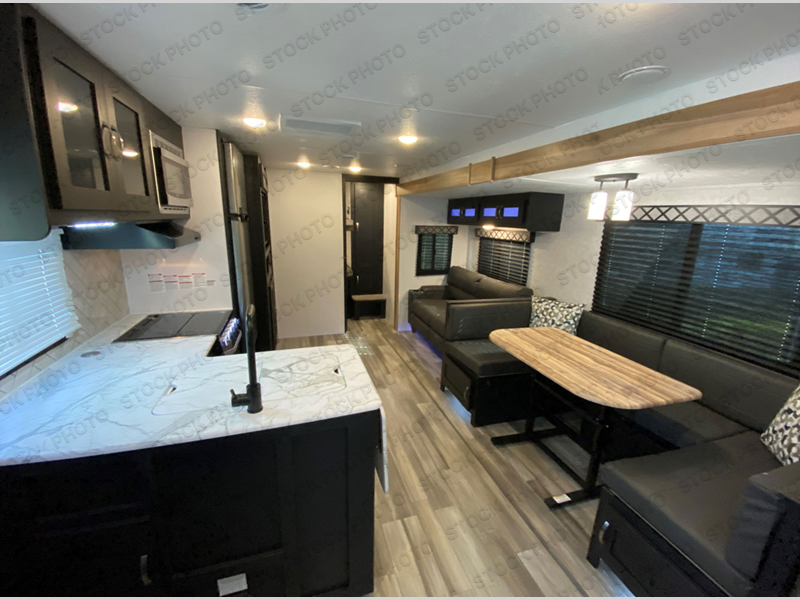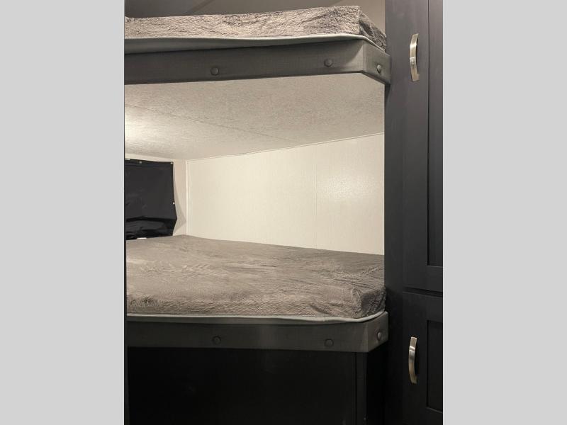 You can't go wrong with this spacious travel trailer in tow! When you arrive at the campground, prepare a quick lunch on the pull-out camp kitchen and set up the 20' power awning with LED lights. You can grab the fishing poles from the pass-through storage and head down to the lake. The walk-through bath will allow you to freshen up before dinner, and you may even want to start a game of cards at the U-shaped dinette. This model includes a simple private bunkhouse with double-size bunks, a wardrobe, and a step leading up to the top bunk, and the front master bedroom will be perfect for you and your spouse. Here, you'll find a queen bed with vaulted under-bed storage and dual wardrobes for your tablet and phone.