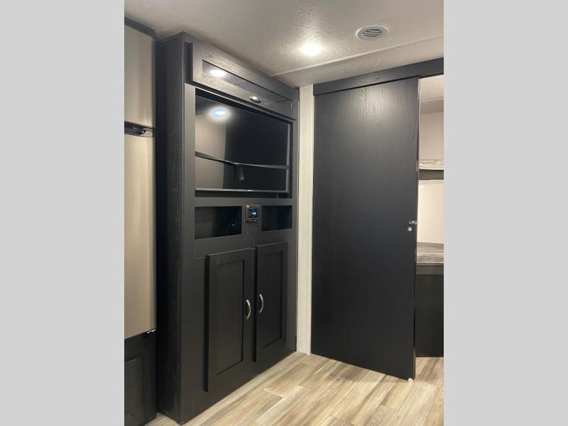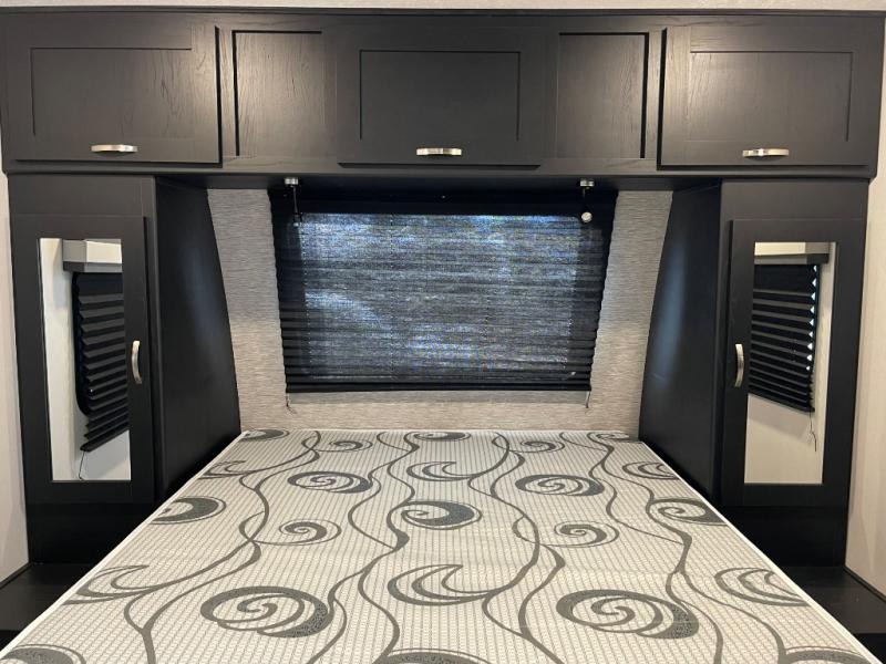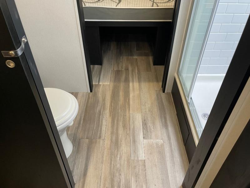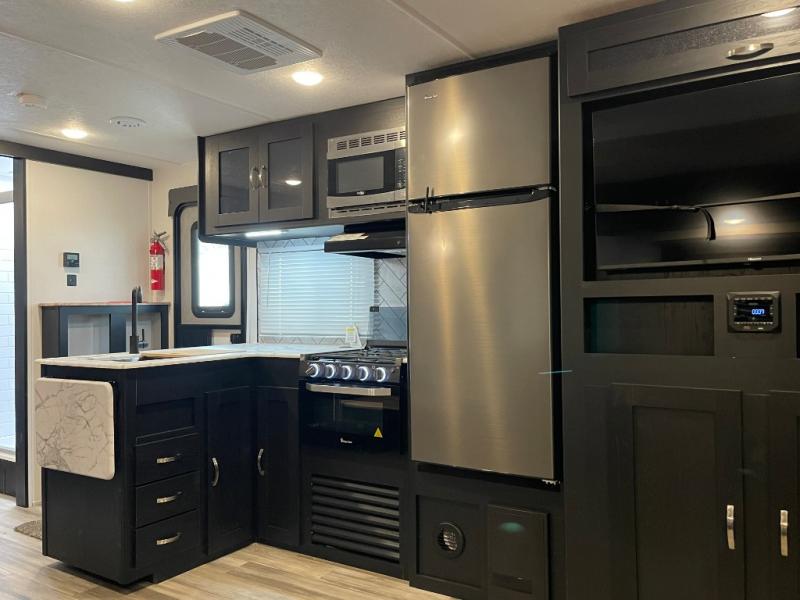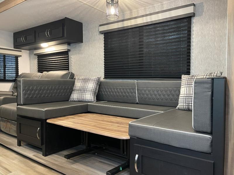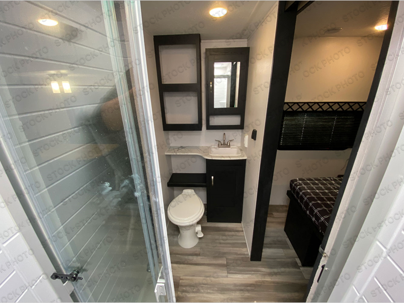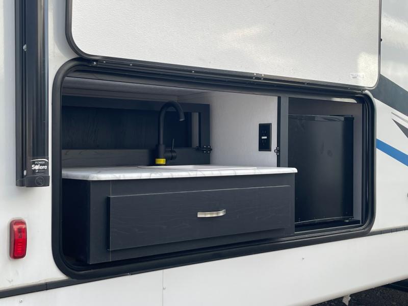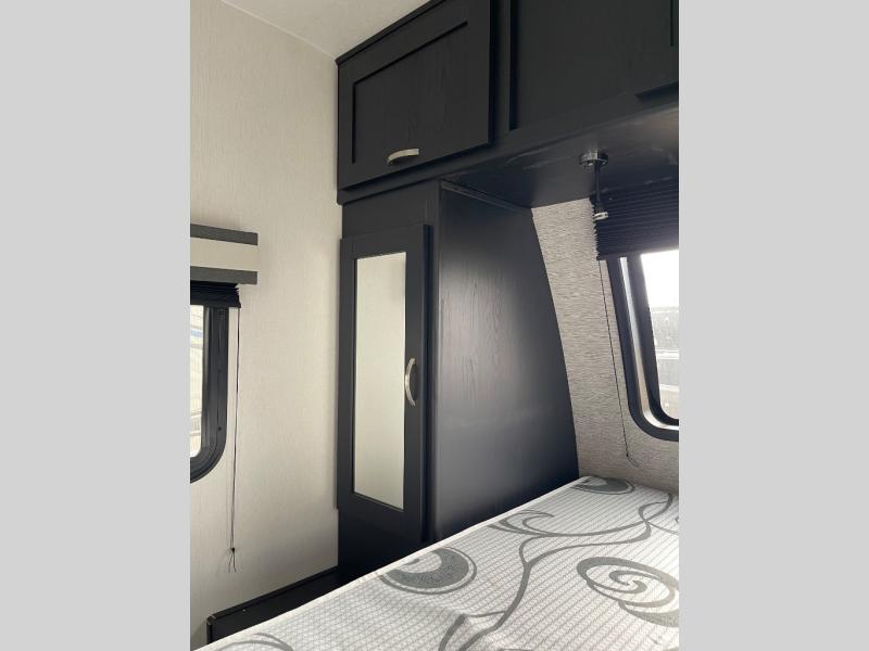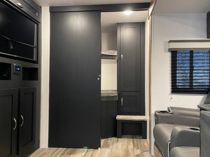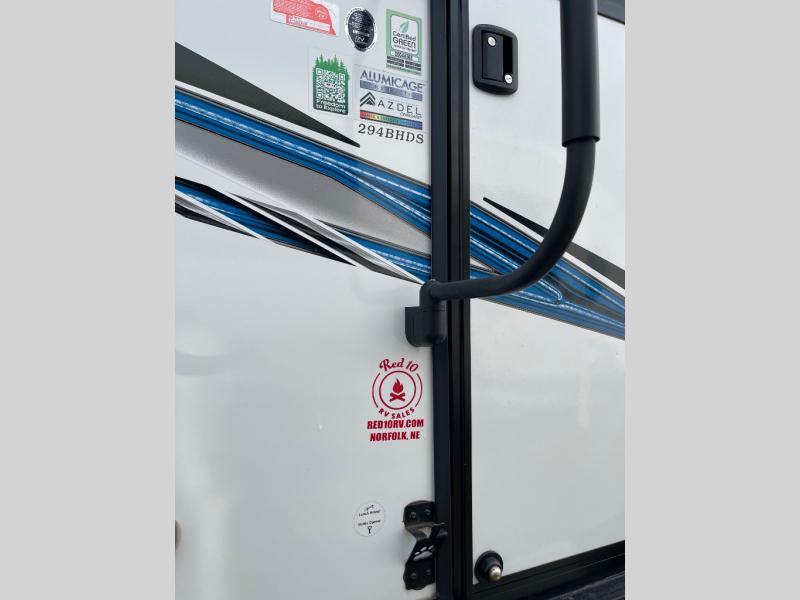 You can't go wrong with this spacious travel trailer in tow! When you arrive at the campground, prepare a quick lunch on the pull-out camp kitchen and set up the 20' power awning with LED lights. You can grab the fishing poles from the pass-through storage and head down to the lake. The walk-through bath will allow you to freshen up before dinner, and you may even want to start a game of cards at the U-shaped dinette. This model includes a simple private bunkhouse with double-size bunks, a wardrobe, and a step leading up to the top bunk, and the front master bedroom will be perfect for you and your spouse. Here, you'll find a queen bed with vaulted under-bed storage and dual wardrobes for your tablet and phone.