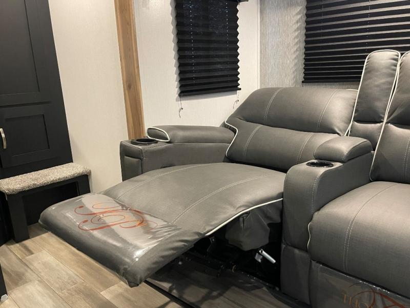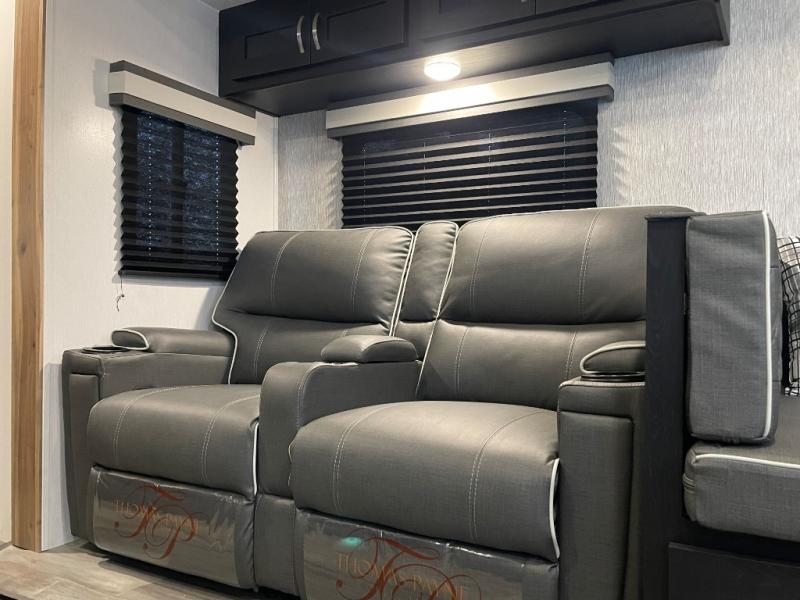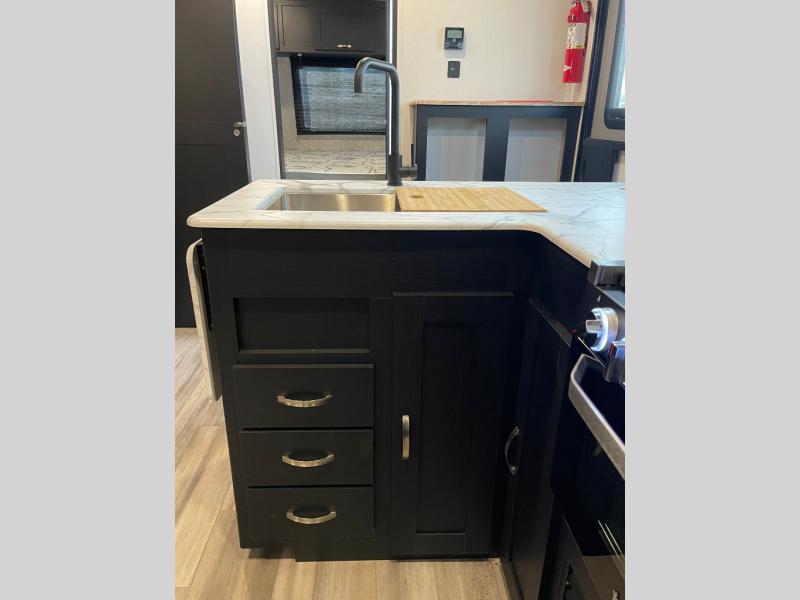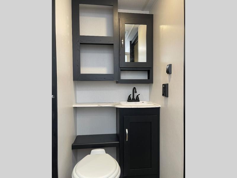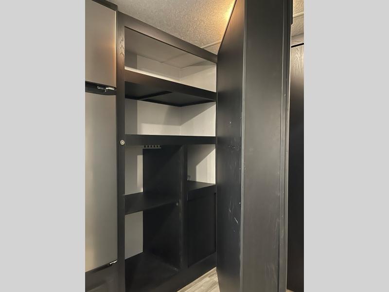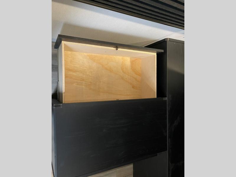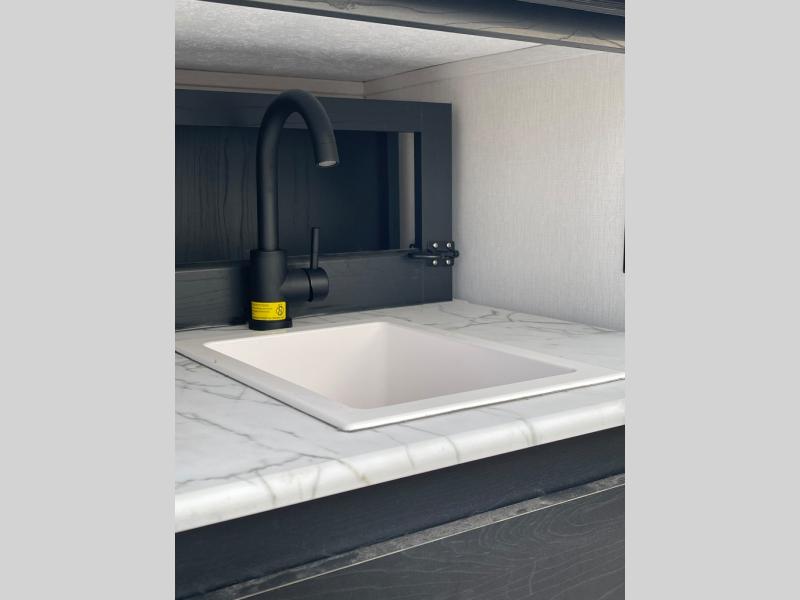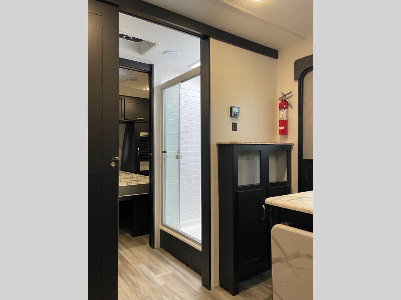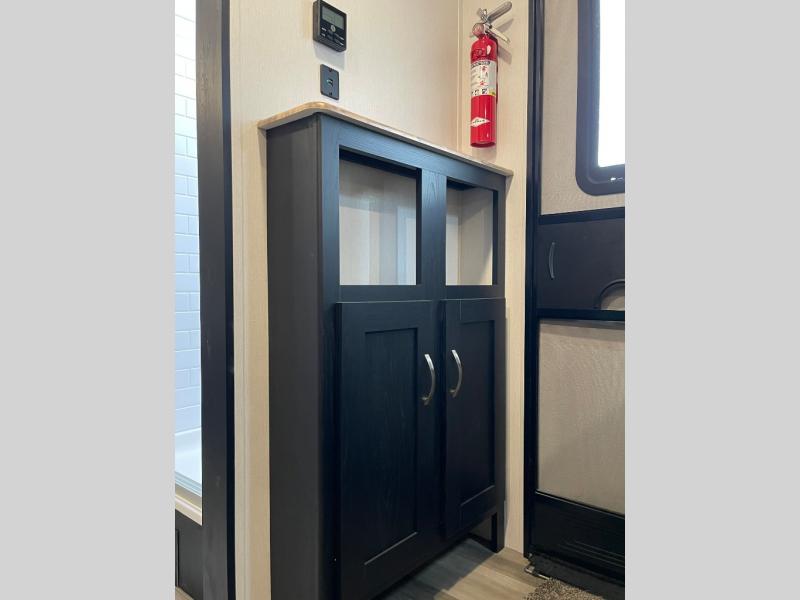 You can't go wrong with this spacious travel trailer in tow! When you arrive at the campground, prepare a quick lunch on the pull-out camp kitchen and set up the 20' power awning with LED lights. You can grab the fishing poles from the pass-through storage and head down to the lake. The walk-through bath will allow you to freshen up before dinner, and you may even want to start a game of cards at the U-shaped dinette. This model includes a simple private bunkhouse with double-size bunks, a wardrobe, and a step leading up to the top bunk, and the front master bedroom will be perfect for you and your spouse. Here, you'll find a queen bed with vaulted under-bed storage and dual wardrobes for your tablet and phone.