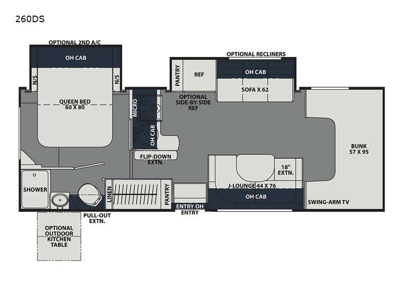The worst thing you do could is pass up this Leprechaun Class C gas motorhome! This coach is filled with exceptionally helpful amenities, like the flip-down extension in the kitchen, the J-lounge with 18" extension, the full bathroom with skylight and upgraded glass shower door, and the two pantries. You have lots of great options with this coach because there is an optional outdoor kitchen table you can add as well as an optional 2nd A/C, or dual recliners if you like. The two slides create extra space on the interior for you to relax, and the swing-arm TV will be fun to watch.