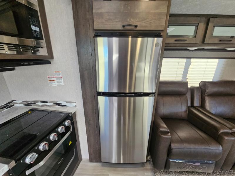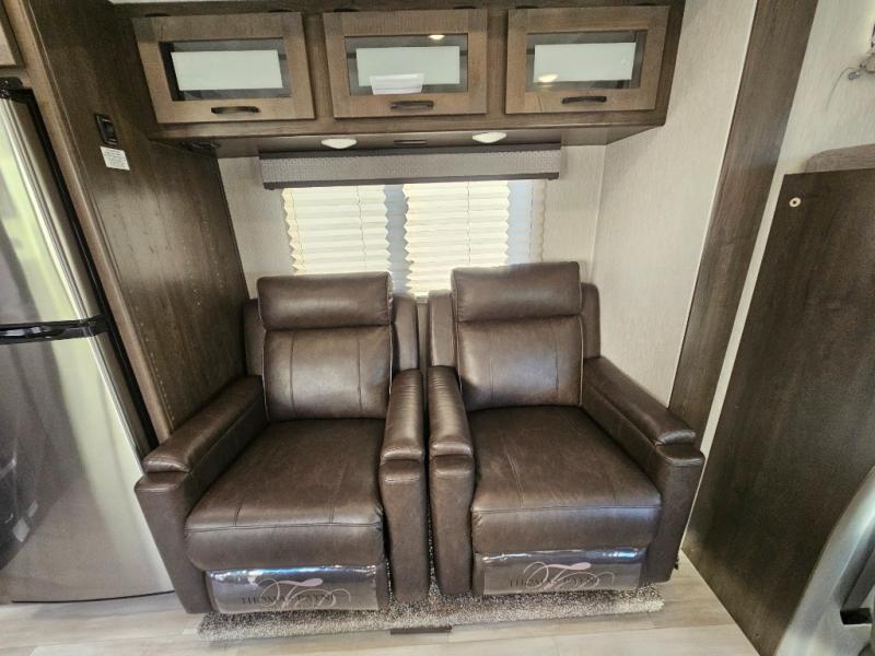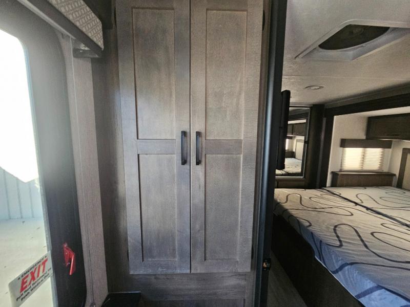 Take in the charm and style found on this Leprechaun Class C gas motorhome! The king bed slide is the perfect complement to the rear master suite, and the 44" x 76" J-lounge with 18" extension and 62" sofa are excellent additions to the living area. The kitchen has a three-burner cooktop with cover as well as a residential-size microwave oven for preparing easy meals. Take the party outside to the exterior entertainment center, or stay inside and watch the interior 39" TV.