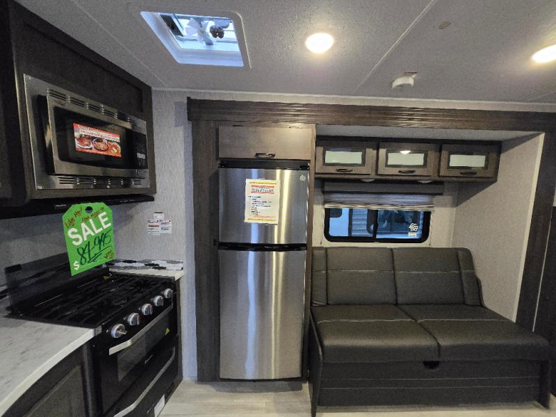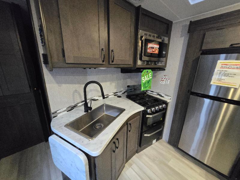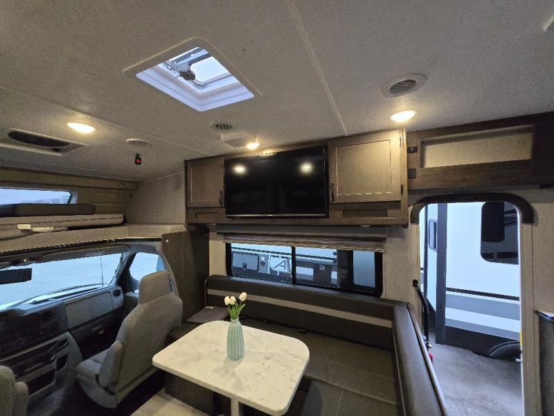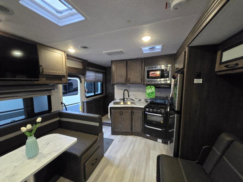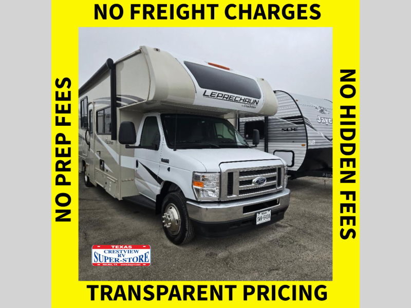 With each Leprechaun Class C gas motorhome by Coachmen you will enjoy "better" interior appointments, like the premium hardwood cabinet doors and drawer fronts, the one-piece thermofoil countertops, and the premium vinyl flooring. You will sleep soundly each night on the upgraded mattress, and staying clean will be easy with the premium showerhead and faucet in the bath. These models include reclining cockpit seats, cruise control, and a rear backup camera so you can easily get in and out of the campground. The Leprechaun is constructed with Azdel composite sidewalls, CrossFlex PVC, polyester reinforced roof material, and vacu-bond laminated walls, roof, and floor for a durable motorhome made to last.
