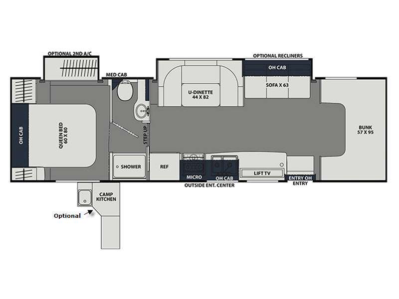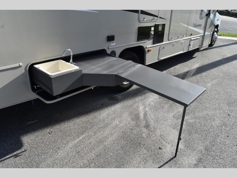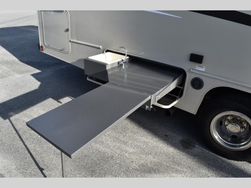 You'll have the time of your life in this Leprechaun Class C gas motorhome! There is a rear private bedroom with a queen-size bed and a wardrobe slide, and the bedroom is right next to the bathroom for convenience. Here you'll find a private toilet and sink, with the shower right across the hall, and you can close off this space to make one big bathroom if you want! Out in the main living area, there is a large slide that holds the U-shaped dinette and sofa. These pieces of furniture sit directly across from the kitchen so that you can chat with the chef while preparing meals on the three-burner range or in the residential-size microwave. If you like, you can add the optional outdoor camp kitchen which includes a sink and refrigerator with extending table so you can dine outdoors when you want as well, and the outside entertainment center will provide some fun while you're out there.