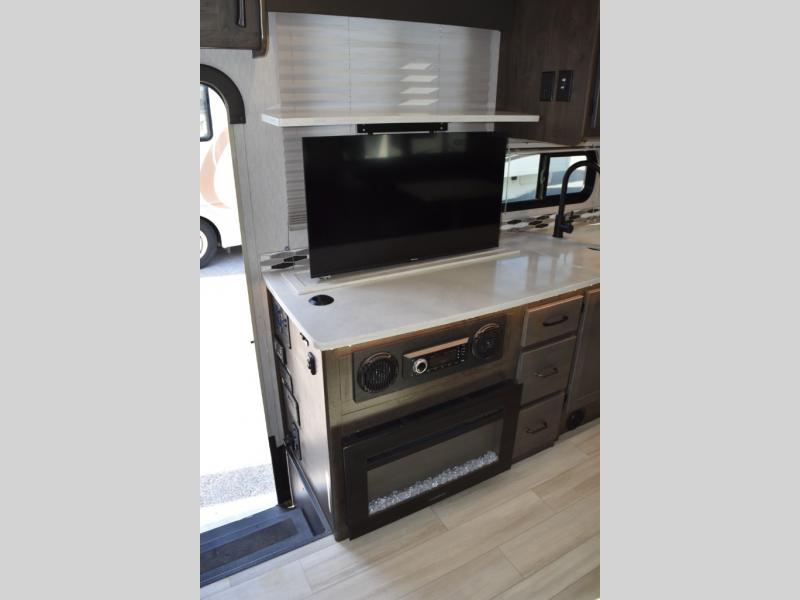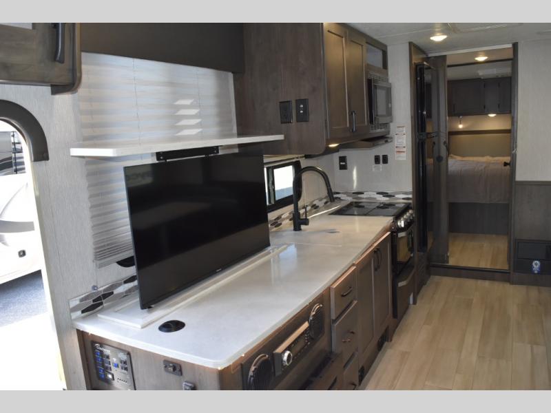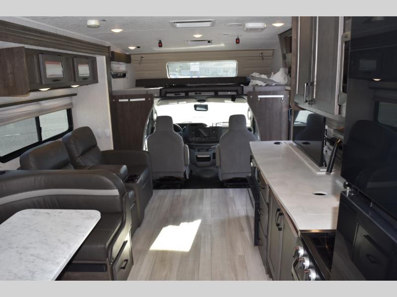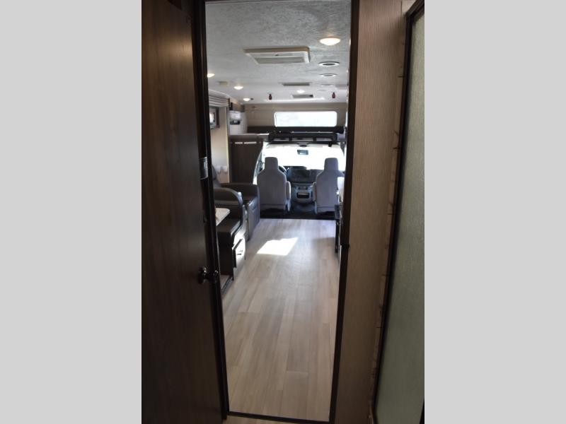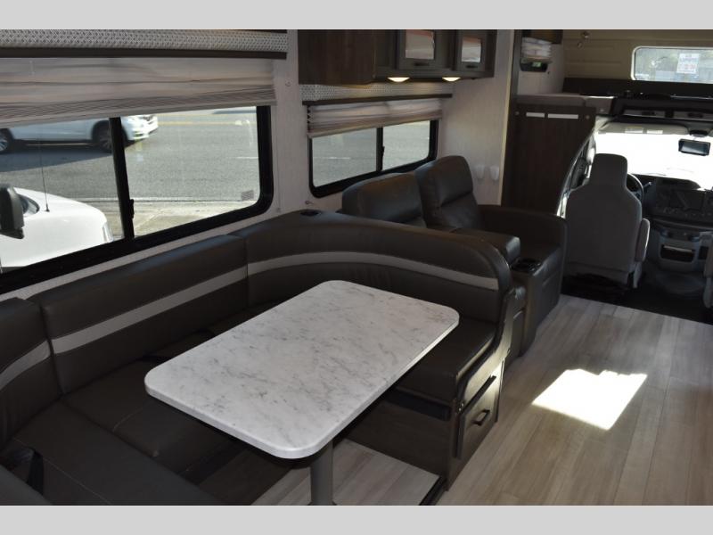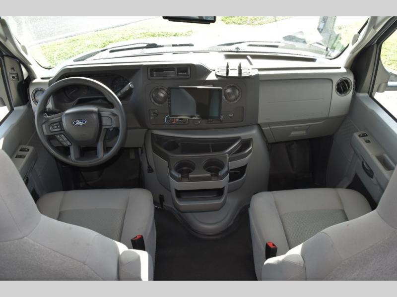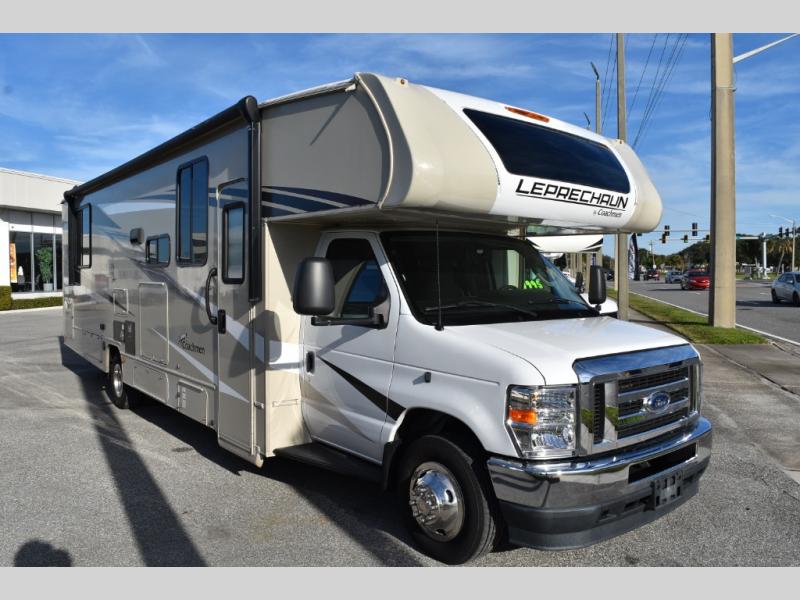 With each Leprechaun Class C gas motorhome by Coachmen you will enjoy "better" interior appointments, like the premium hardwood cabinet doors and drawer fronts, the one-piece thermofoil countertops, and the premium vinyl flooring. You will sleep soundly each night on the upgraded mattress, and staying clean will be easy with the premium showerhead and faucet in the bath. These models include reclining cockpit seats, cruise control, and a rear backup camera so you can easily get in and out of the campground. The Leprechaun is constructed with Azdel composite sidewalls, CrossFlex PVC, polyester reinforced roof material, and vacu-bond laminated walls, roof, and floor for a durable motorhome made to last.