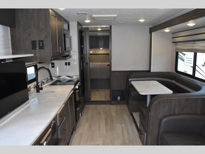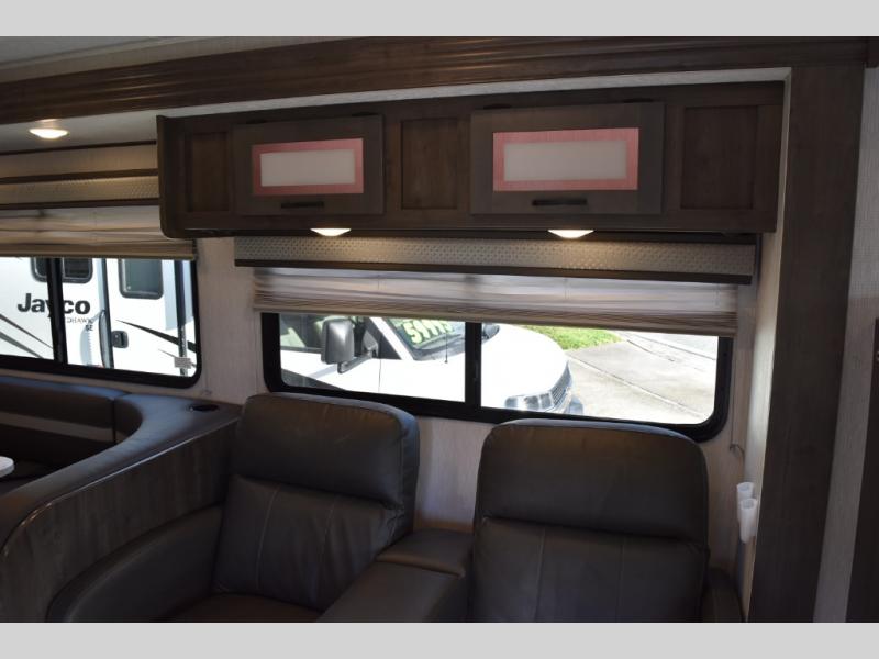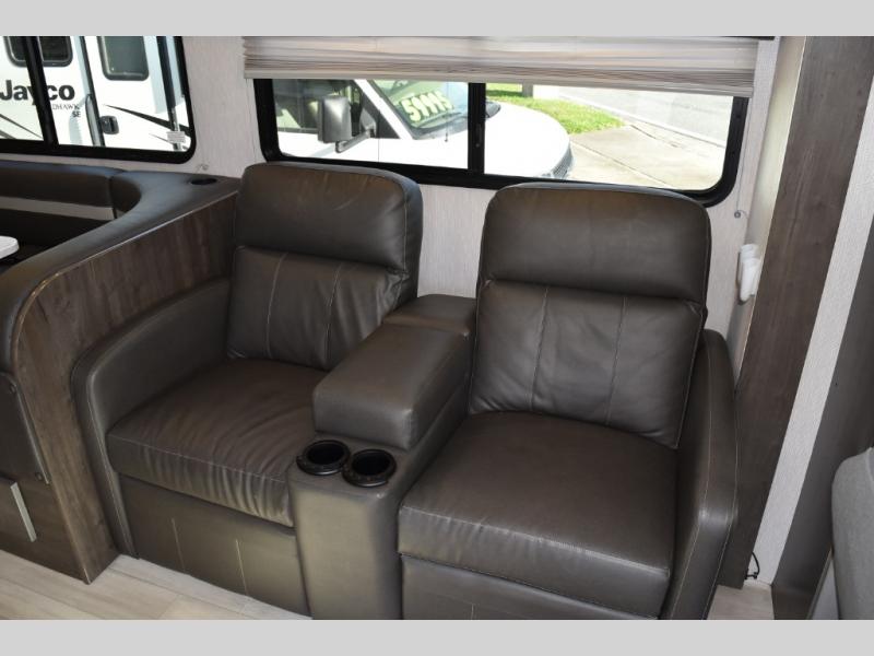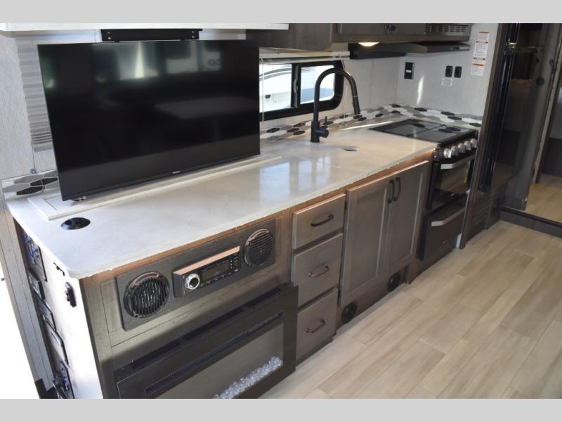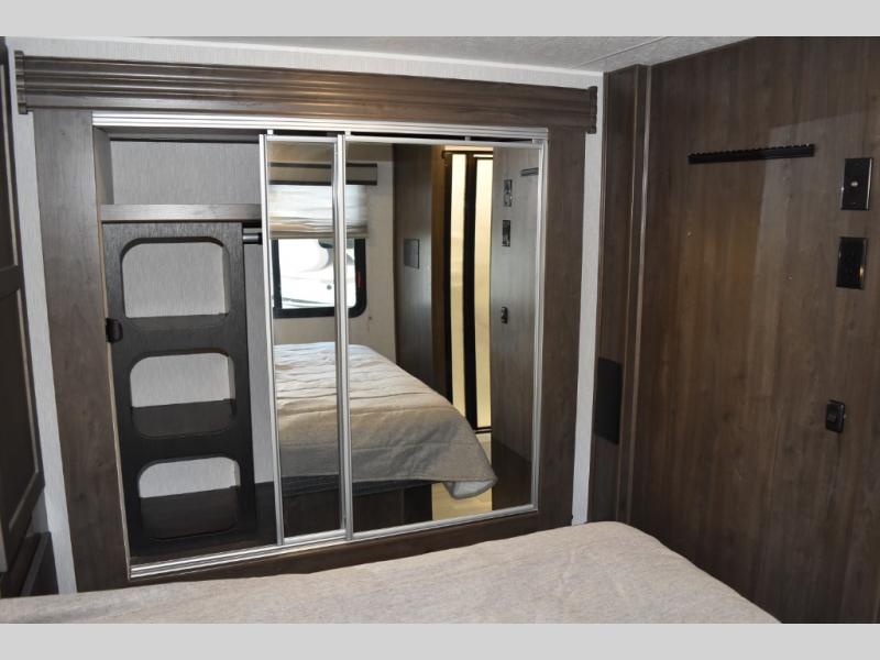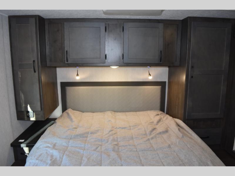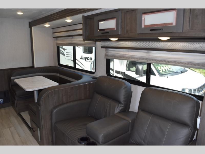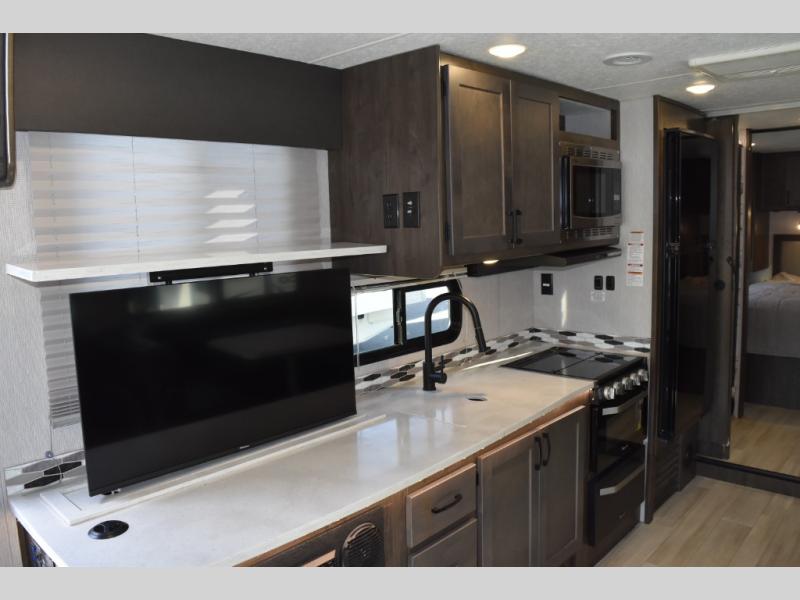 With each Leprechaun Class C gas motorhome by Coachmen you will enjoy "better" interior appointments, like the premium hardwood cabinet doors and drawer fronts, the one-piece thermofoil countertops, and the premium vinyl flooring. You will sleep soundly each night on the upgraded mattress, and staying clean will be easy with the premium showerhead and faucet in the bath. These models include reclining cockpit seats, cruise control, and a rear backup camera so you can easily get in and out of the campground. The Leprechaun is constructed with Azdel composite sidewalls, CrossFlex PVC, polyester reinforced roof material, and vacu-bond laminated walls, roof, and floor for a durable motorhome made to last.