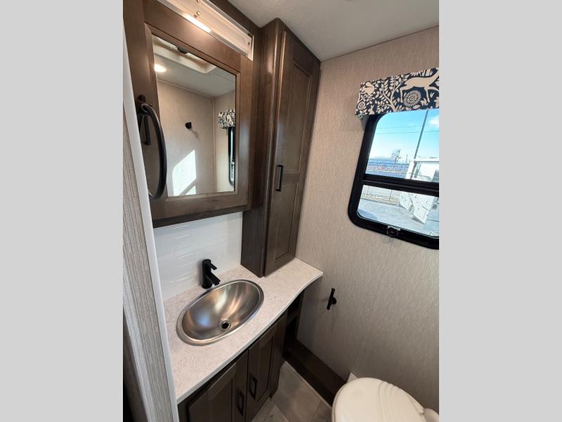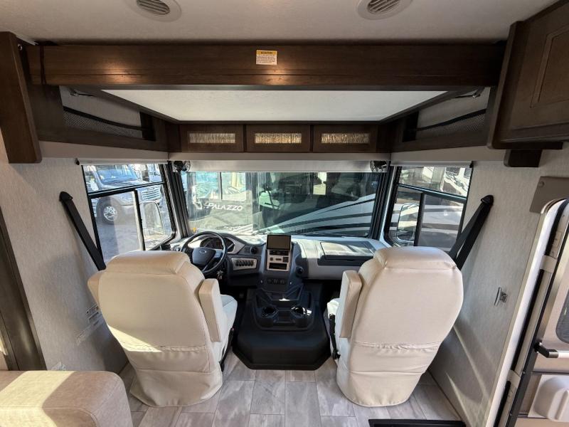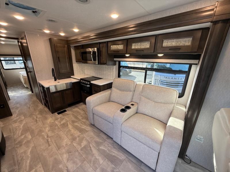 Each Mirada Class A gas motorhome by Coachmen is constructed with a crowned, laminated fiberglass roof with Azdel Superlite composite for added durability, along with high gloss "Oyster" gelcoat sidewalls. There is a 7.3L V8 engine on a Ford F53 chassis for power you can feel, and a 10" touch screen radio with AM/FM radio with Bluetooth capability. The 5.5 kW gas generator, dual coach batteries, and 100W solar panel with a controller will meet all your power needs, and the automatic leveling jacks make setting up camp a breeze. Head inside to find premium linoleum throughout, hardwood cabinet doors, kitchen tile backsplash, and solar privacy shades throughout to name a few comforts. The open road is yours for the taking in a Mirada Class A gas motorhome!