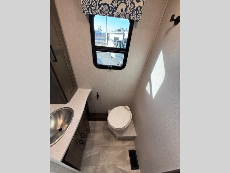 This triple slide out coach is perfect for your crew of six. The little ones will love the drop-down overhead bunk, while you take the king bed slide out in the rear bedroom. Any other guests can sleep on the sofa bed and booth dinette when they're not being used to dine at or relax. You'll love cooking in the fully-equipped kitchen with a stainless residential refrigerator, a three burner range, plus a stainless over-the-range microwave. This model features a private sink and lavy, with the shower just across the hall so two people can freshen up at once, and you'll find plenty of storage space throughout for all your belongings. There is even a stackable washer and dryer prep if you plan to go full-time!
