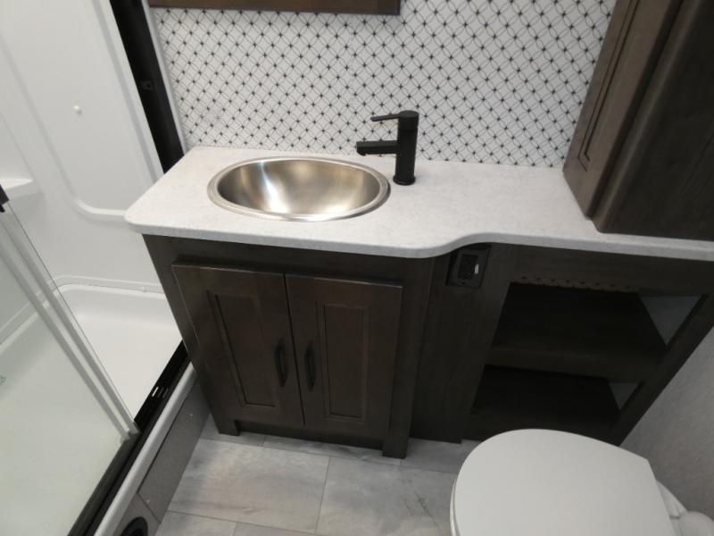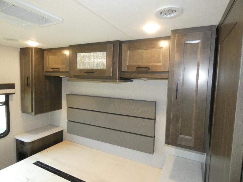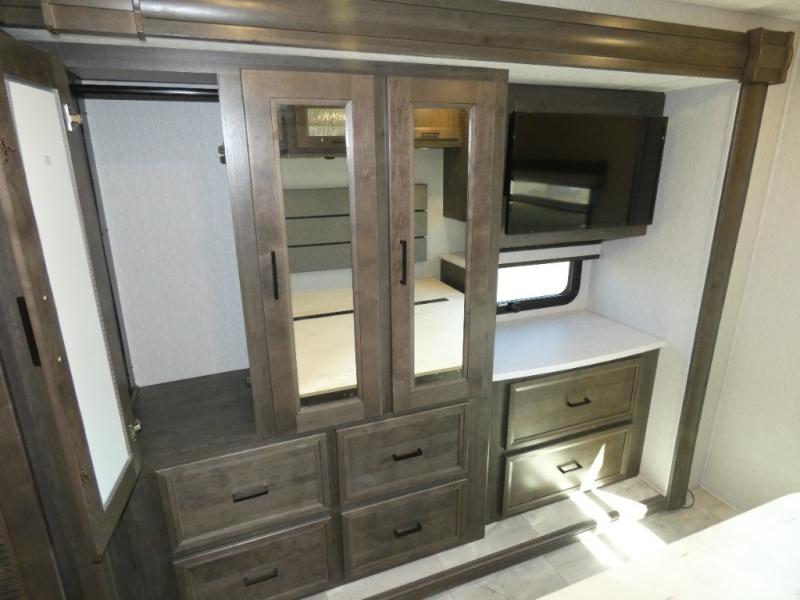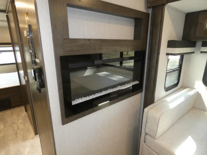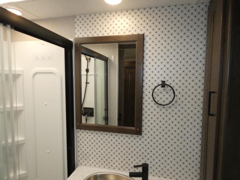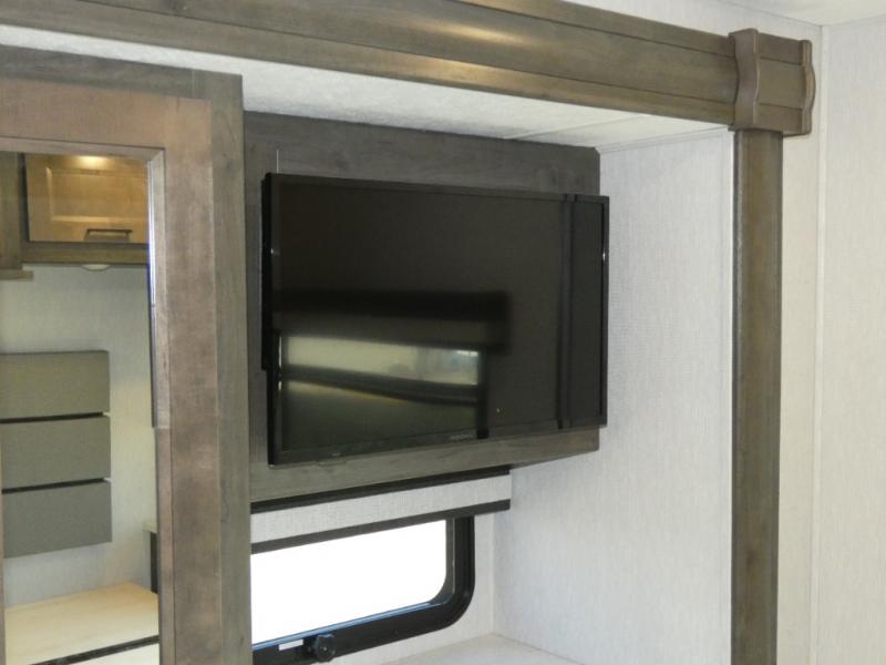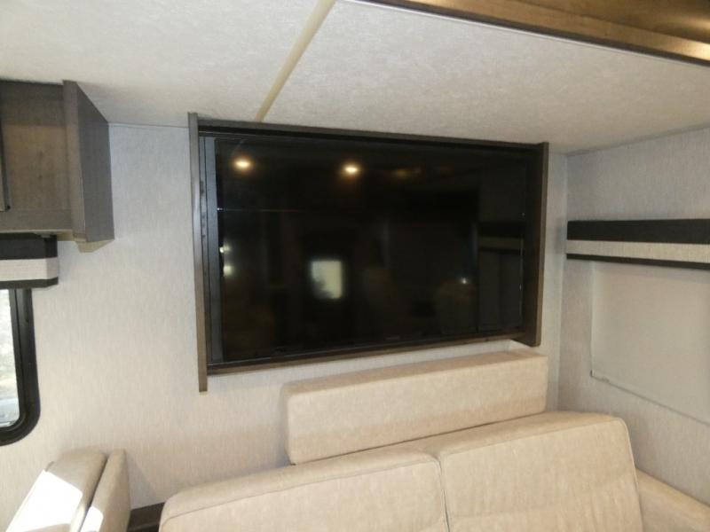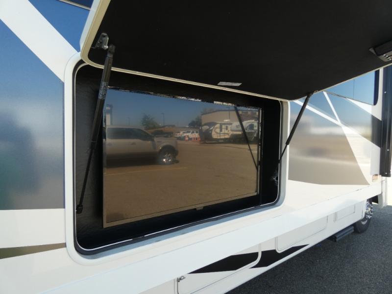 Your family will love this spacious coach for trips across the country or your local state park. The swivel captain's seats provide more seating, along with the sofa bed, theater seating and booth dinette. There is a 50" LCD TV for rainy day movies and an exterior LED TV under the 20' power awning if the weather is cooperating. The full bath includes a glass shower door, plenty of counter space, and a shower skylight for added light, and the rear bedroom will be your oasis away from it all. Here, you'll find a king bed, a wardrobe for your clothes, plus a 32" LCD TV.