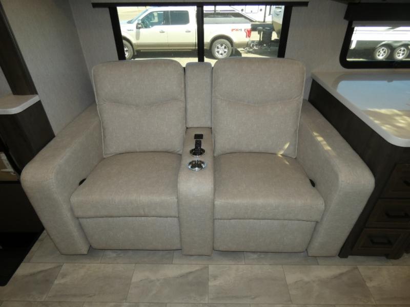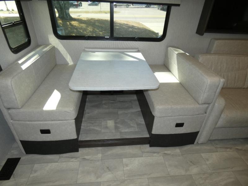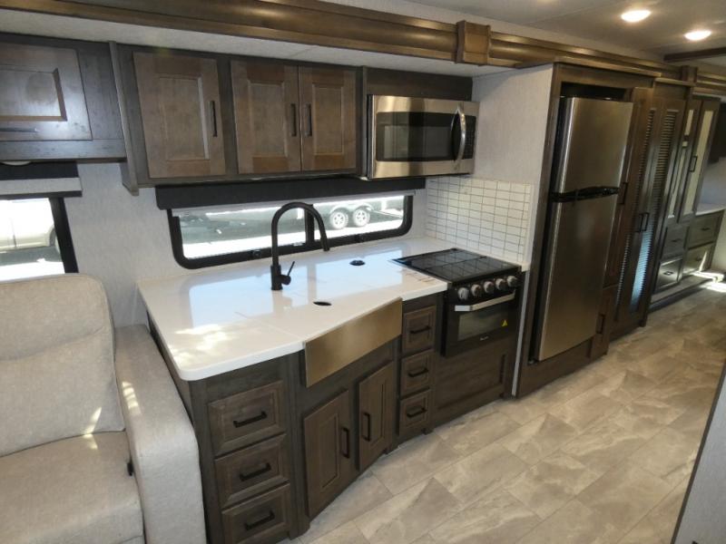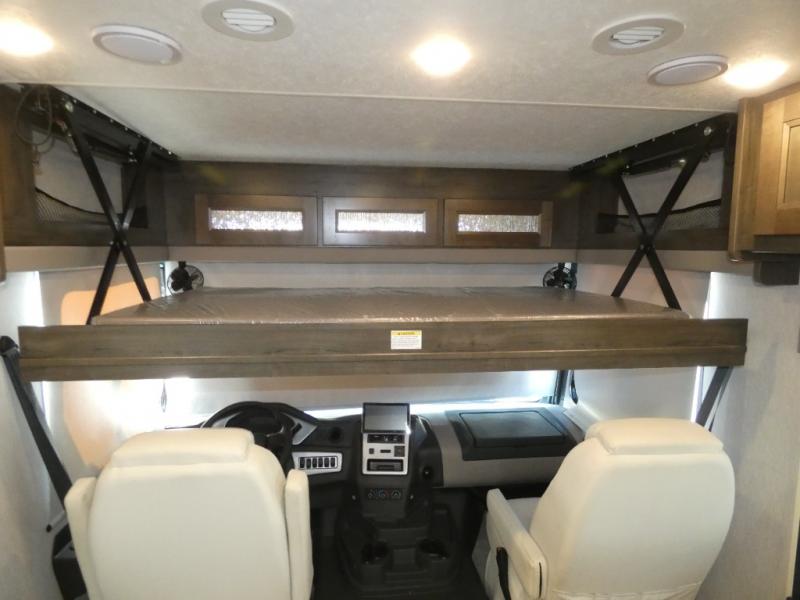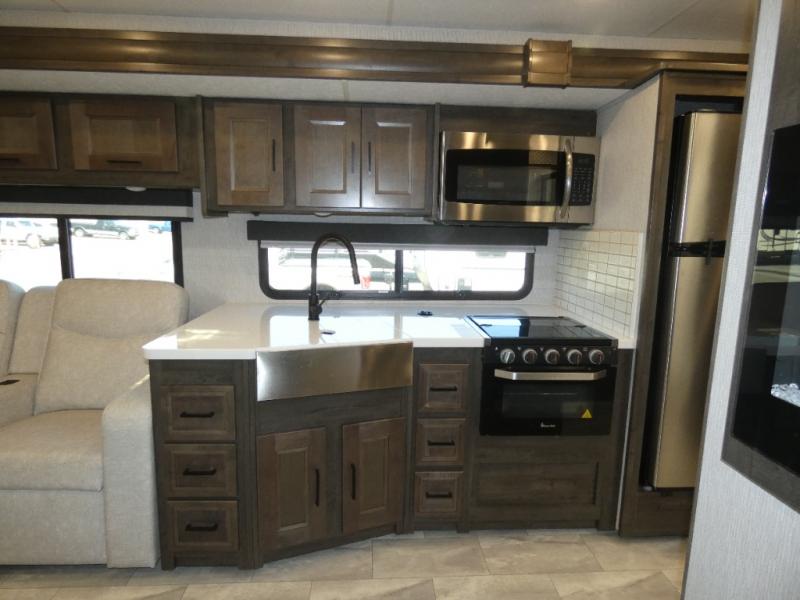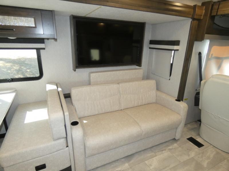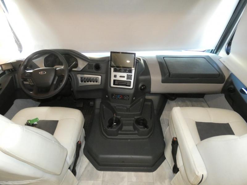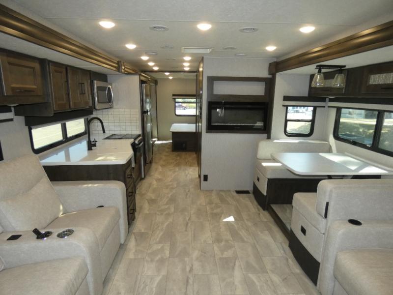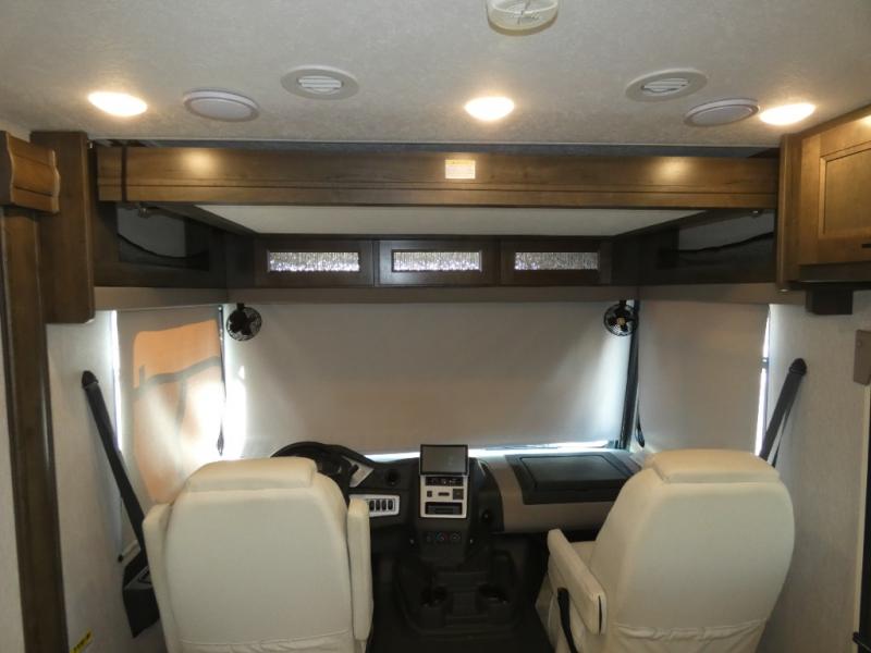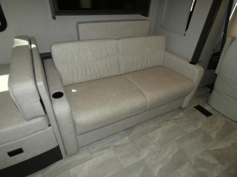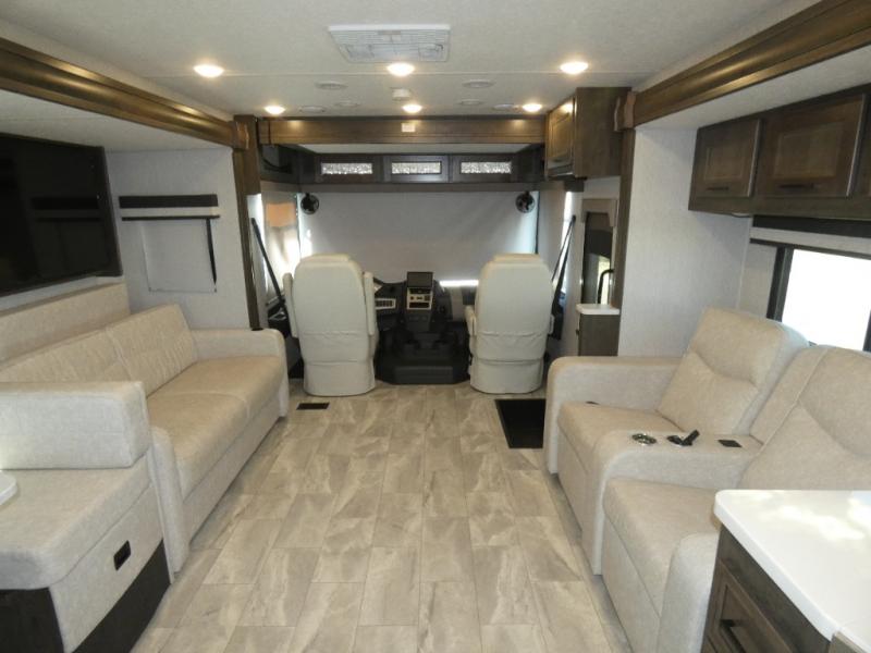 Each Mirada Class A gas motorhome by Coachmen is constructed with a crowned, laminated fiberglass roof with Azdel Superlite composite for added durability, along with high gloss "Oyster" gelcoat sidewalls. There is a 7.3L V8 engine on a Ford F53 chassis for power you can feel, and a 10" touch screen radio with AM/FM radio with Bluetooth capability. The 5.5 kW gas generator, dual coach batteries, and 100W solar panel with a controller will meet all your power needs, and the automatic leveling jacks make setting up camp a breeze. Head inside to find premium linoleum throughout, hardwood cabinet doors, kitchen tile backsplash, and solar privacy shades throughout to name a few comforts. The open road is yours for the taking in a Mirada Class A gas motorhome!