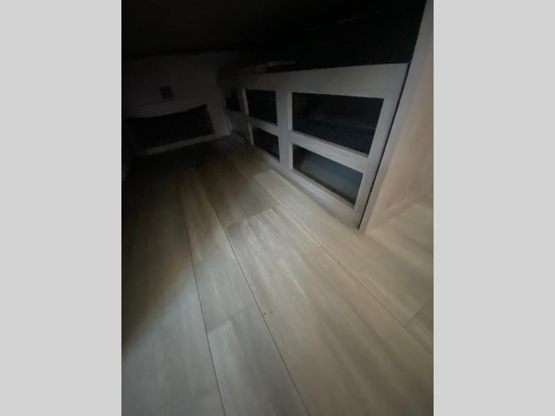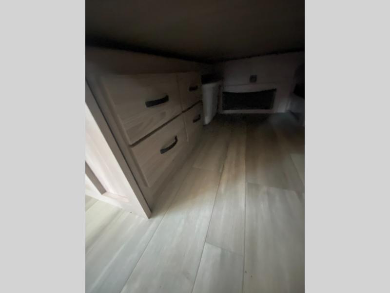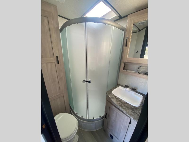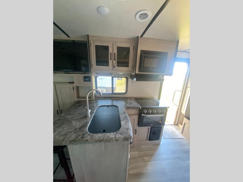 Sleep like royalty at any campsite when you have this trailer setup. You will find the interior is spacious with a slide out sofa including end tables for your drinks and cellphones, and the rear corner bathroom is convenient with a radius shower and linen storage. Your dog can stay clean as well with the exterior dog wash and the dog leash clip will keep them safely at the campsite. While outside you might decide to relax under the power awning, and store a few items in the pass-through compartment up front including fishing poles. And the cook will love the L-shaped counter, the appliances, the sink cover hide-away space, the hutch and the bar stools when wanting to take a break or visit with friends.
