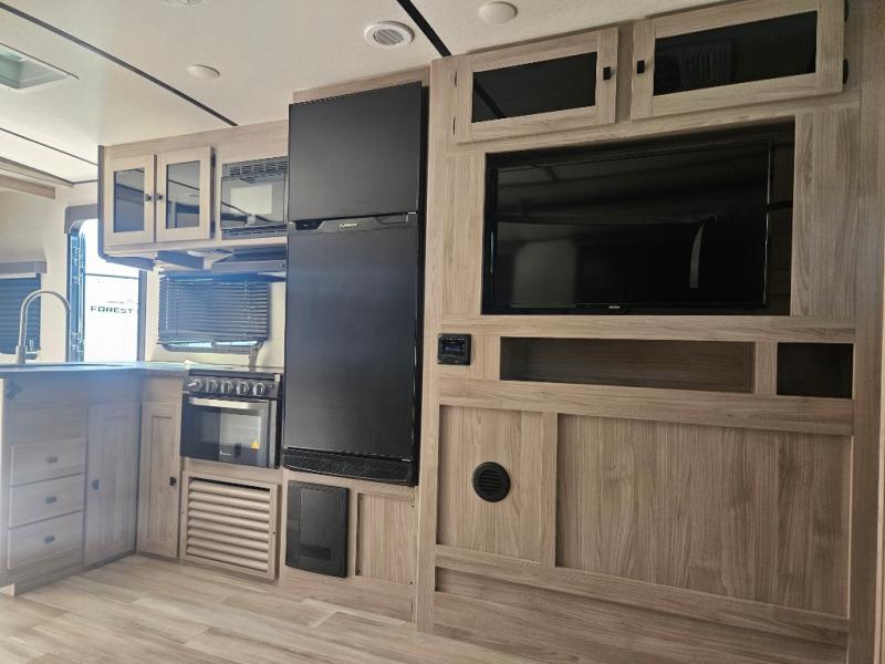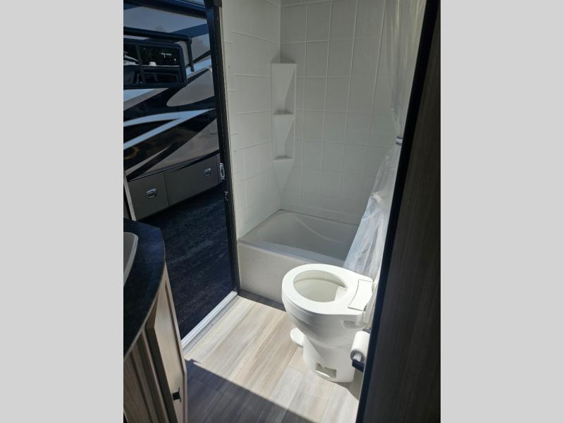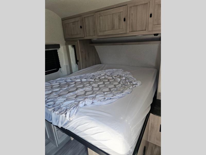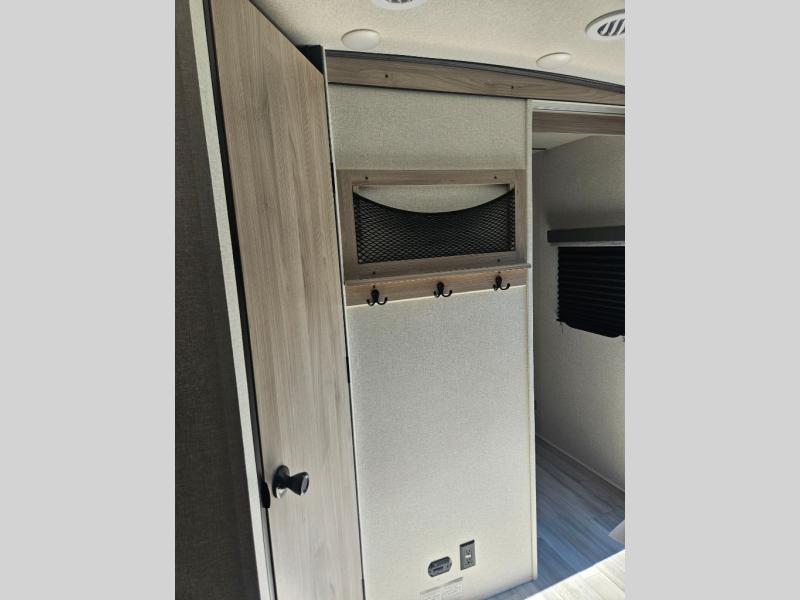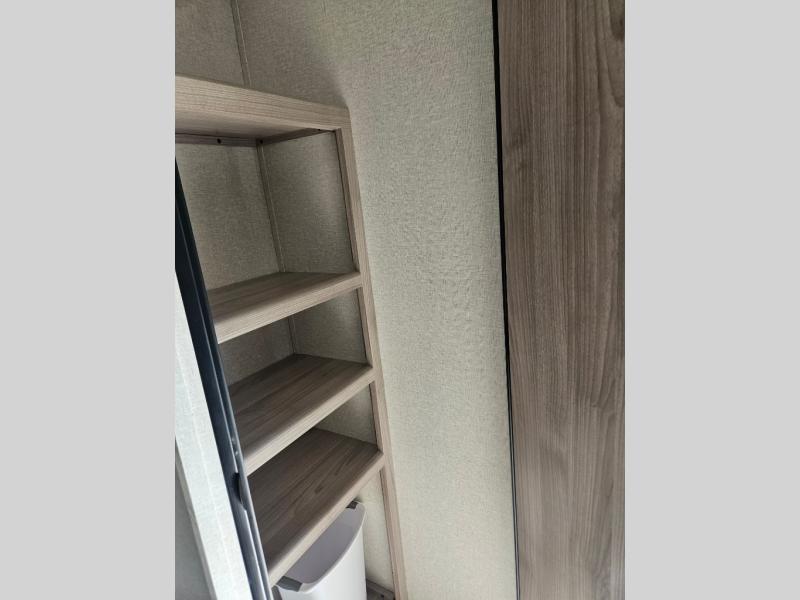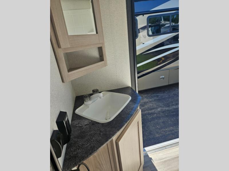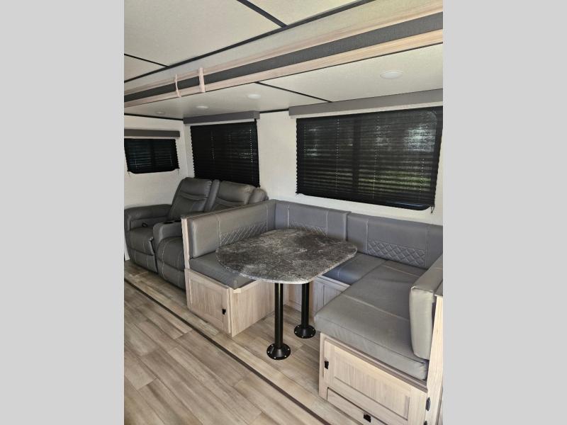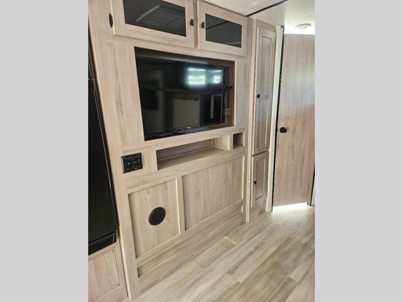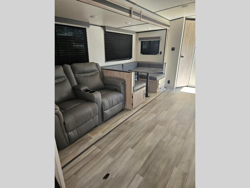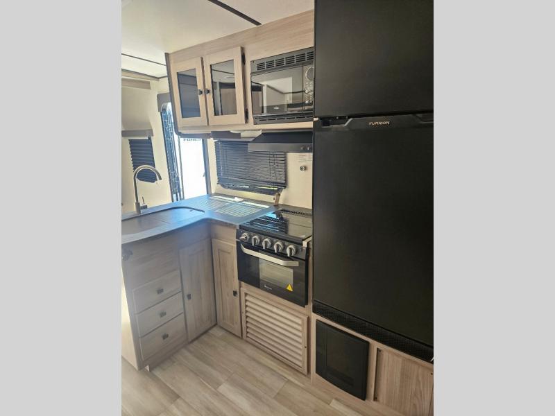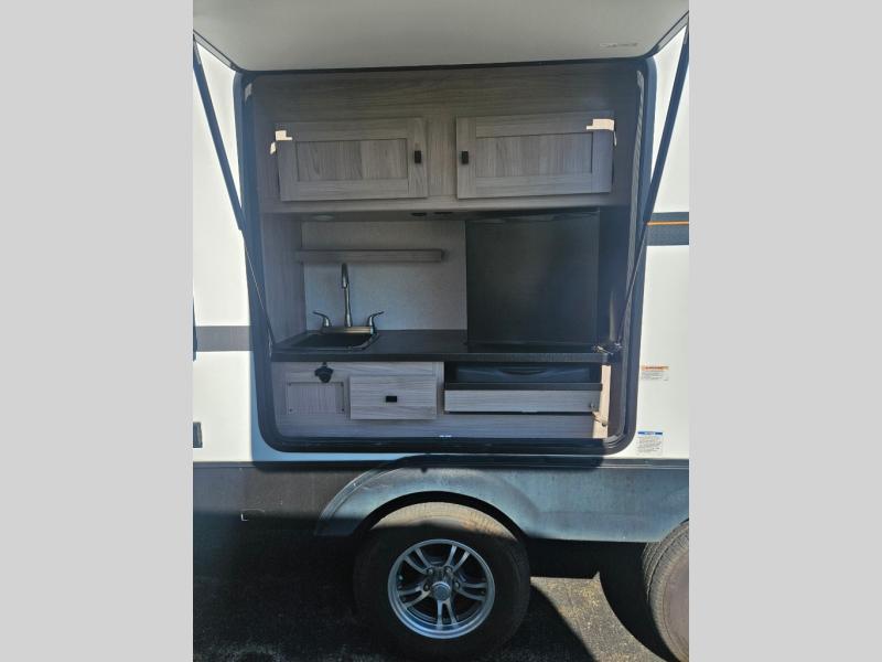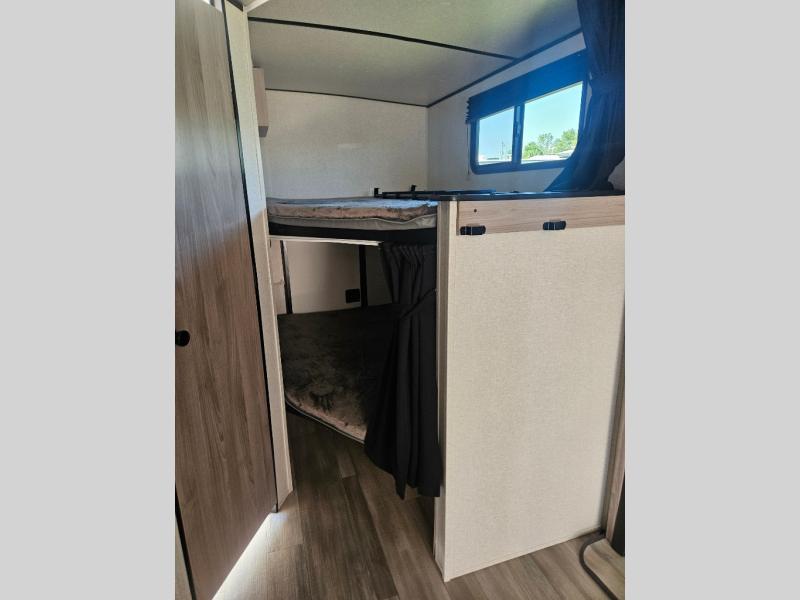 This is a popular bunk trailer for a larger family thanks to having the convenience of dual entry doors allowing access to the main living and kitchen area and near the front bedroom, and into the full bathroom for a quick in and out when playing outside. The bathroom also includes a hamper for convenience. The Stor-More cargo door allows you to place items from the exterior to the interior under the lower flip bunk for safe travels to your destinations and back home. The kids will surely love the convenience centers when playing or sleeping in a bunk. There is a sofa and U-shaped slide including a pet center for relaxing and feeding your pet. The kitchen includes full amenities plus a pantry to store lots of goodies for everyone. Along the exterior, the outside camp kitchen will come in handy when you have everyone at the campsite for dinner and the power awning offers some protection from the elements.