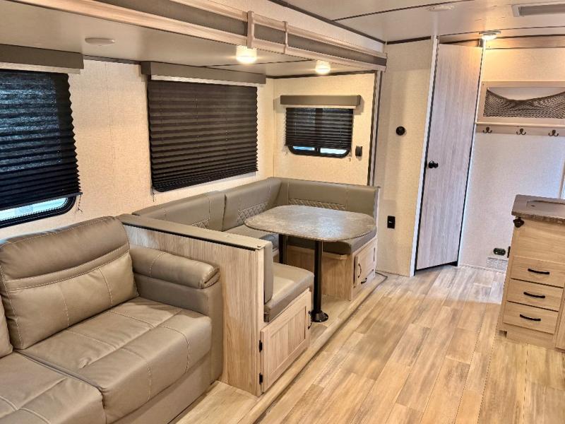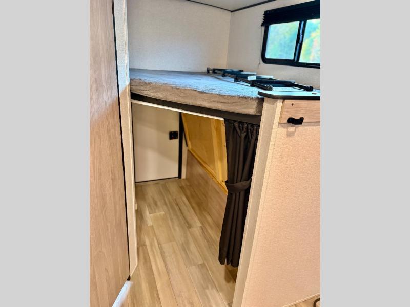 This is a popular bunk trailer for a larger family thanks to having the convenience of dual entry doors allowing access to the main living and kitchen area and near the front bedroom, and into the full bathroom for a quick in and out when playing outside. The bathroom also includes a hamper for convenience. The Stor-More cargo door allows you to place items from the exterior to the interior under the lower flip bunk for safe travels to your destinations and back home. The kids will surely love the convenience centers when playing or sleeping in a bunk. There is a sofa and U-shaped slide including a pet center for relaxing and feeding your pet. The kitchen includes full amenities plus a pantry to store lots of goodies for everyone. Along the exterior, the outside camp kitchen will come in handy when you have everyone at the campsite for dinner and the power awning offers some protection from the elements.