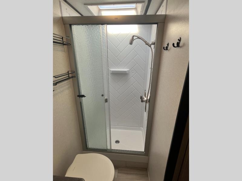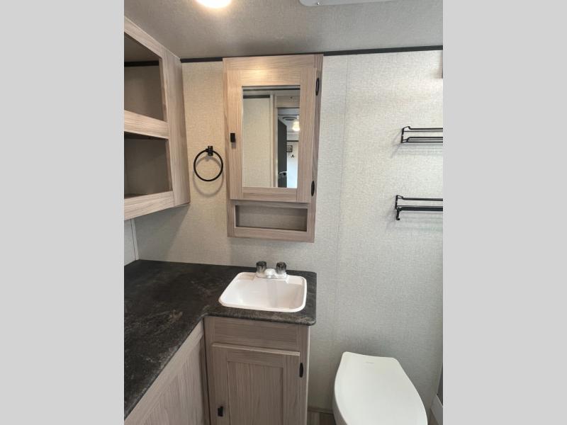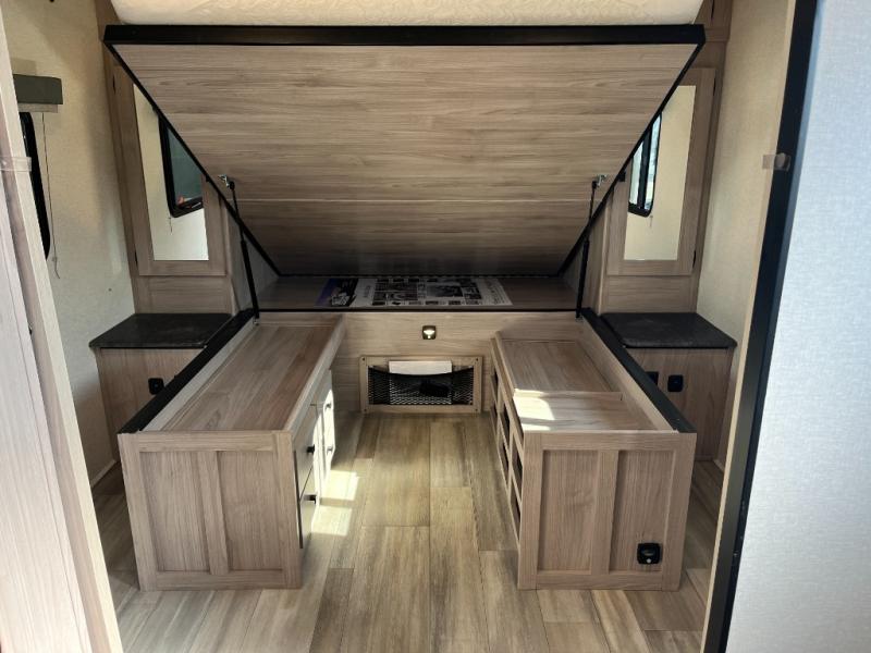 It's time to upgrade from that old tent to this spacious travel trailer for four. You will enjoy the front private bedroom with a queen bed and dual wardrobes, while your guests sleep on the U-shaped dinette within the slide out. In the morning you can all gather around the dinette for coffee, then head outside to sit under the 15' power awning. Breakfast can be made on the outside camp kitchen with a two burner cooktop, and extra chairs can be found in the pass-through storage. Spend your days hiking, biking, or swimming at the lake, and when you return, the full rear bath will be waiting for you to clean up before bed.