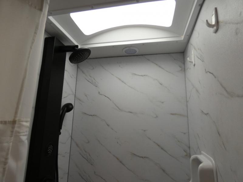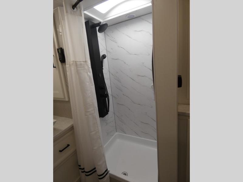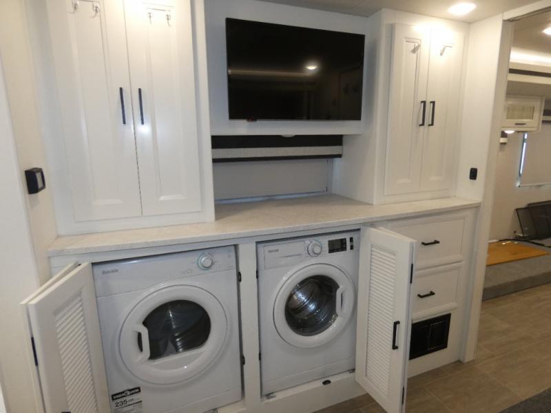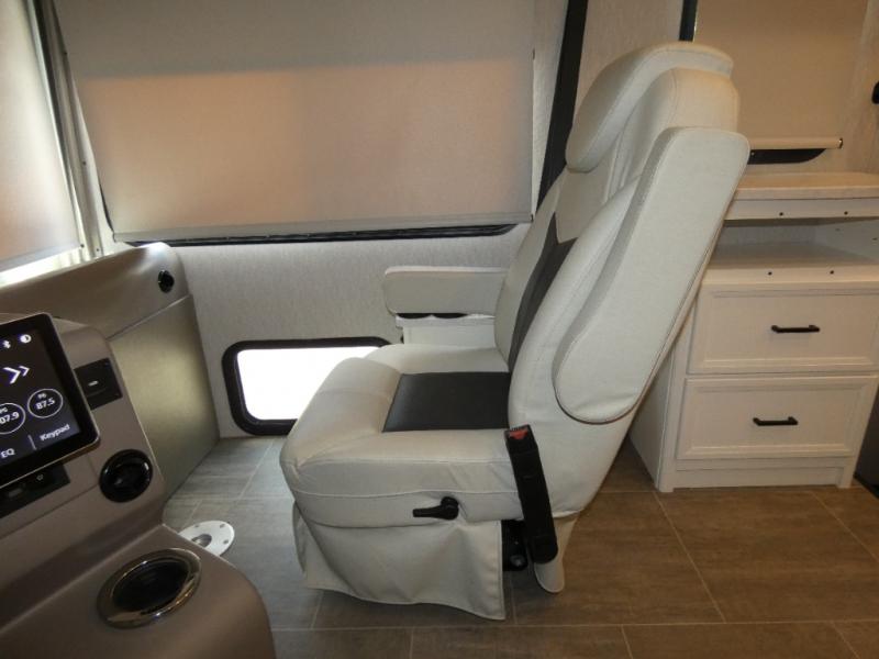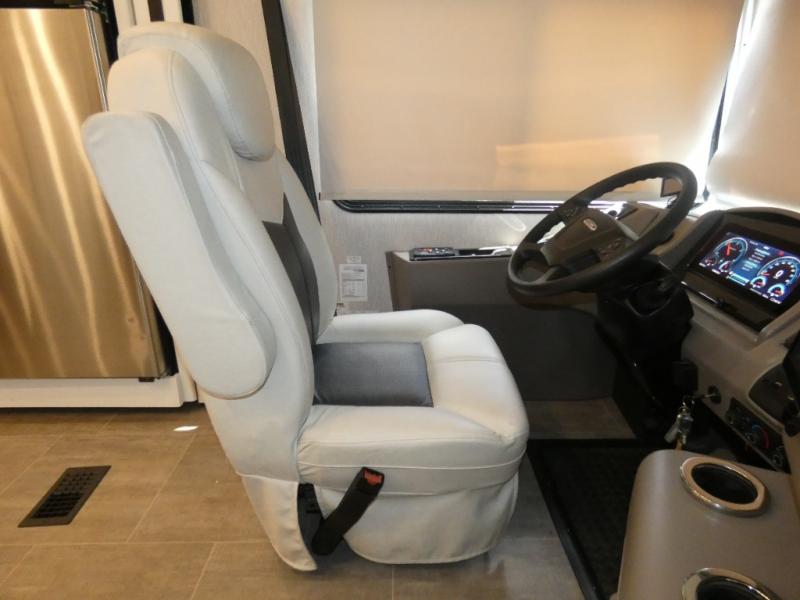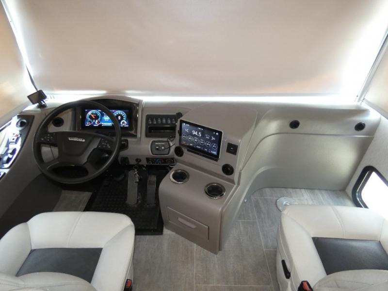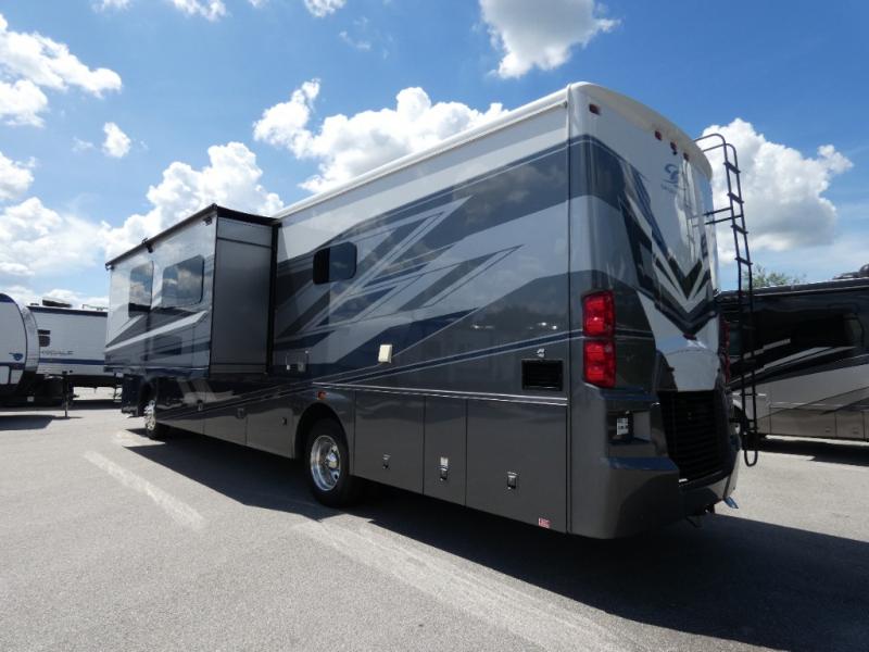 The Sportscoach SRS Class A diesel motorhome by Coachmen sits on a straight rail Freightliner chassis with a 340 HP ISB Cummings rear diesel engine that will deliver power to your excursions. Each coach features chassis air suspension and air brakes, an 8,000 lb. towing hitch, and an outside entertainment center with a 40" TV to watch the big game outdoors. Some of the electrical, heating, and AC amenities you will appreciate are the 6.0 kW diesel generator, the 100 watt solar panel with a controller, and the two 15,000 BTU A/C units. The galley features convenient pop-up recept with USB ports, stylish kitchen backsplash, and a stainless steel farmhouse style sink that will make clean-up easier than ever. Comfort will come easy with the upgraded mattress in the bedroom, along with a residential style headboard and a king bed. Affordable, powerful, and comfortable; what's not to love about the Sportscoach SRS Class A diesel coach!