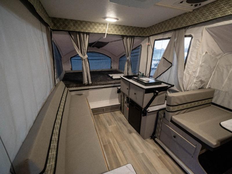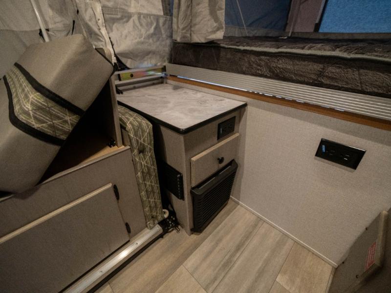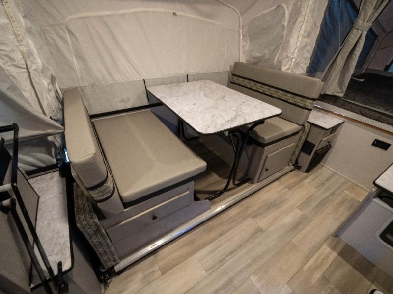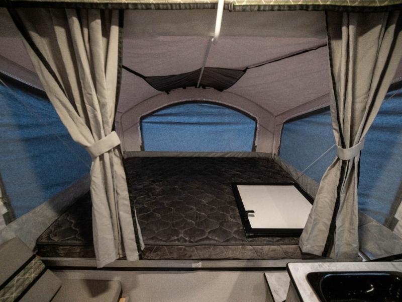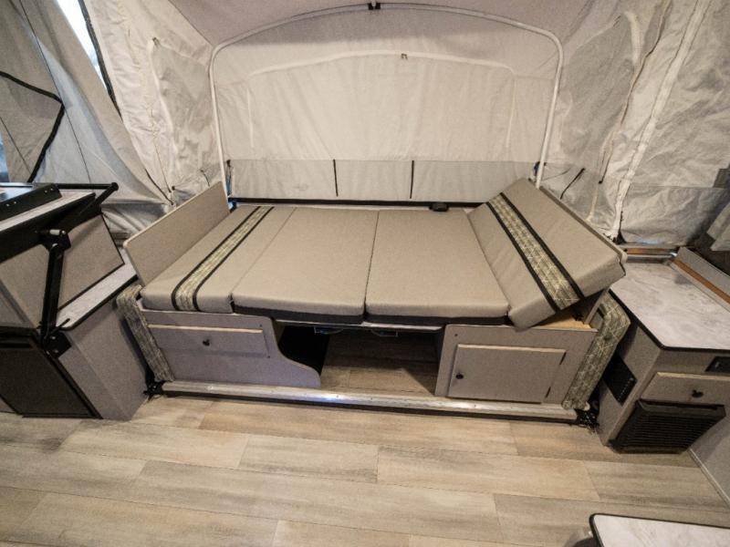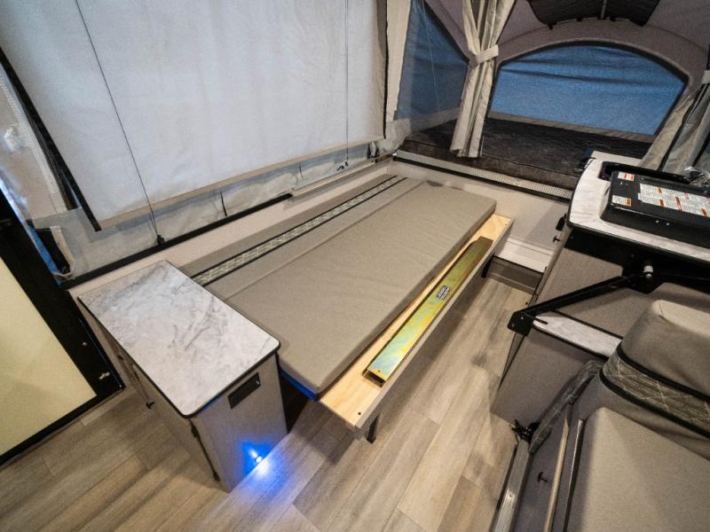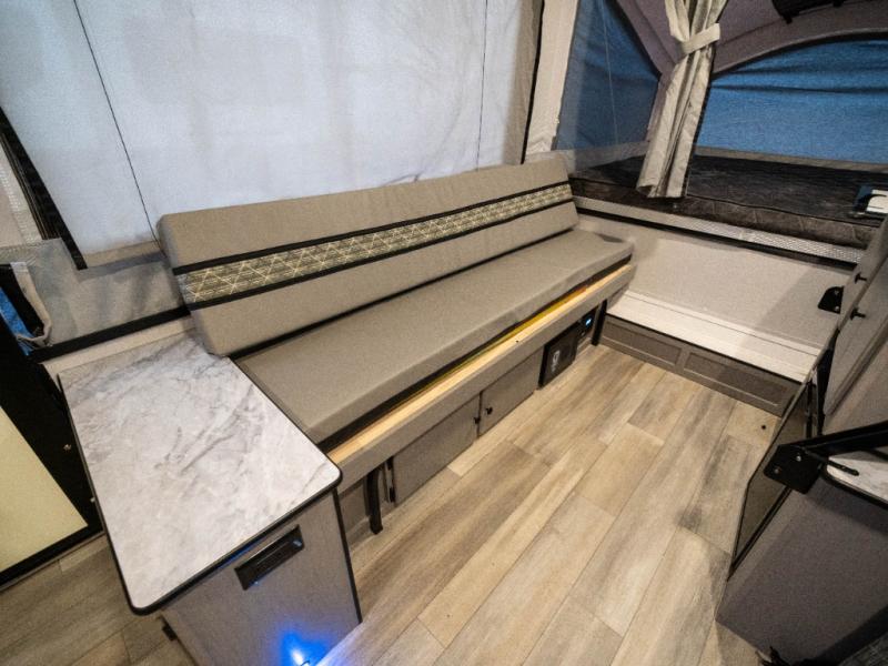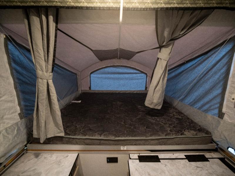 Enjoy more interior space in this camper with the booth dinette slide out. You'll find under-seat storage here, as well as storage by the Gaucho bed. The bathroom package will come in handy so you don't have to use the camp's facilities in the middle of the night, and two burner high output range will be perfect for eggs and bacon in the mornings. After a day of exploring you'll want nothing more than to get a great night's rest on the queen and king tent end beds!