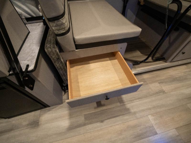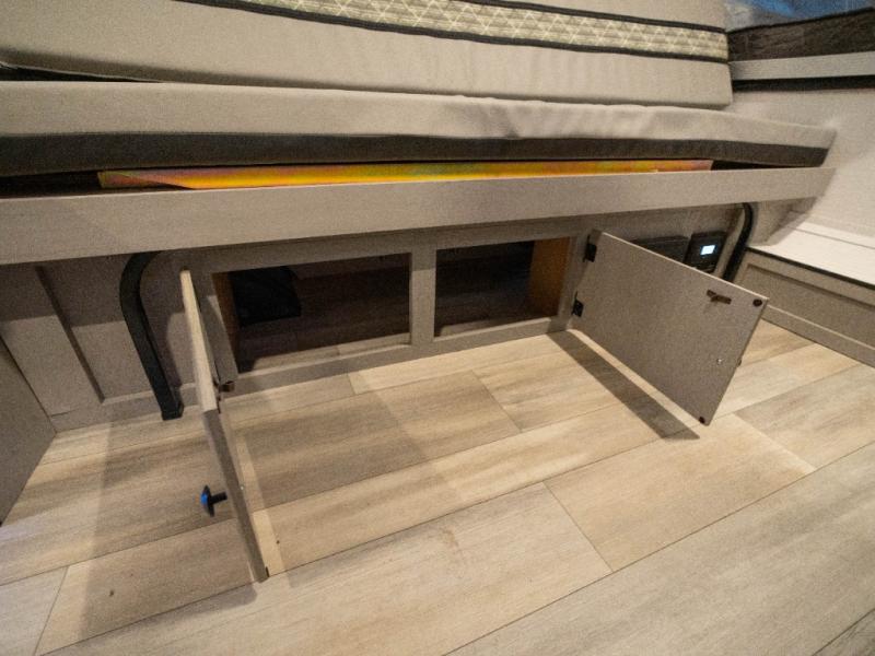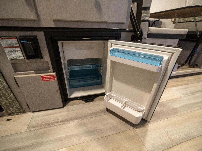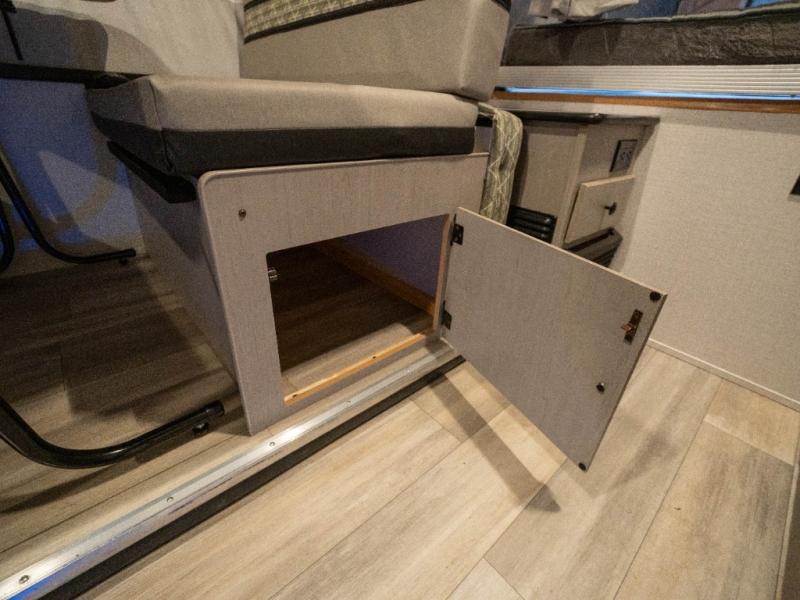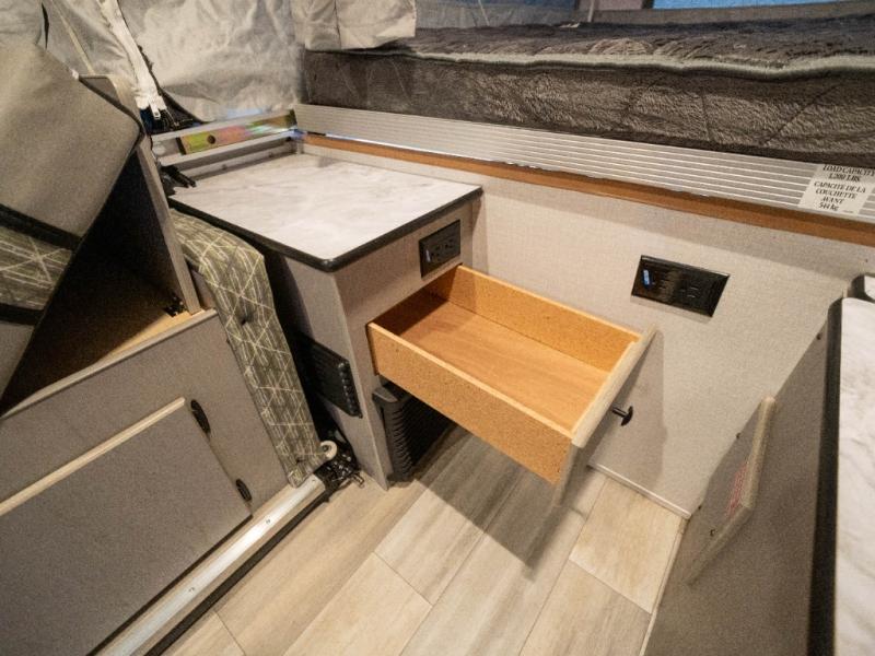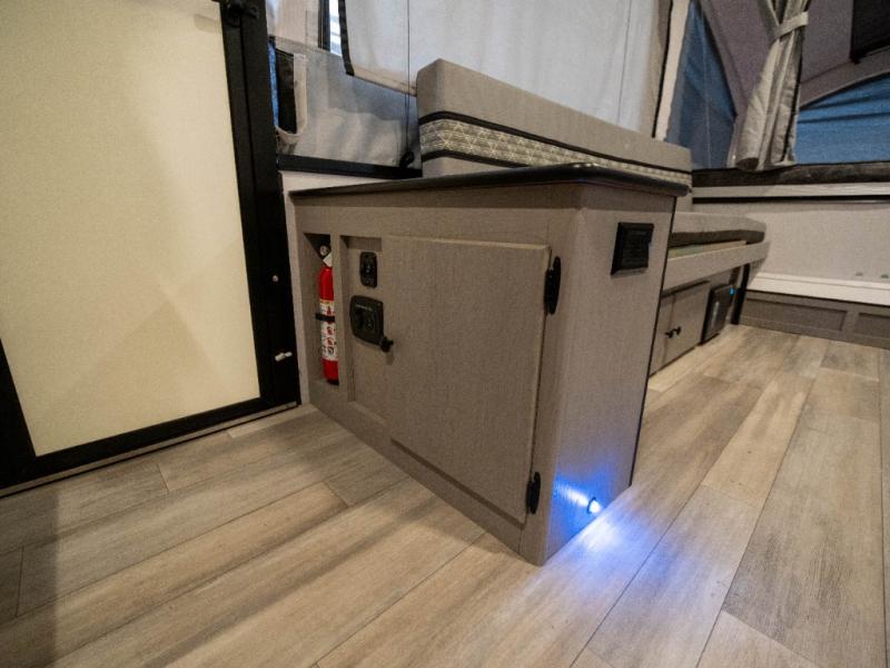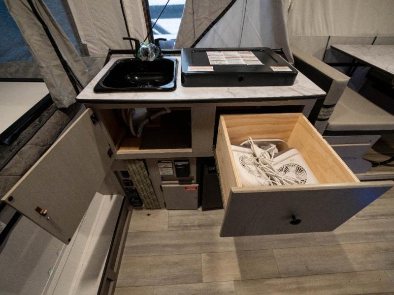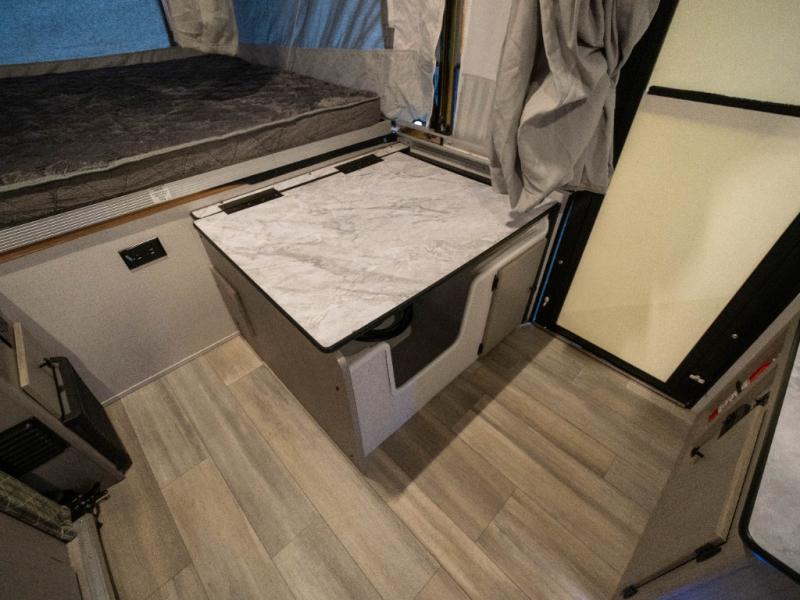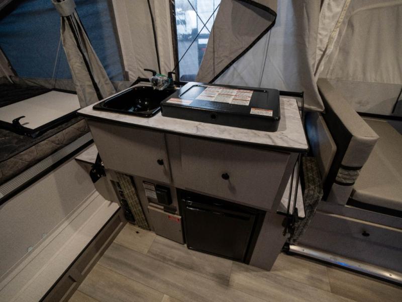 Enjoy more interior space in this camper with the booth dinette slide out. You'll find under-seat storage here, as well as storage by the Gaucho bed. The bathroom package will come in handy so you don't have to use the camp's facilities in the middle of the night, and two burner high output range will be perfect for eggs and bacon in the mornings. After a day of exploring you'll want nothing more than to get a great night's rest on the queen and king tent end beds!