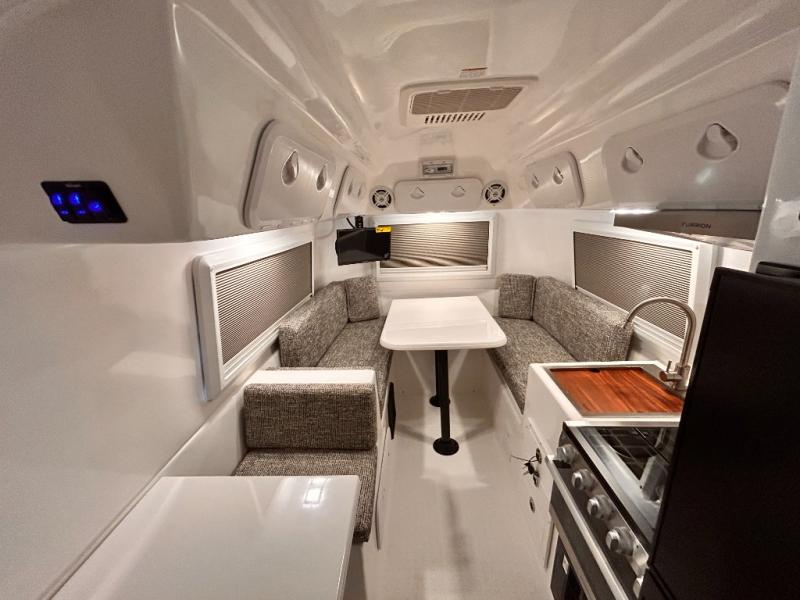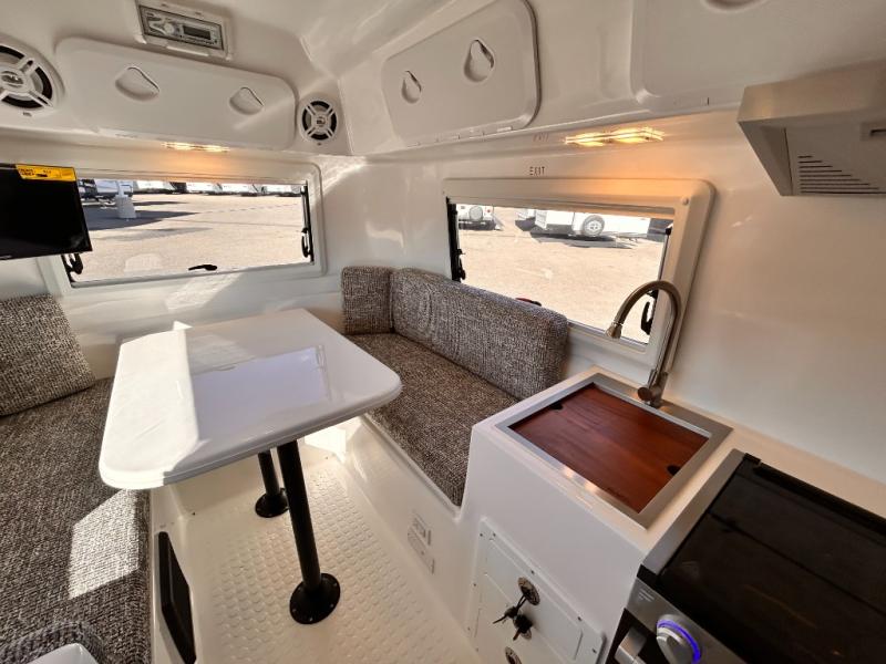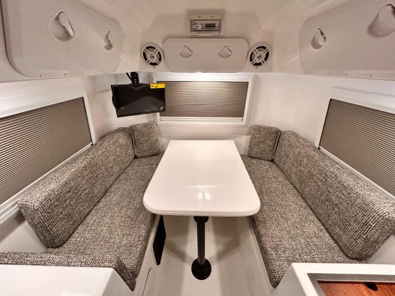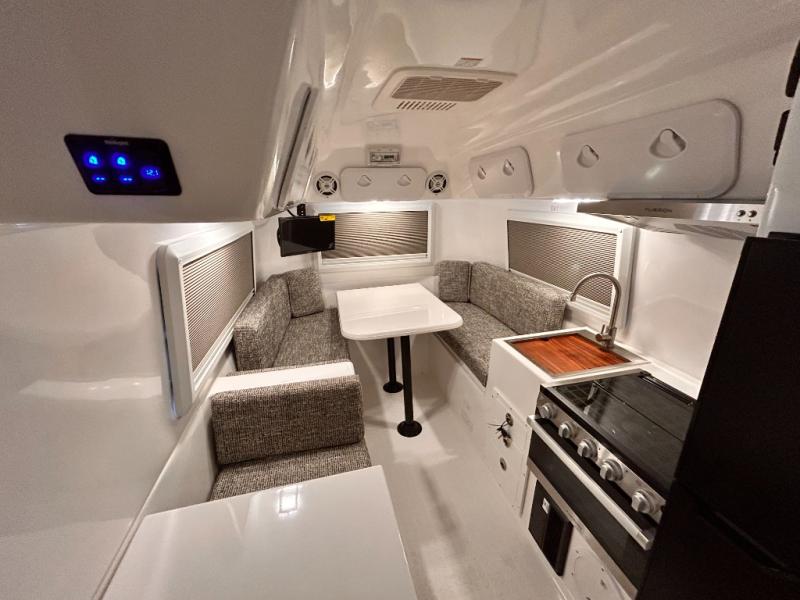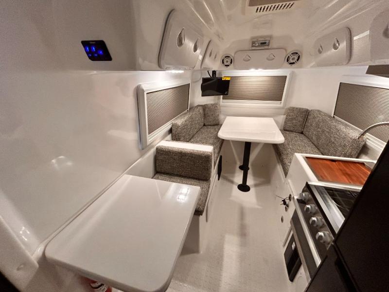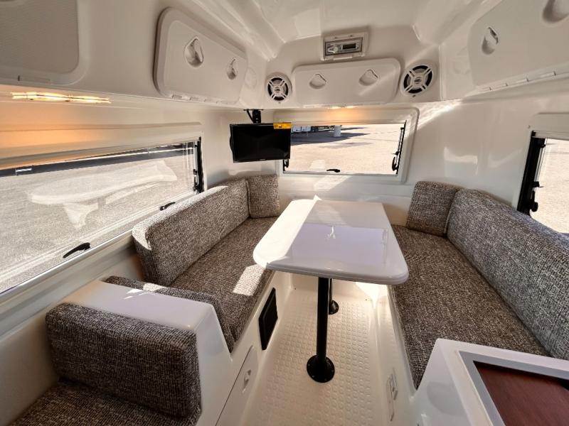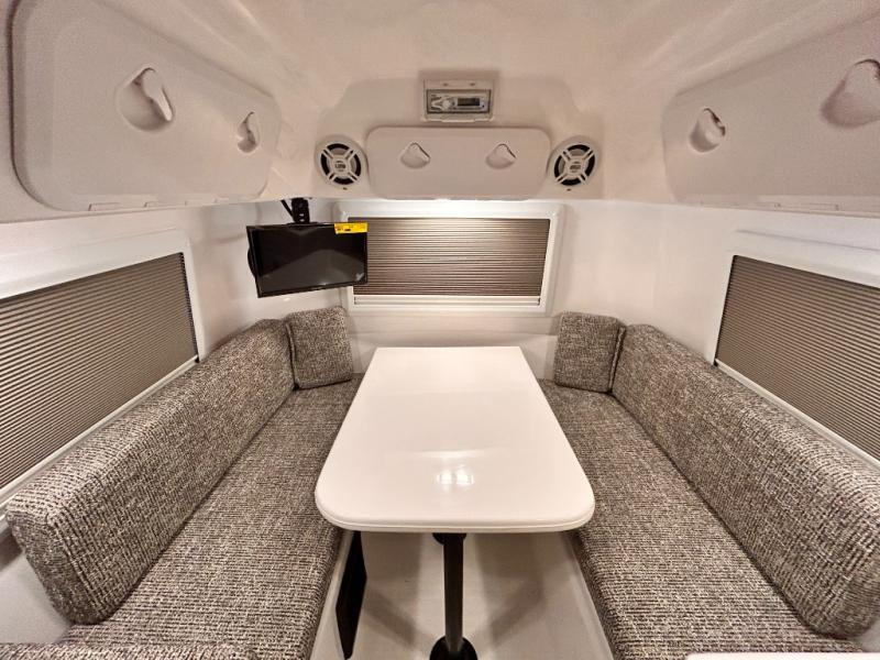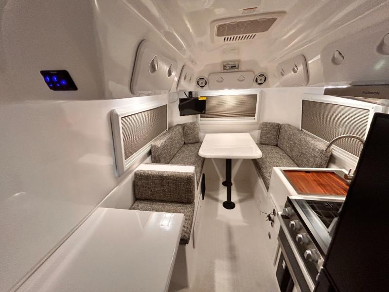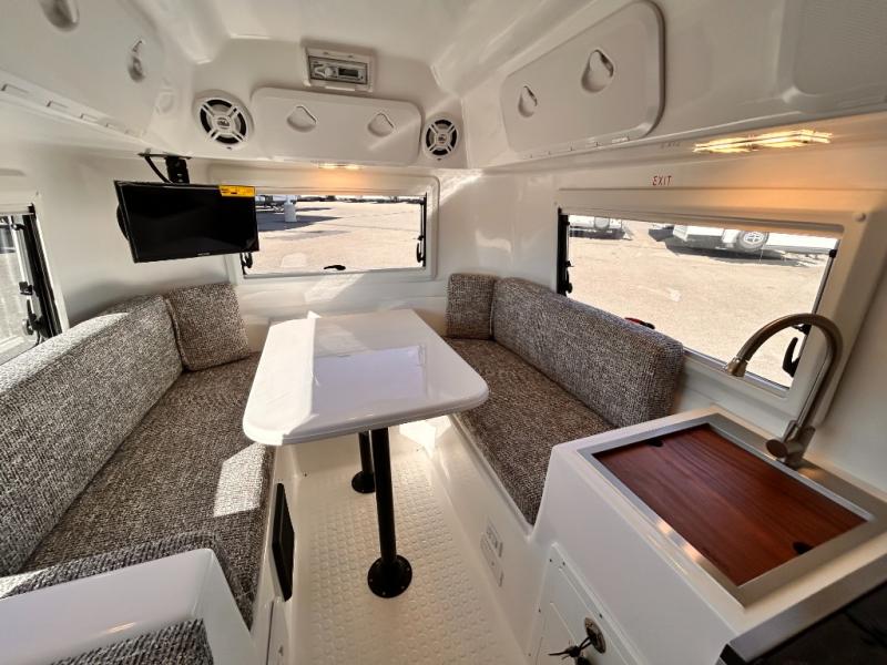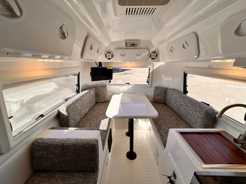 The perfect couples trailer featuring a rear dinette that can easily be converted into a double bed for sleeping. There is a second seat with table that is forward facing off the door side. A wet bath features a shower, toilet, and sink with an exhaust fan to take out the steam, and a enclosed waterproof toilet paper holder. You will enjoy the hand-held multi-setting sprayer when showering. There are also ten ABS marine access storage hatches, plus storage beneath the dinette seat. When relaxing you might want to add the optional 19" Smart LED TV for movie nights!
