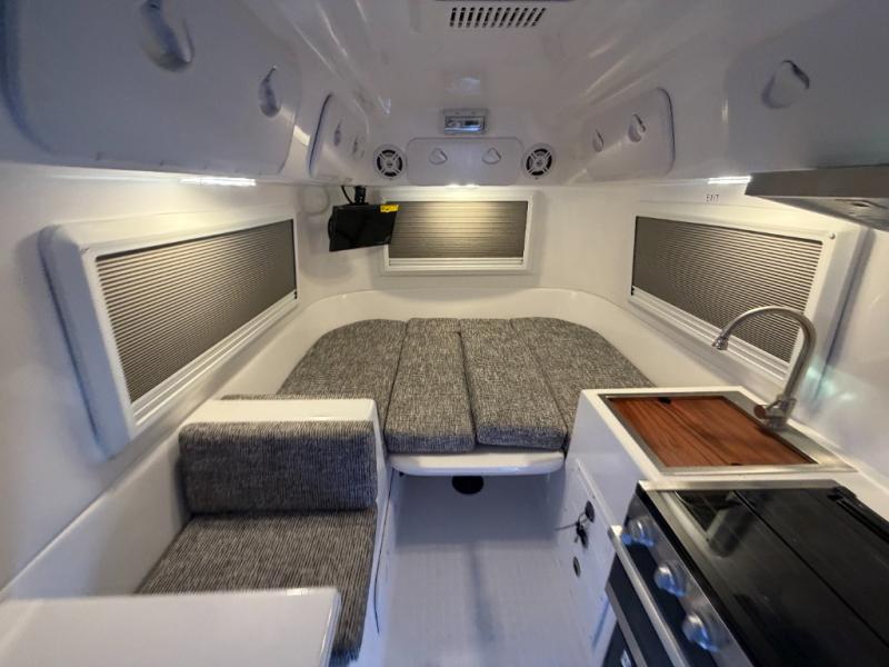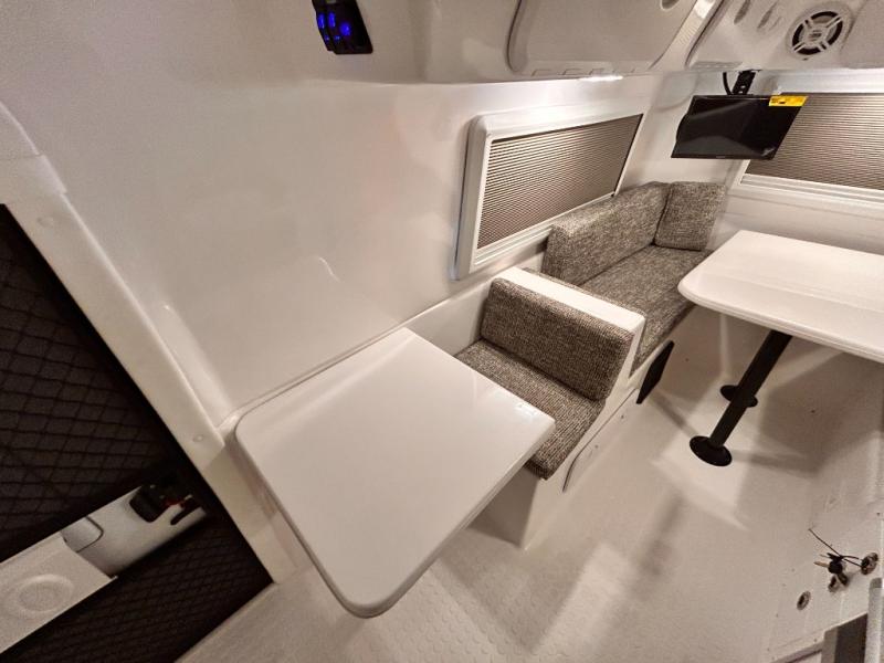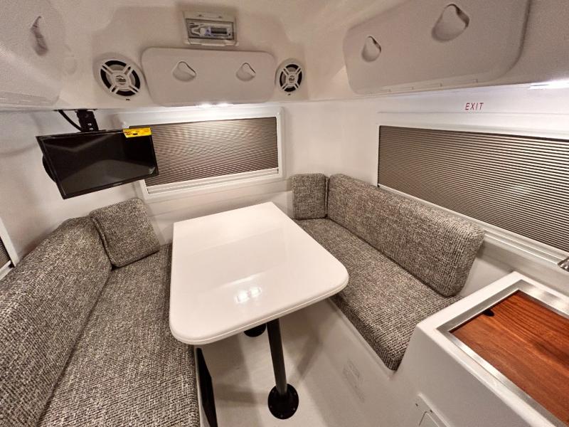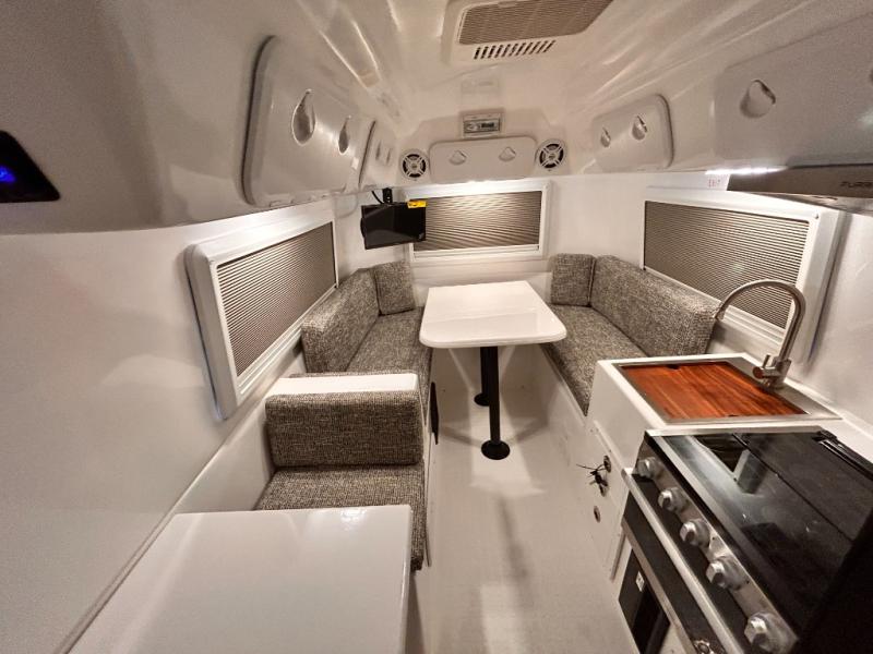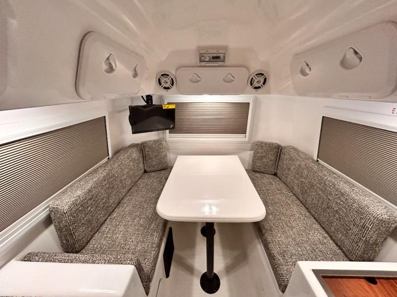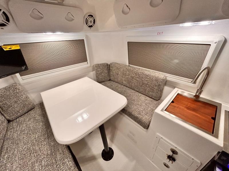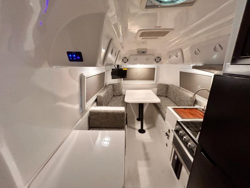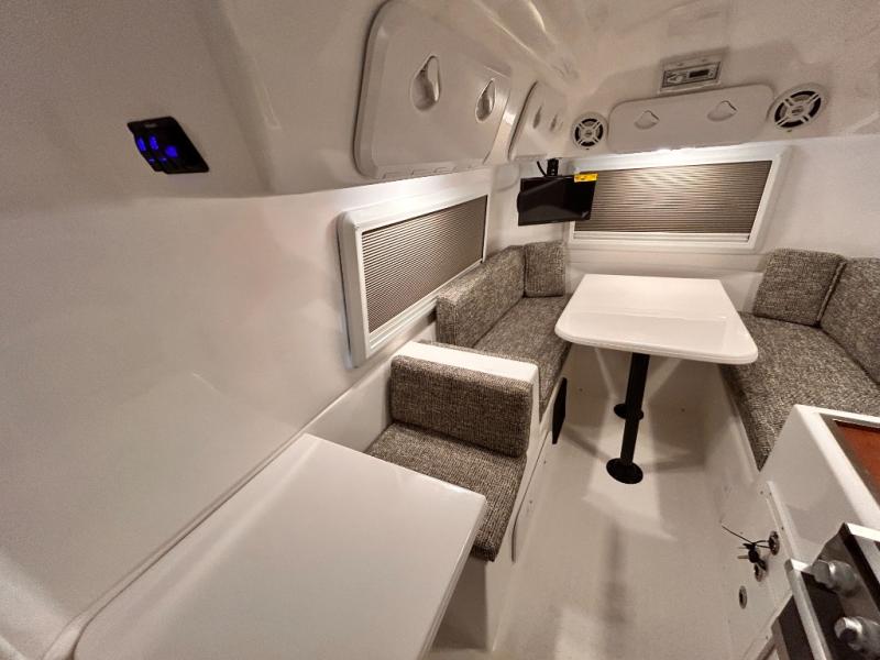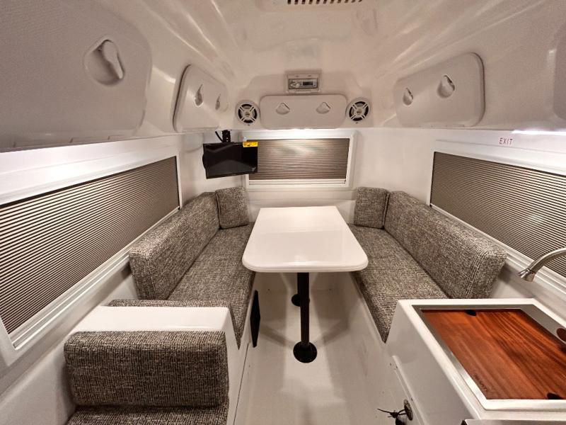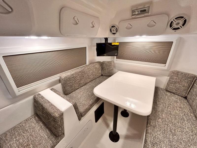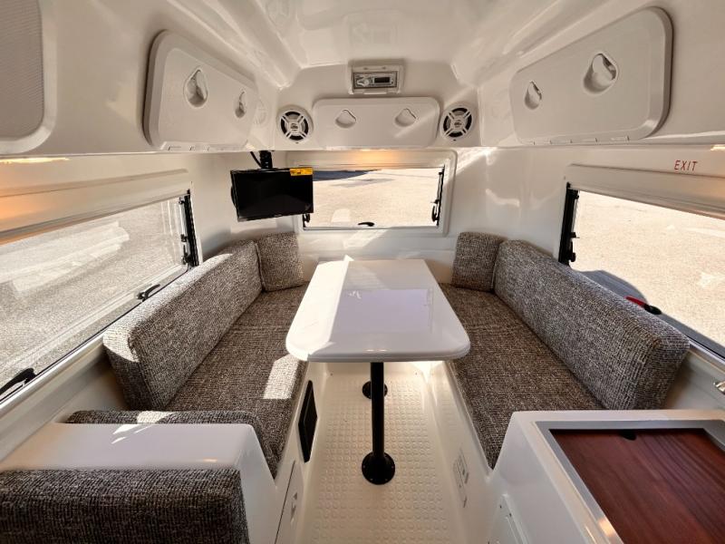 The perfect couples trailer featuring a rear dinette that can easily be converted into a double bed for sleeping. There is a second seat with table that is forward facing off the door side. A wet bath features a shower, toilet, and sink with an exhaust fan to take out the steam, and a enclosed waterproof toilet paper holder. You will enjoy the hand-held multi-setting sprayer when showering. There are also ten ABS marine access storage hatches, plus storage beneath the dinette seat. When relaxing you might want to add the optional 19" Smart LED TV for movie nights!