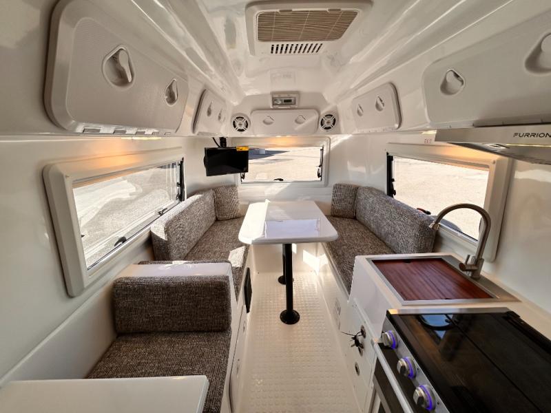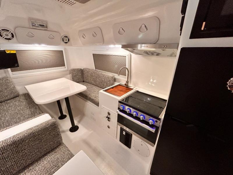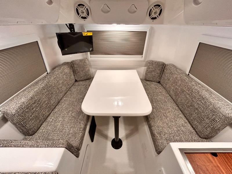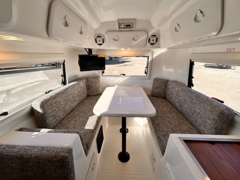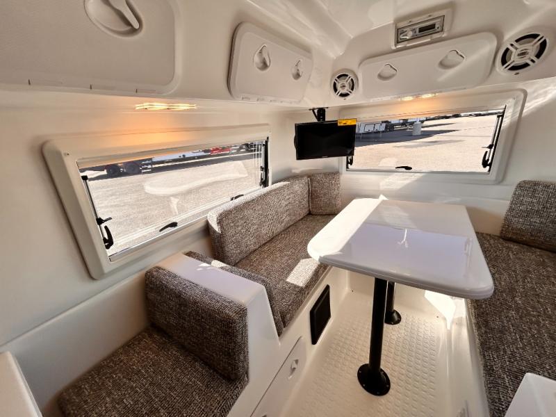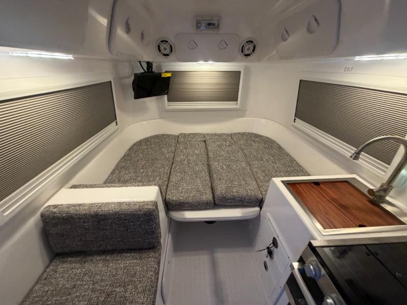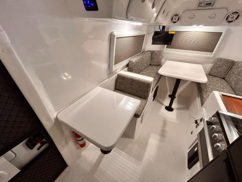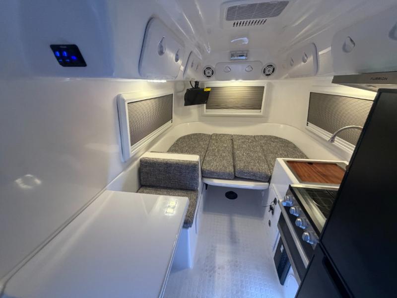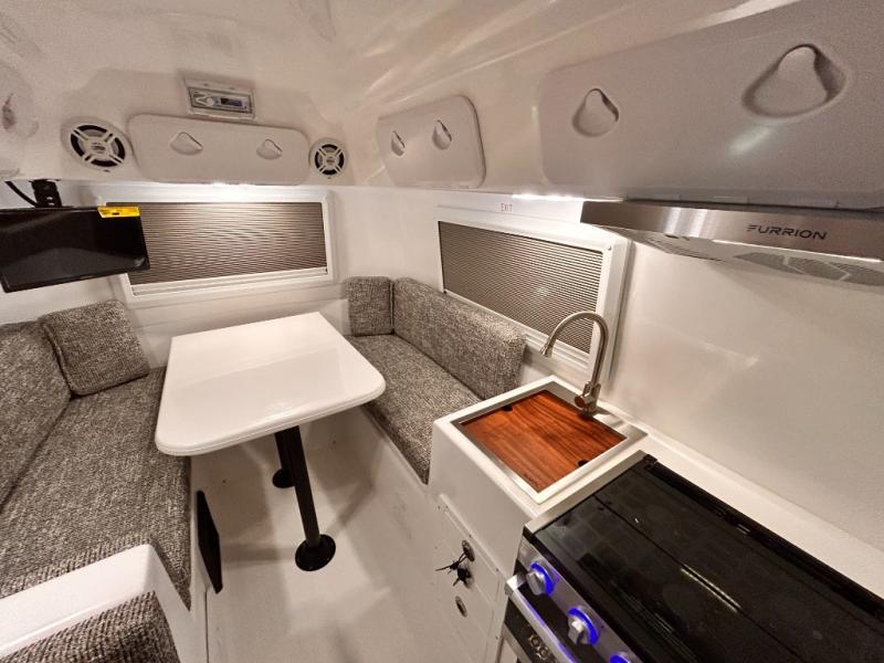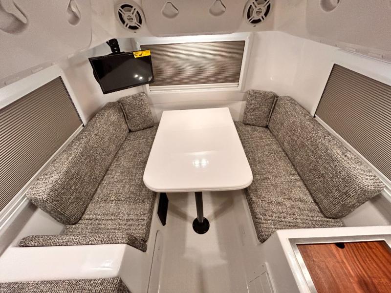 The perfect couples trailer featuring a rear dinette that can easily be converted into a double bed for sleeping. There is a second seat with table that is forward facing off the door side. A wet bath features a shower, toilet, and sink with an exhaust fan to take out the steam, and a enclosed waterproof toilet paper holder. You will enjoy the hand-held multi-setting sprayer when showering. There are also ten ABS marine access storage hatches, plus storage beneath the dinette seat. When relaxing you might want to add the optional 19" Smart LED TV for movie nights!