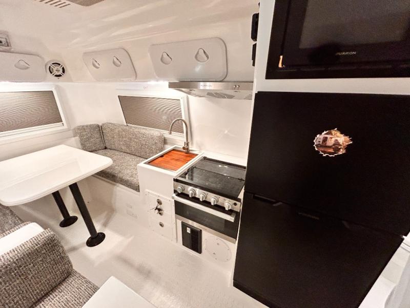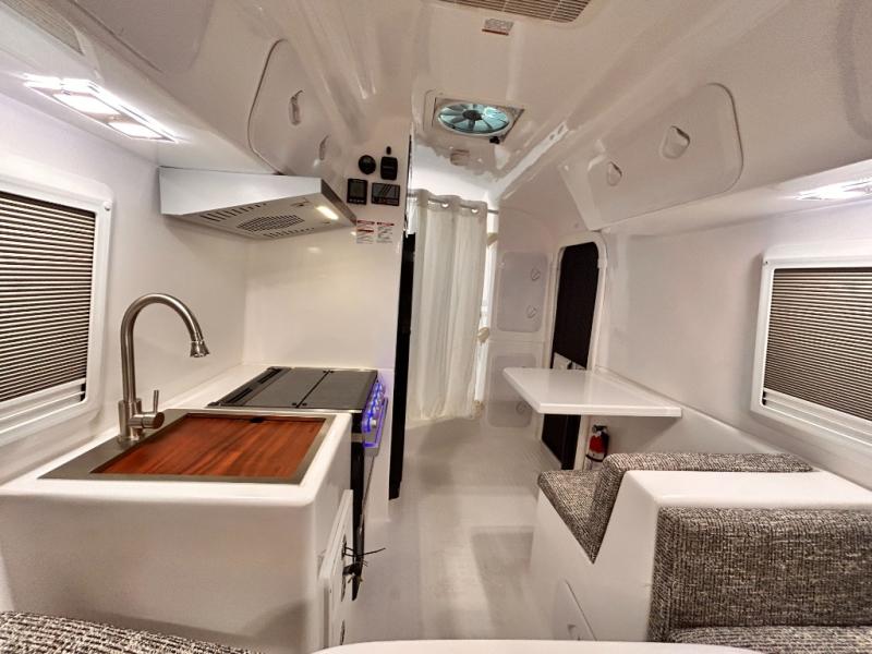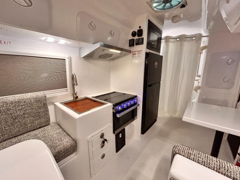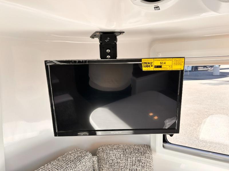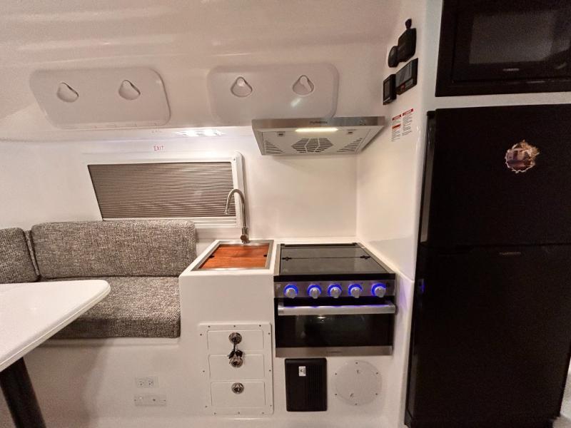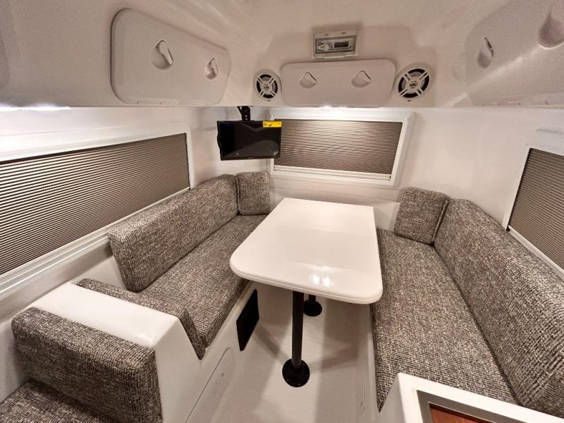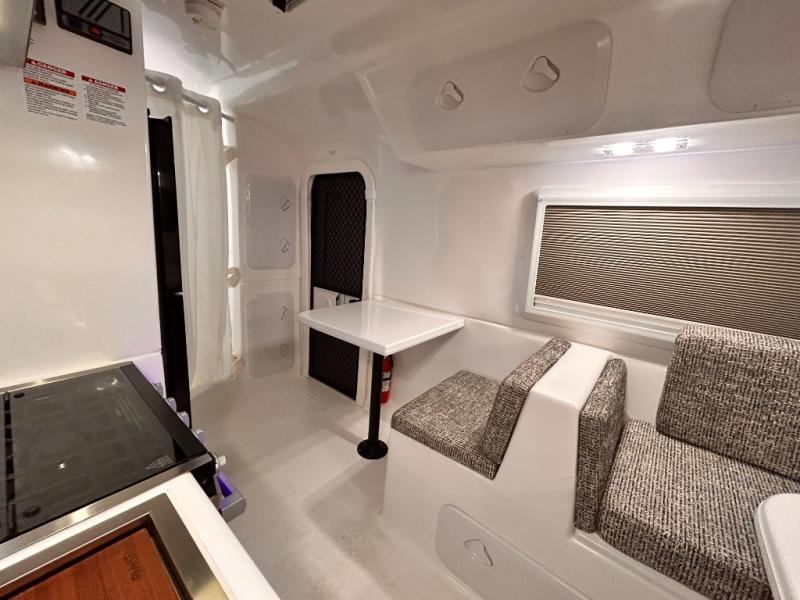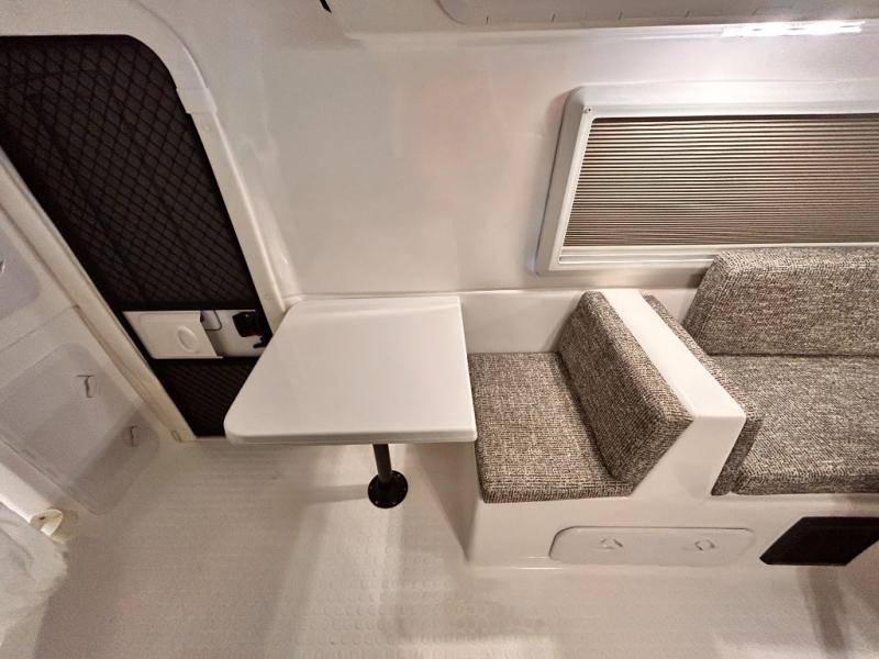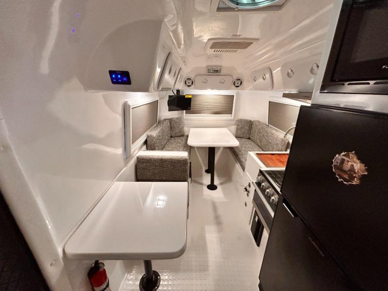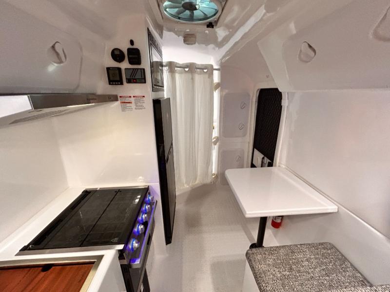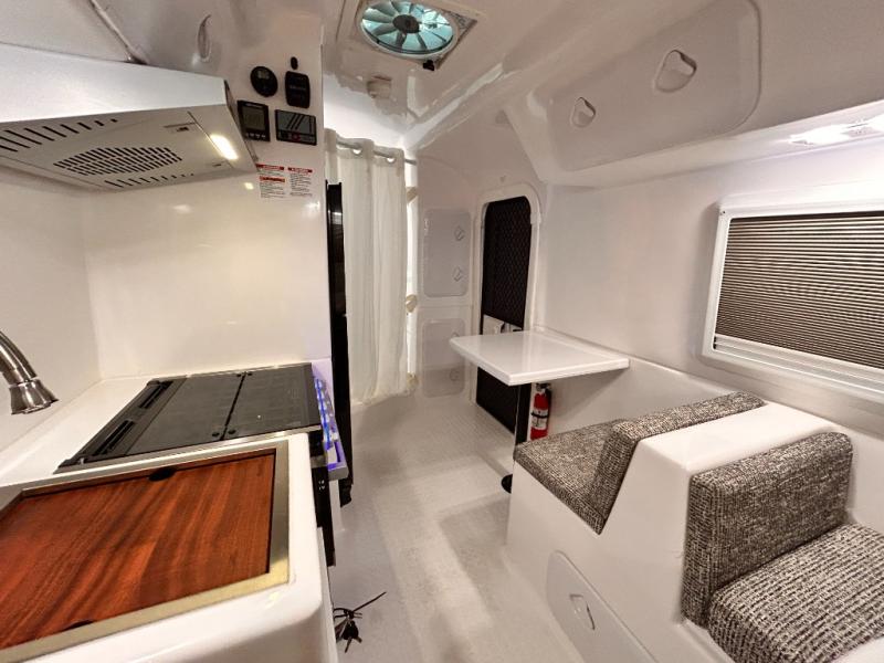 The perfect couples trailer featuring a rear dinette that can easily be converted into a double bed for sleeping. There is a second seat with table that is forward facing off the door side. A wet bath features a shower, toilet, and sink with an exhaust fan to take out the steam, and a enclosed waterproof toilet paper holder. You will enjoy the hand-held multi-setting sprayer when showering. There are also ten ABS marine access storage hatches, plus storage beneath the dinette seat. When relaxing you might want to add the optional 19" Smart LED TV for movie nights!