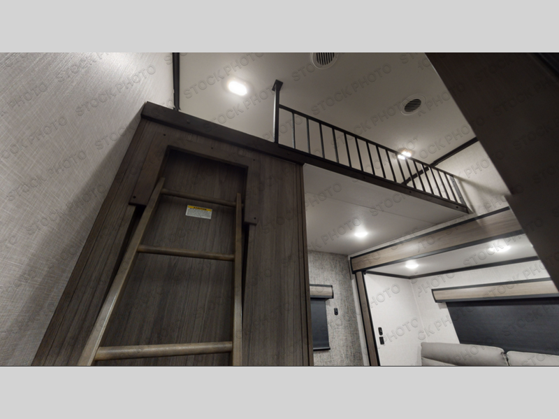 With dual entry doors, everyone can easily access this fifth wheel! One of the entrances leads directly into the half bathroom attached to the rear bedroom which has a tri-fold sofa slide and wardrobe below a 54" x 74" loft bunk mat. The chef can prepare their best home cooked meals either indoors with the Furrion kitchen collection and the kitchen island or at the outside kitchen with a refrigerator and griddle. Enjoy your meals together at the dinette with two chairs on one side and bench seating on the other side. The dual entry bathroom has a 48" shower with a seat to freshen up in each morning and a dual sink vanity for two to get ready at once, plus it enters into the front private bedroom. You will feel right at home in the bedroom with the king bed slide across from the dresser with a fireplace and 39" TV, and the front closet with a shoe shelf and an area prepped to add an optional washer and dryer!