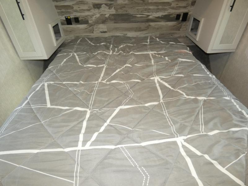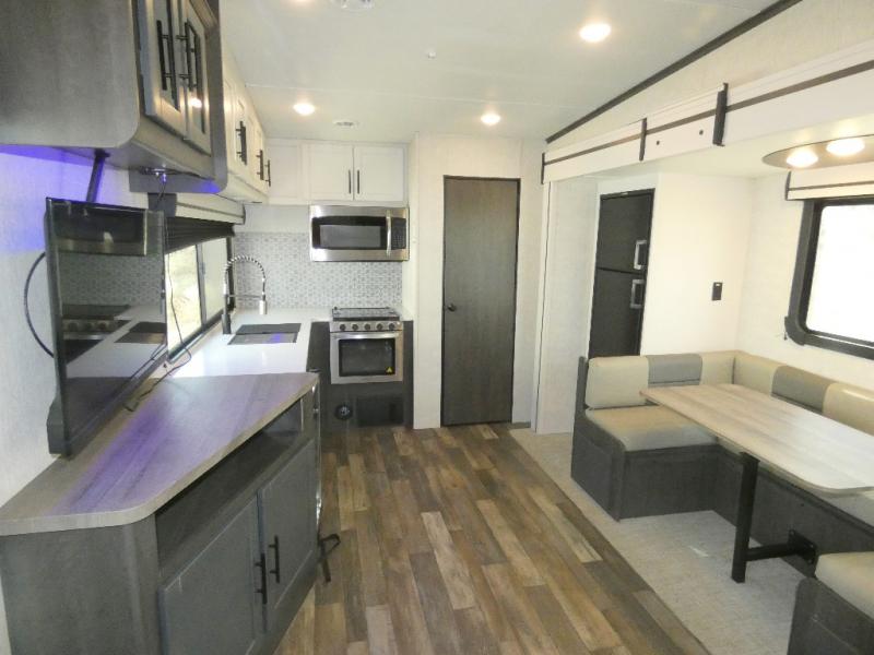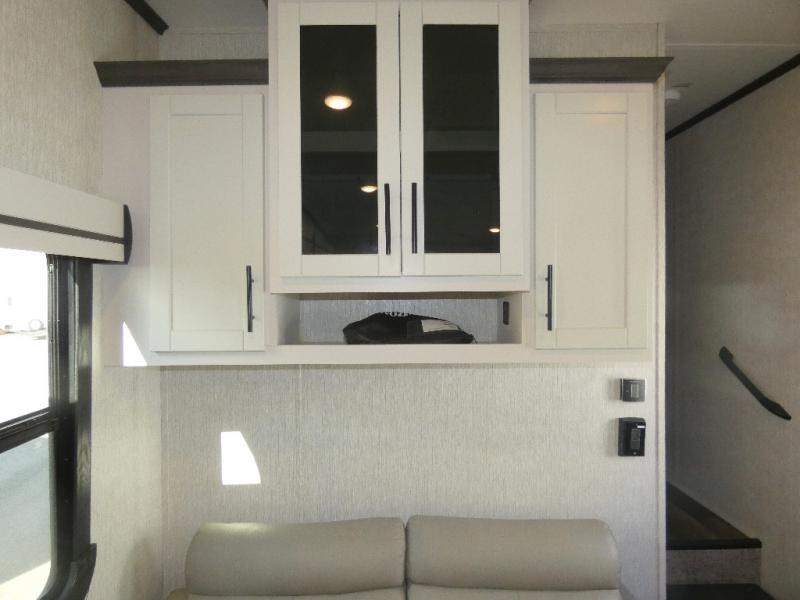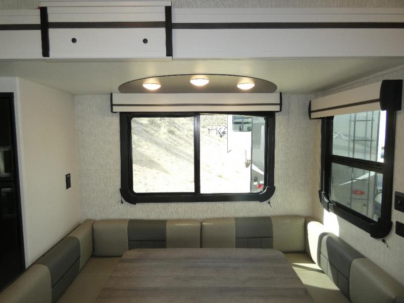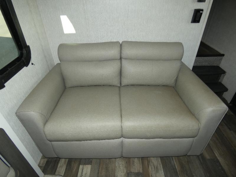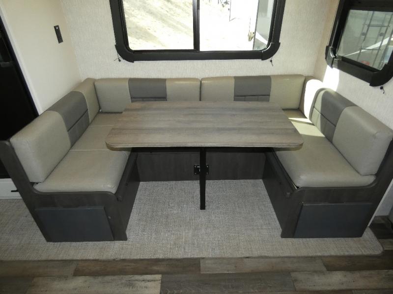 A spacious rear kitchen, plus an outdoor kitchen make this a fun fifth wheel to take to the campground. Make a cold drink from the wine fridge once you arrive at your destination, then head outside to relax under the power awning with LED lights. If the weather isn't coopering, you will find comfortable seating space inside on the tri-fold sofa and the U-Dinette. You will appreciate the front private bedroom with a bed, dual nightstands, and a wardrobe for your clothes!